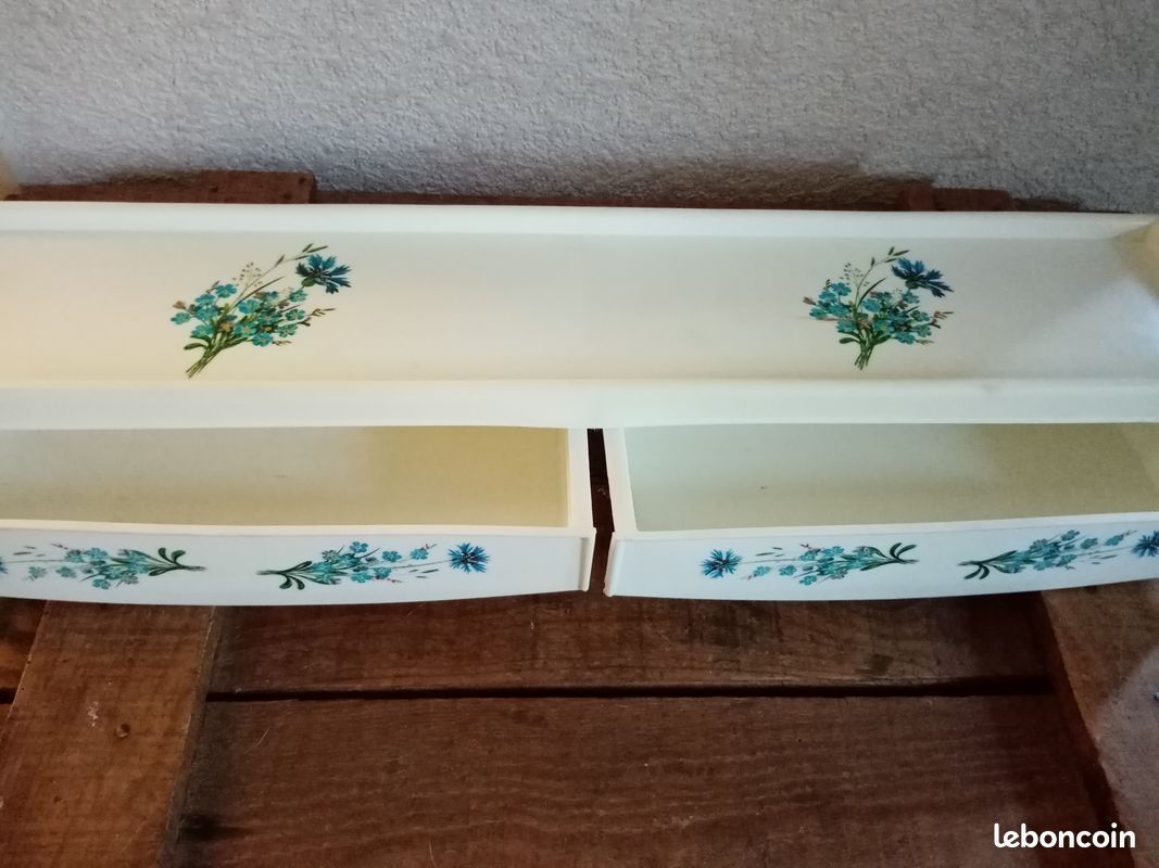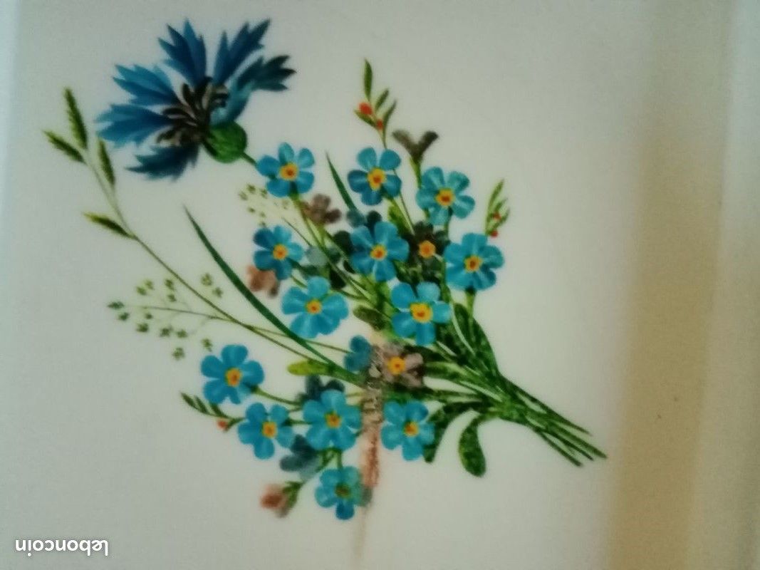 bonétat dans l'ensemble mais peut conporté des petites traces d'utilisation . ( voir une rayure sur la tablette visible sur la derniere photo ). motif fleures bleuet miosotis .