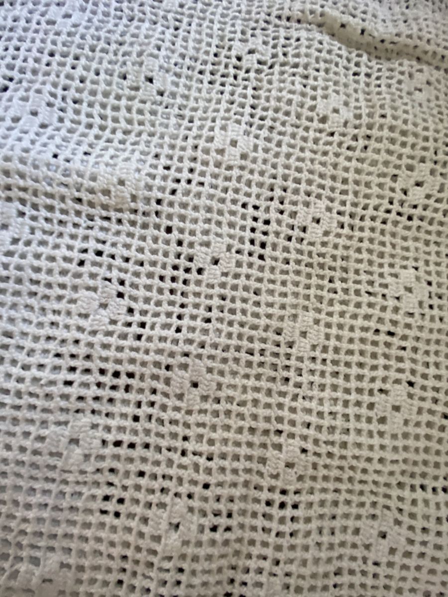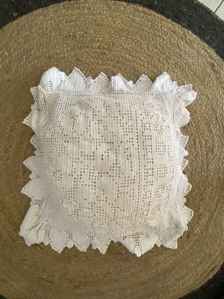Style bohème pour cette housse de coussin entièrement faite à la main au crochet blanc perlé.Le motif central représente une corbeille de fleurs, la bordure une suite de cœurs.Elle est aussi jolie à l envers comme à l endroit.