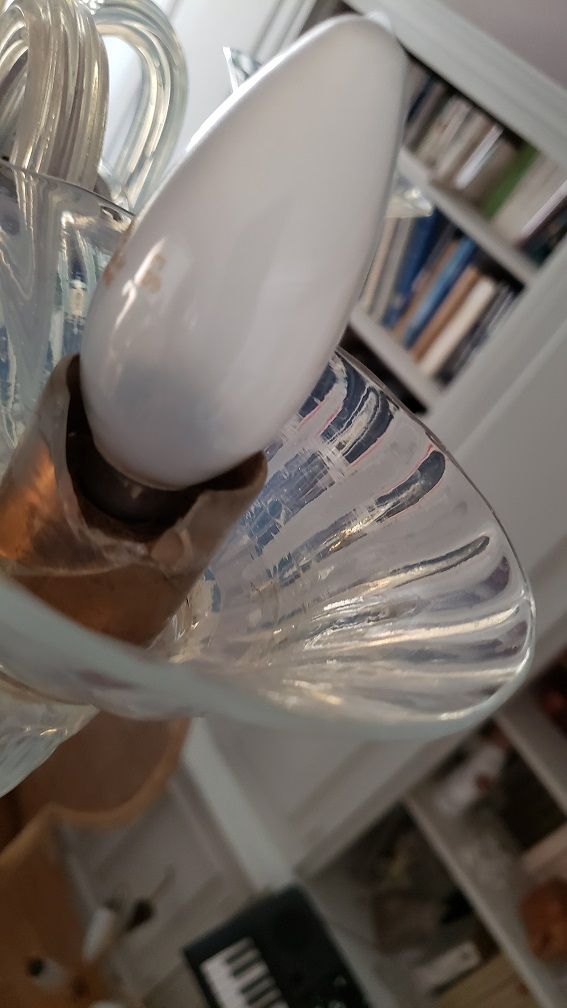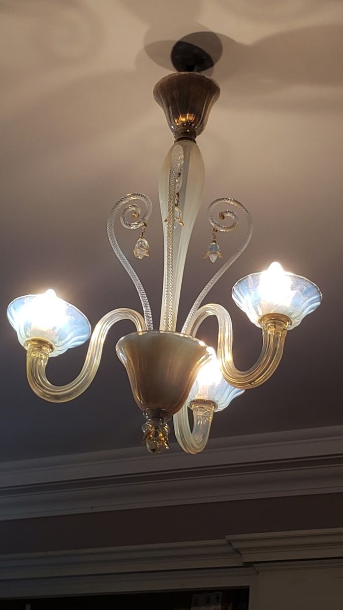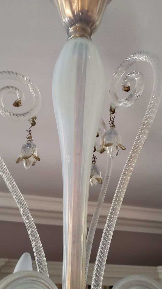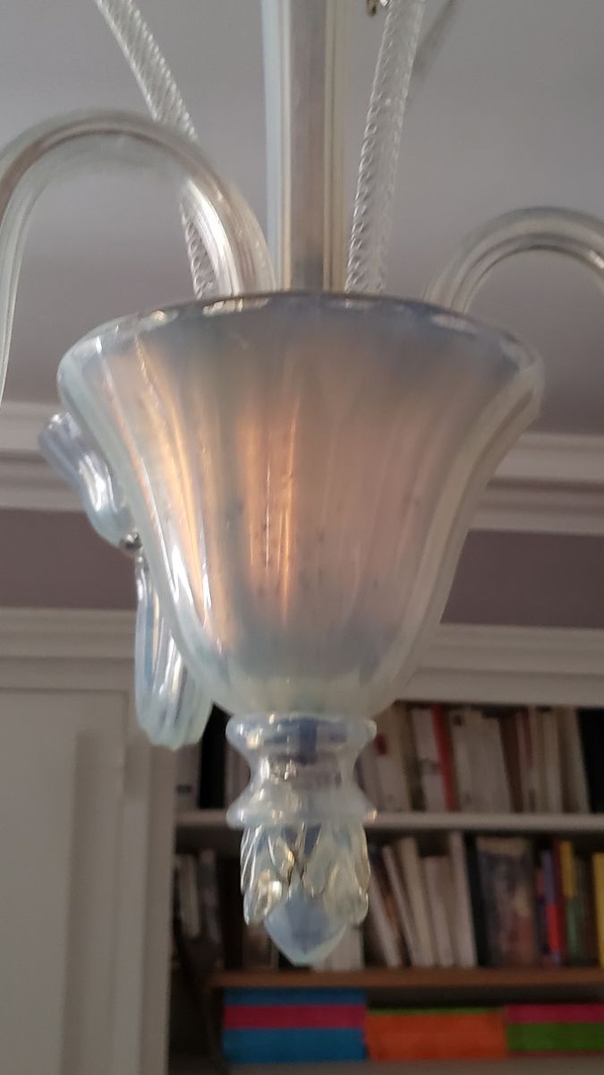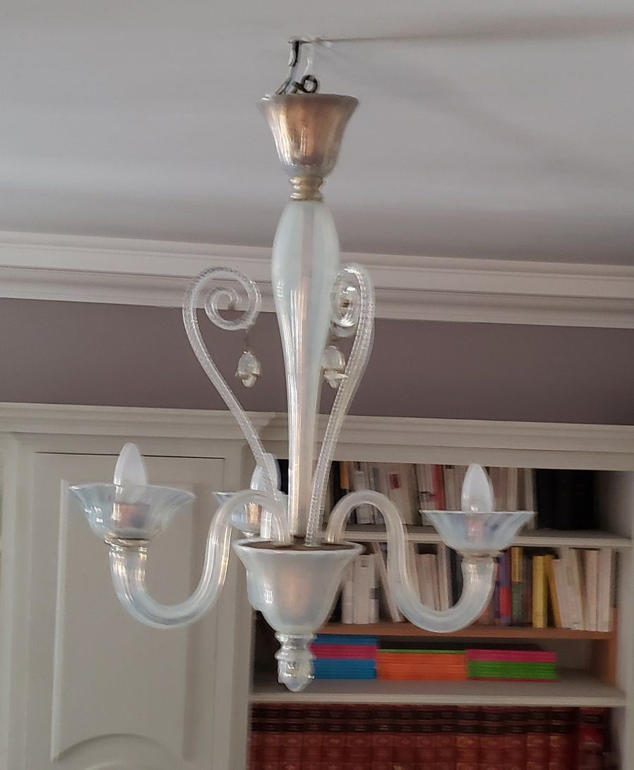 Lustre MURANO, en verre laiteux opalescent à 3 lumières et décor de volutes. Accident à une des douilles non visible monté. H 68 cm Diam 50 cm