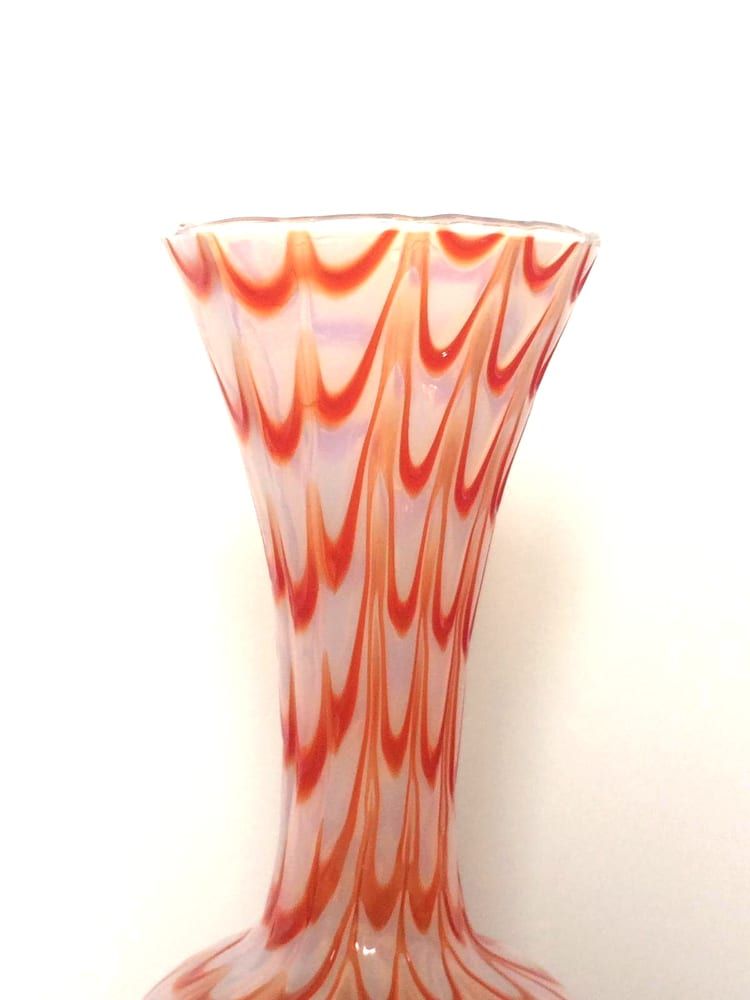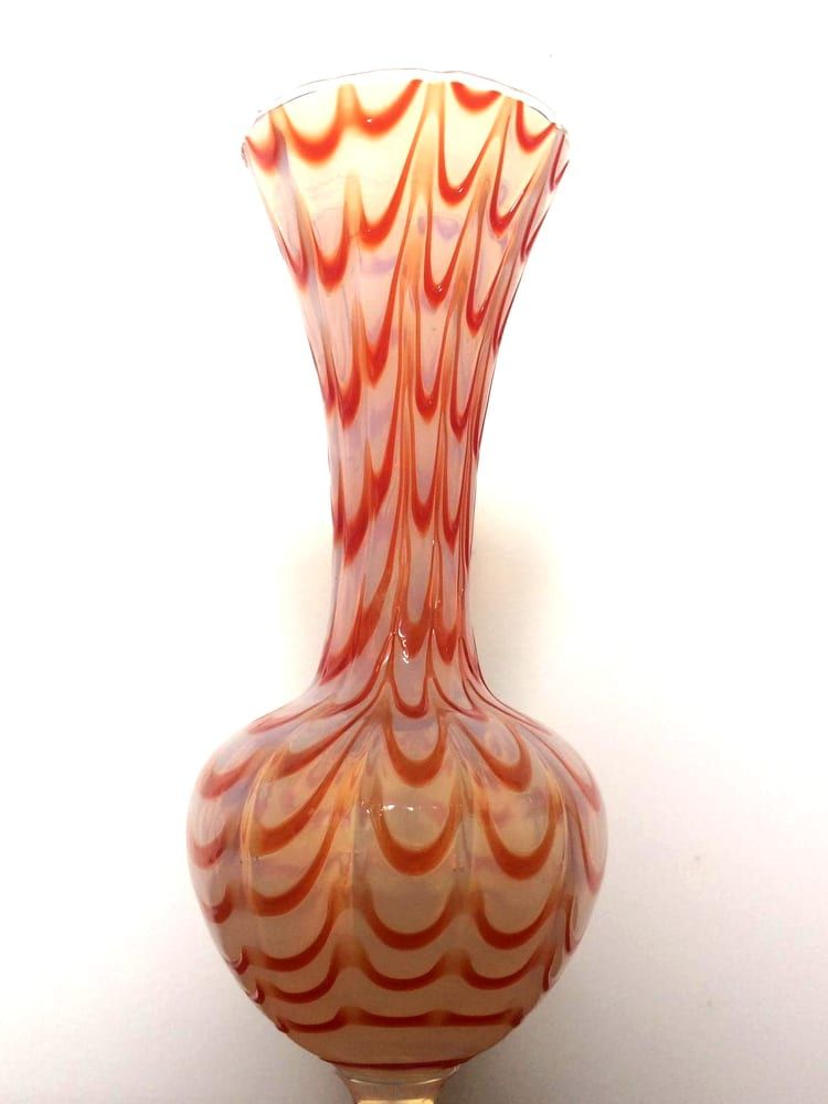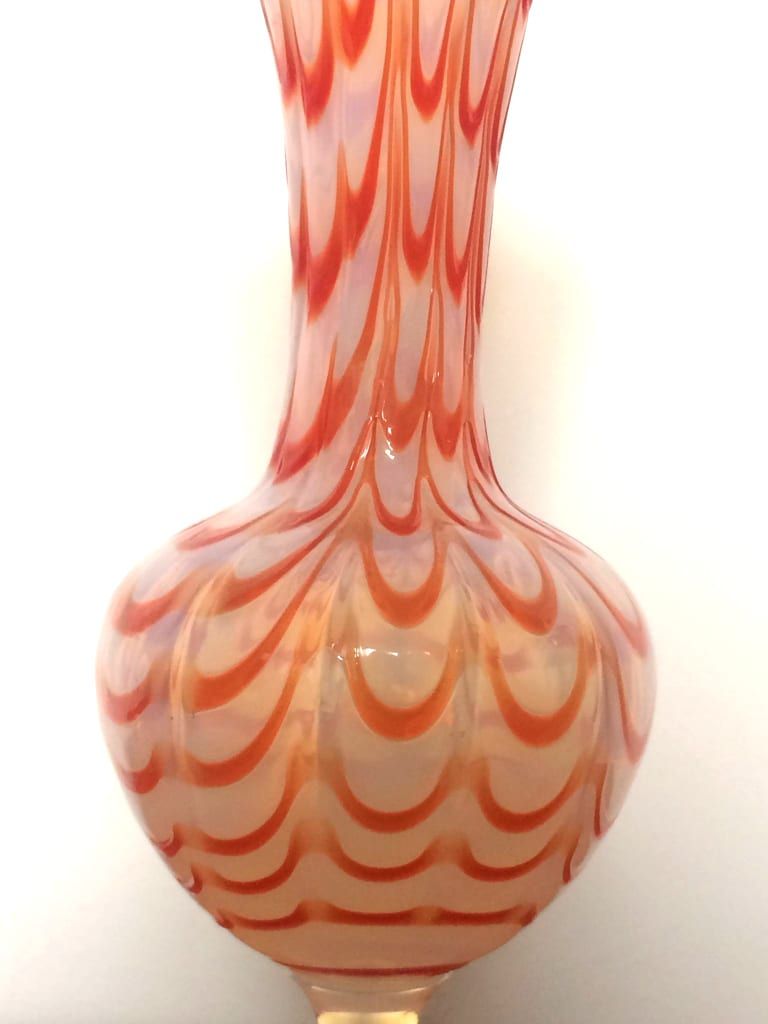 Soliflore sur un pied rond, à long col à décor de vagues oranges sur une opaline légèrement bleuté, en relief.
