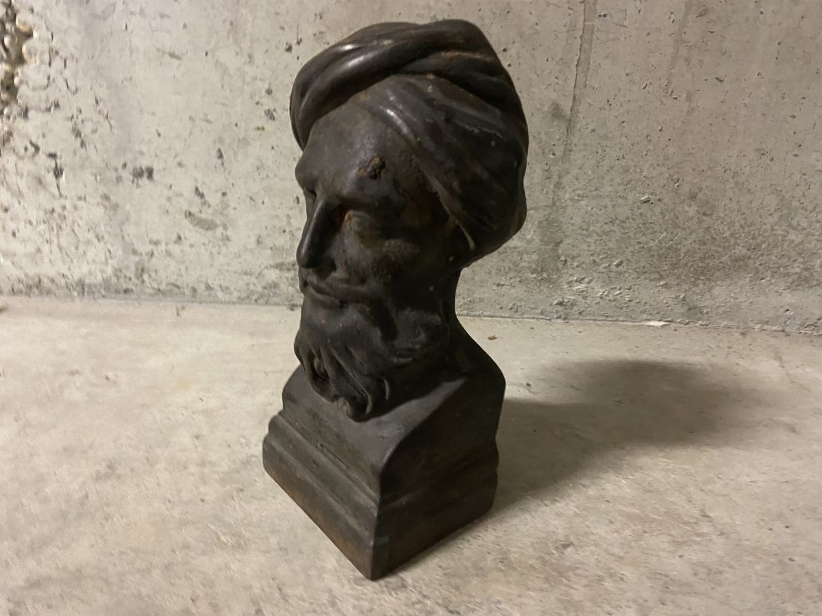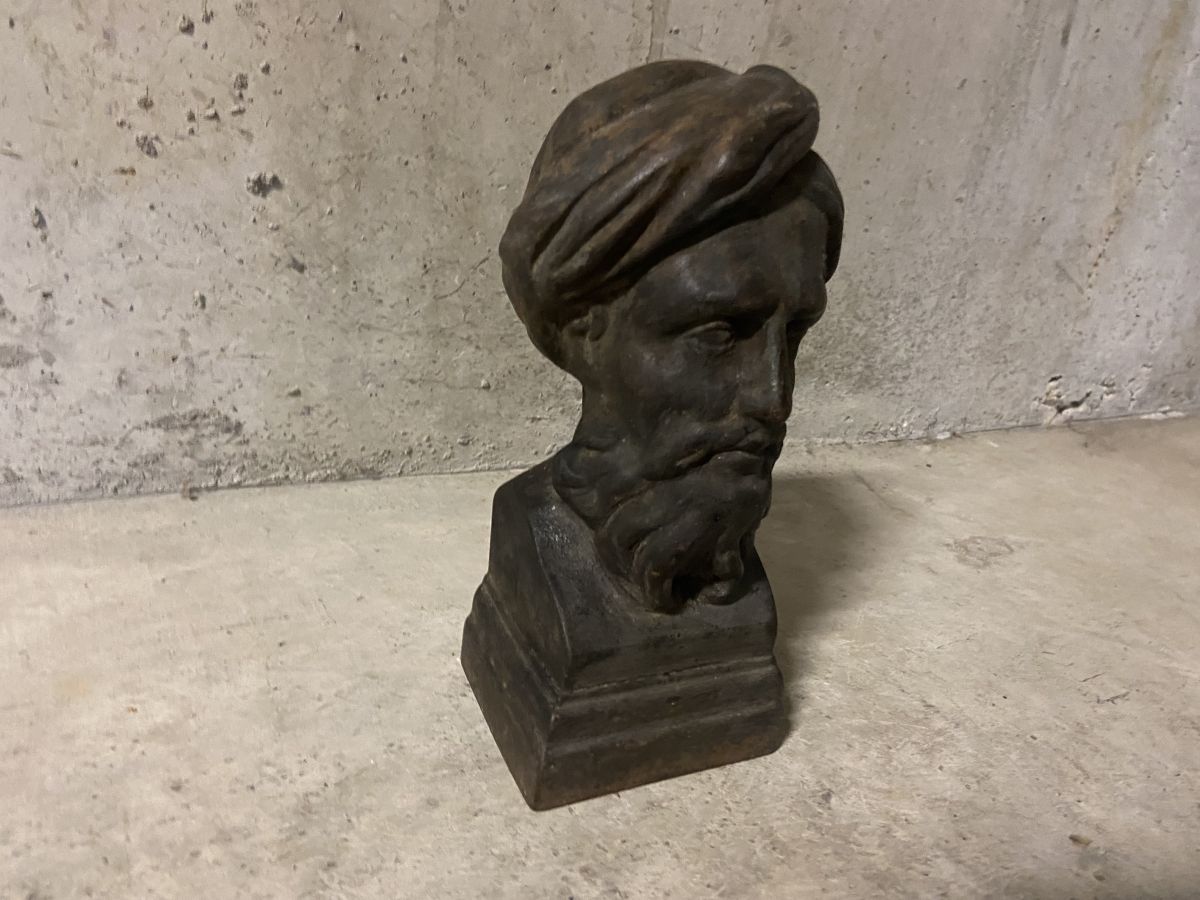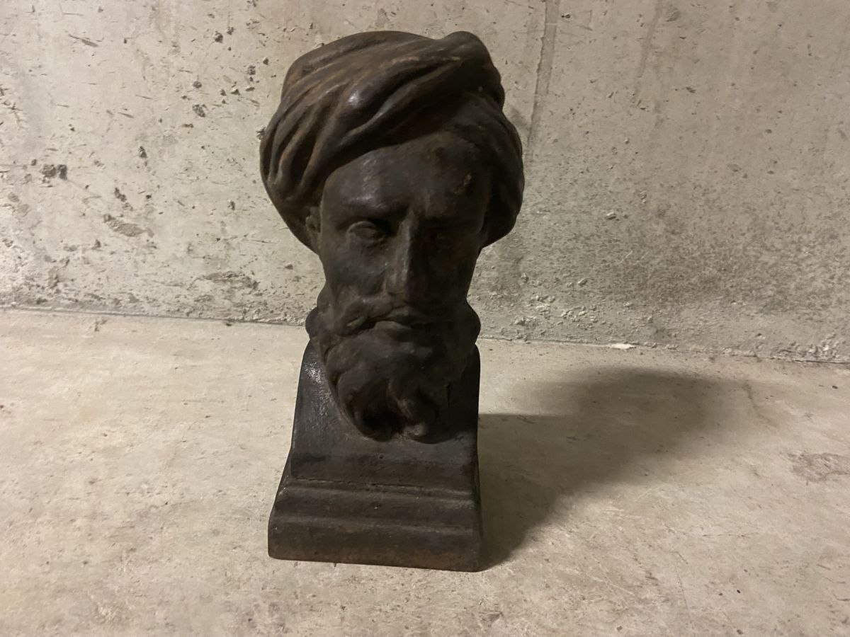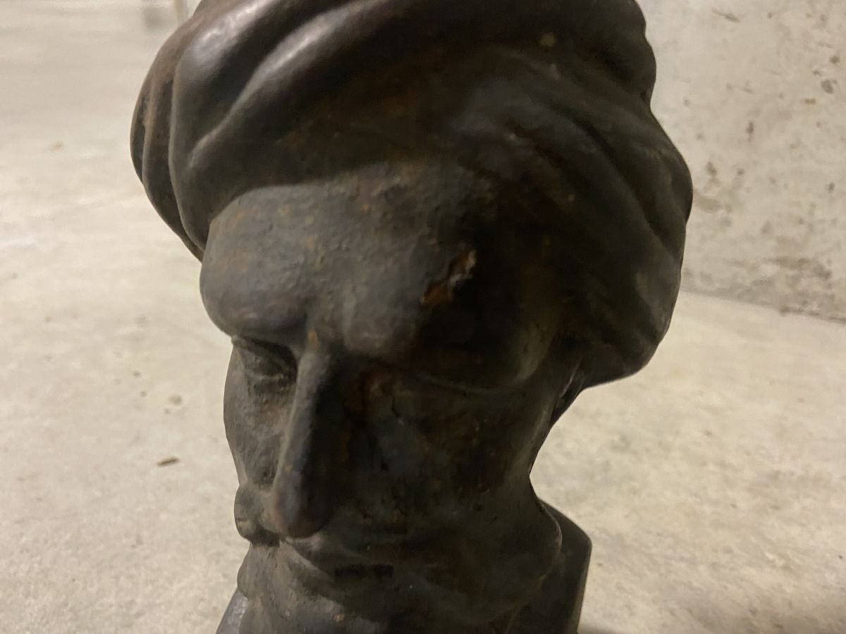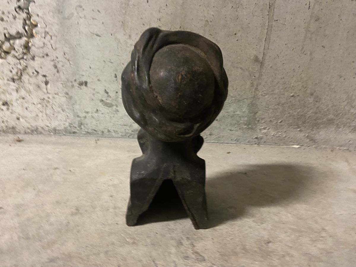 Chenet en forme de tête de touareg sculptée en fonte, utilisé comme sculpture décorative, quelques traces d’usage (voir photos), dimensions (cm) : L.10xH.24xP.10, bon état général