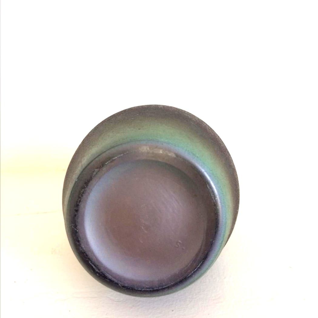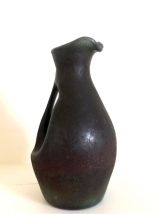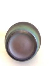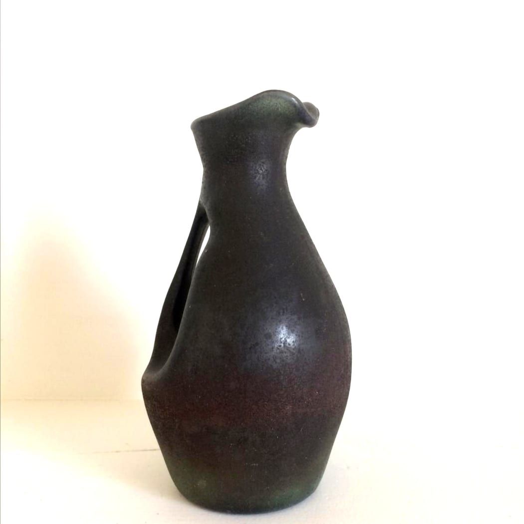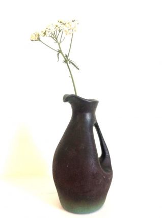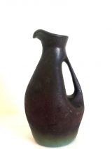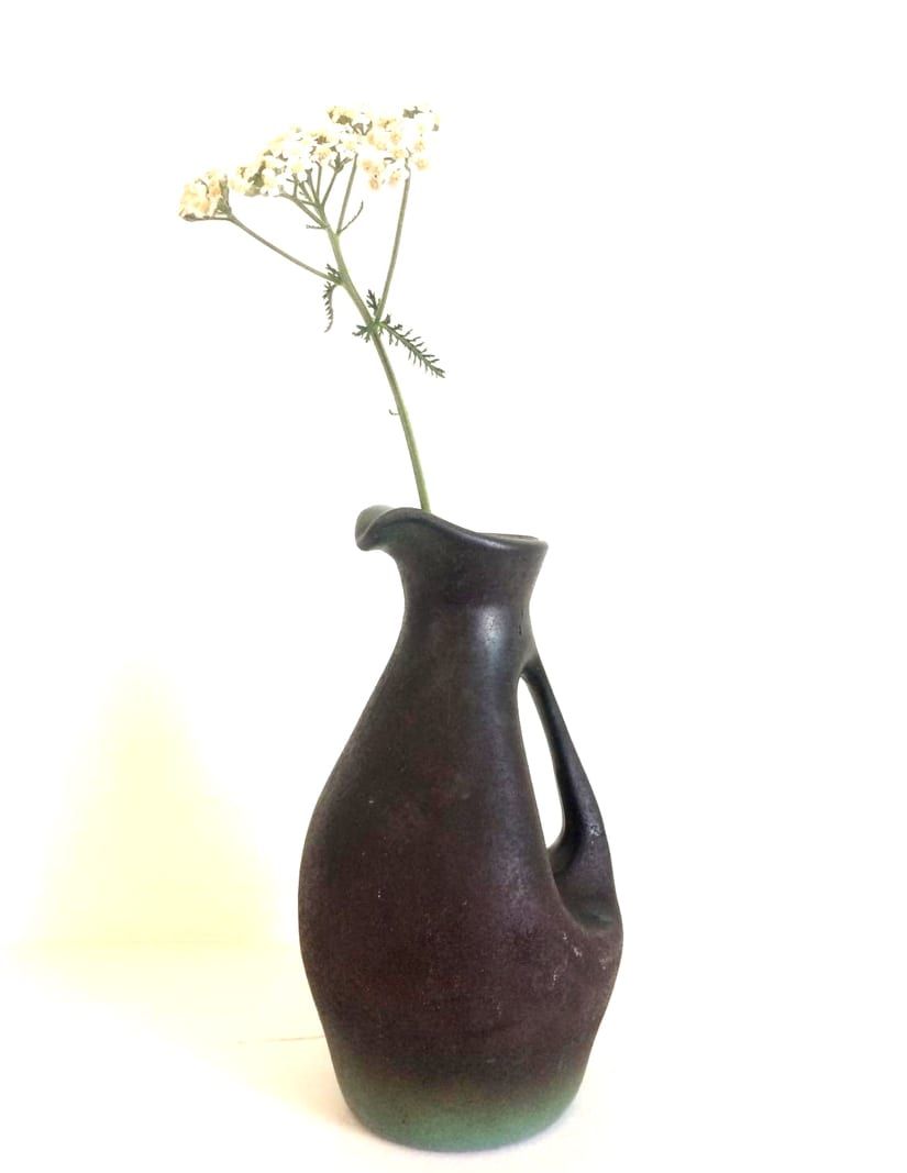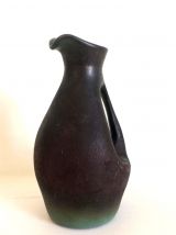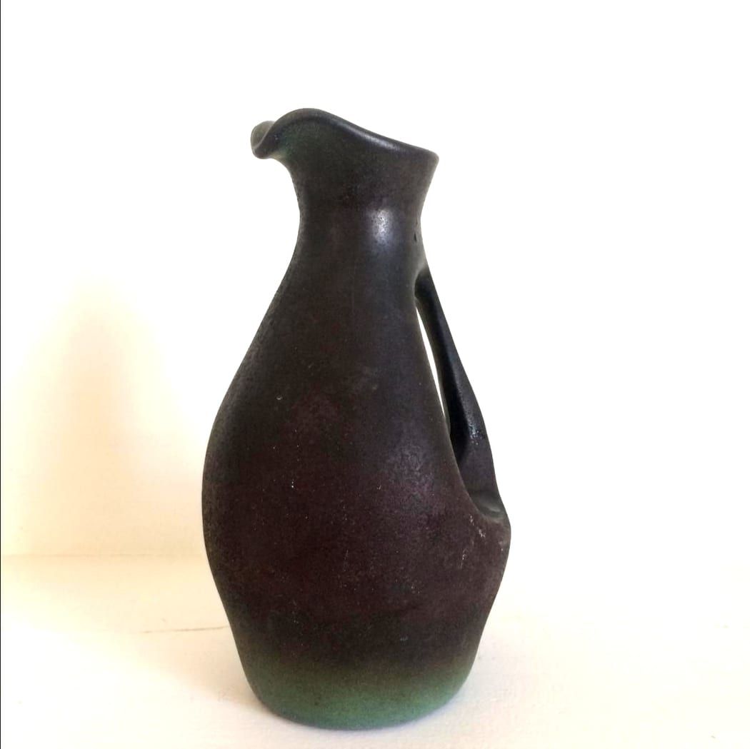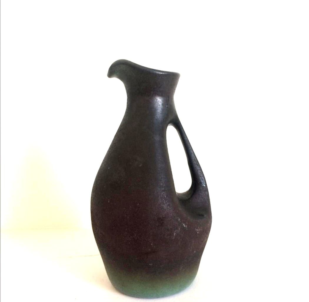 Vase à la ligne moderniste, en verre mat reprenant la technique des vases et amphores antiques grecs ou étrusques: un verre matifié pour conserver les liquides à l'abri de la lumière. Corps matifié noir et vert sur le pied et le bec.