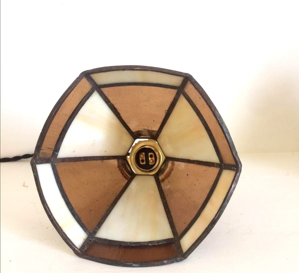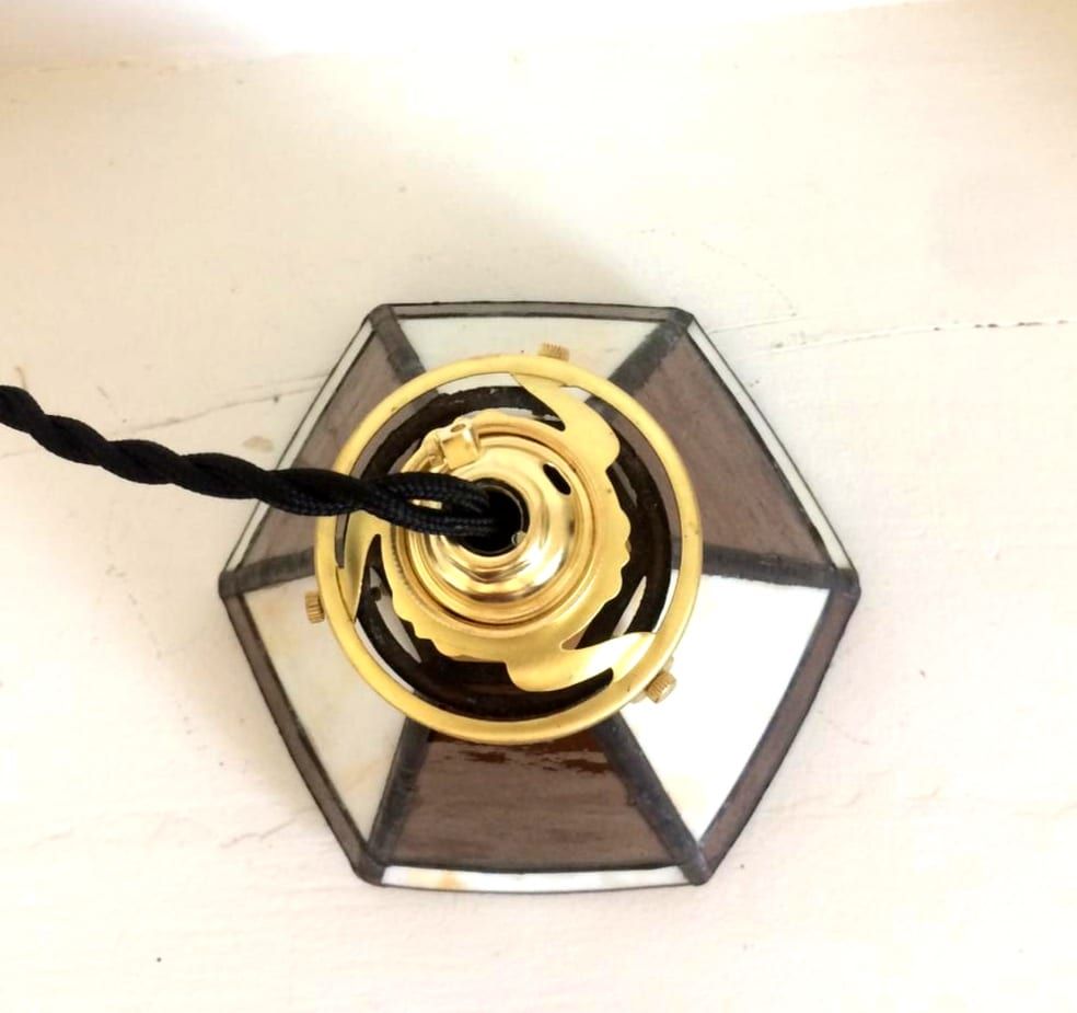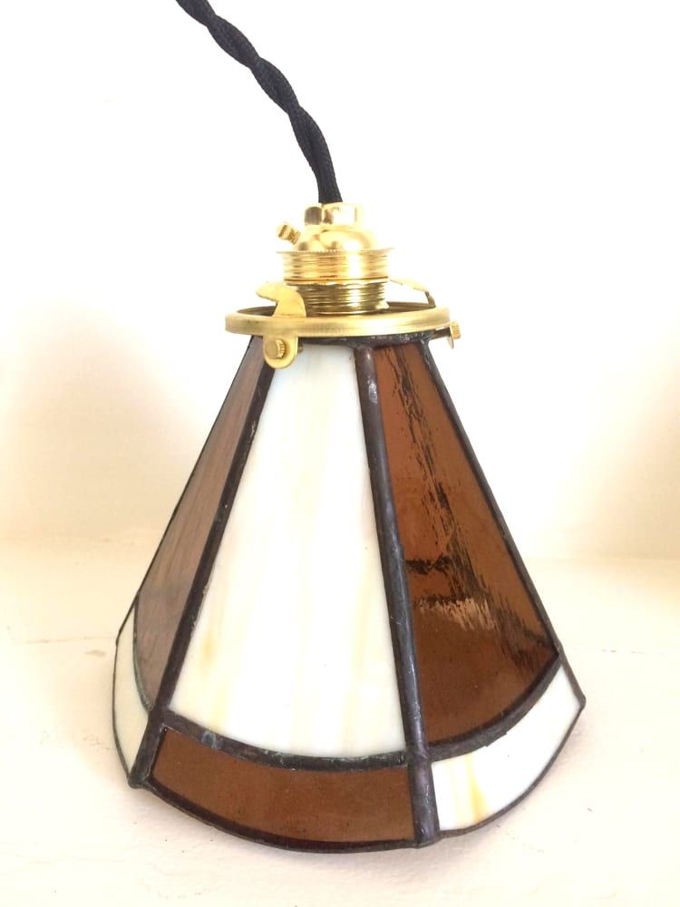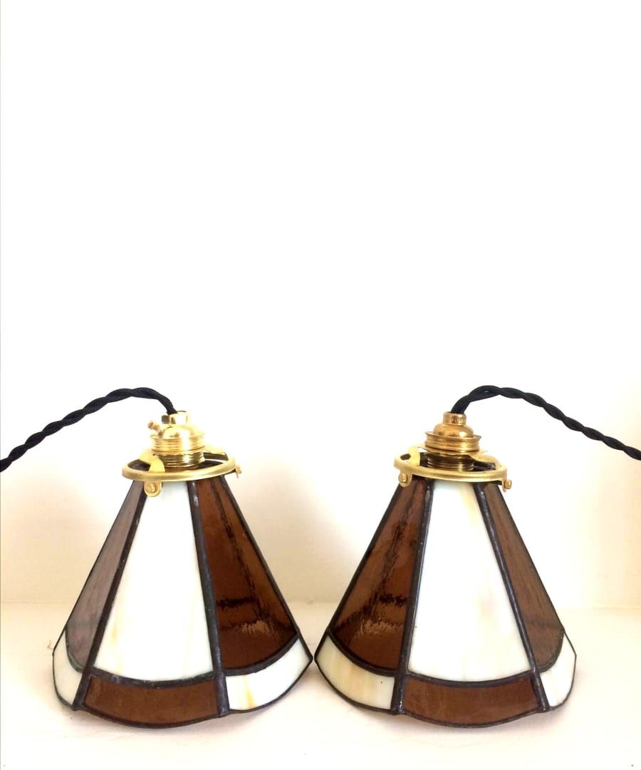 Baladeuses composées de deux tulipes en pâte de verre colorée vitrail : blanc nacre et marron translucide. Montage avec une griffe d'abat-jour et une douille à baïonnette en laiton doré. Fil torsadé en tissu noir. Ces trois pièces étant neuves et donc en parfait état de fonctionnement.