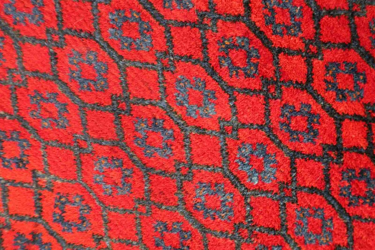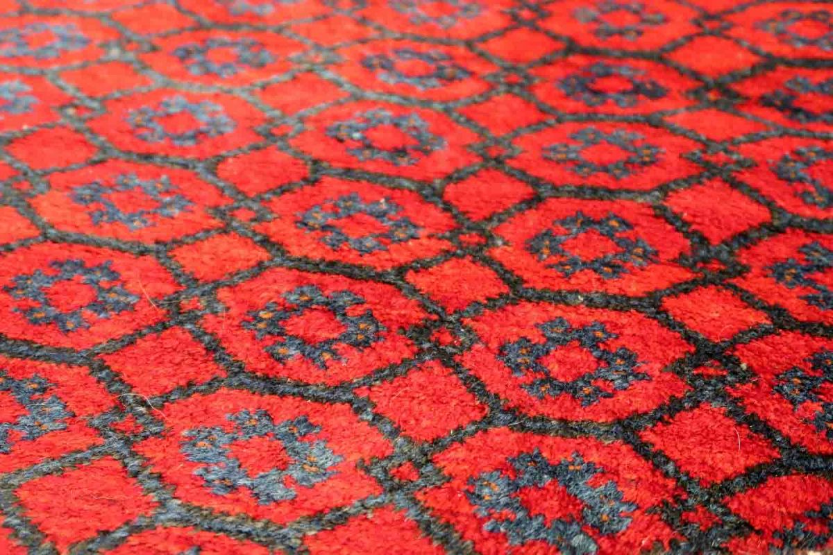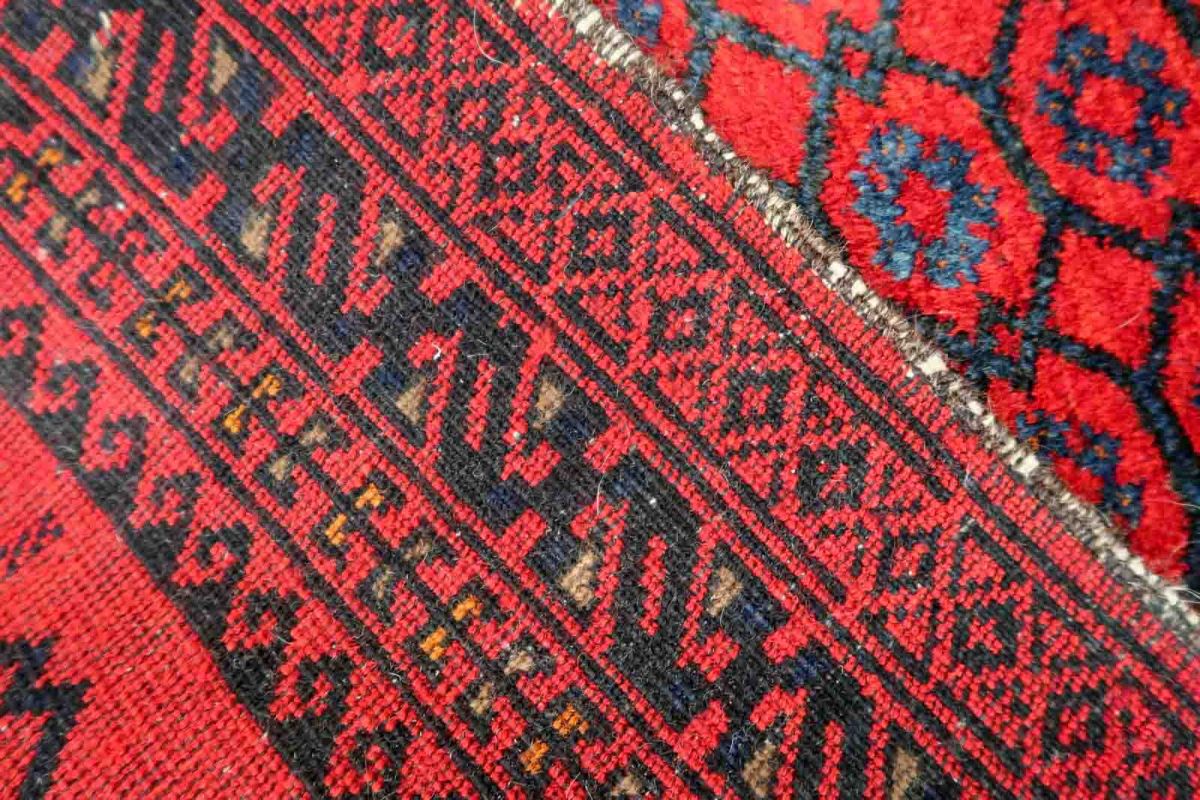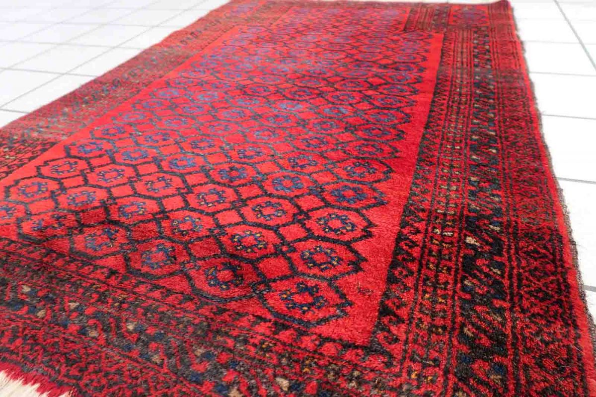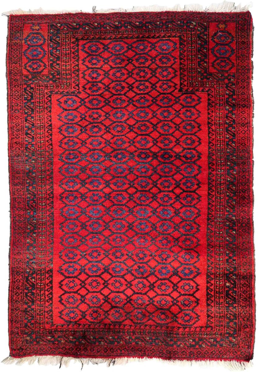Handmade vintage Afghan Baluch rug in red color and prayer design. The rug has been made in wool in the middle of 20th century. It is in original good condition.