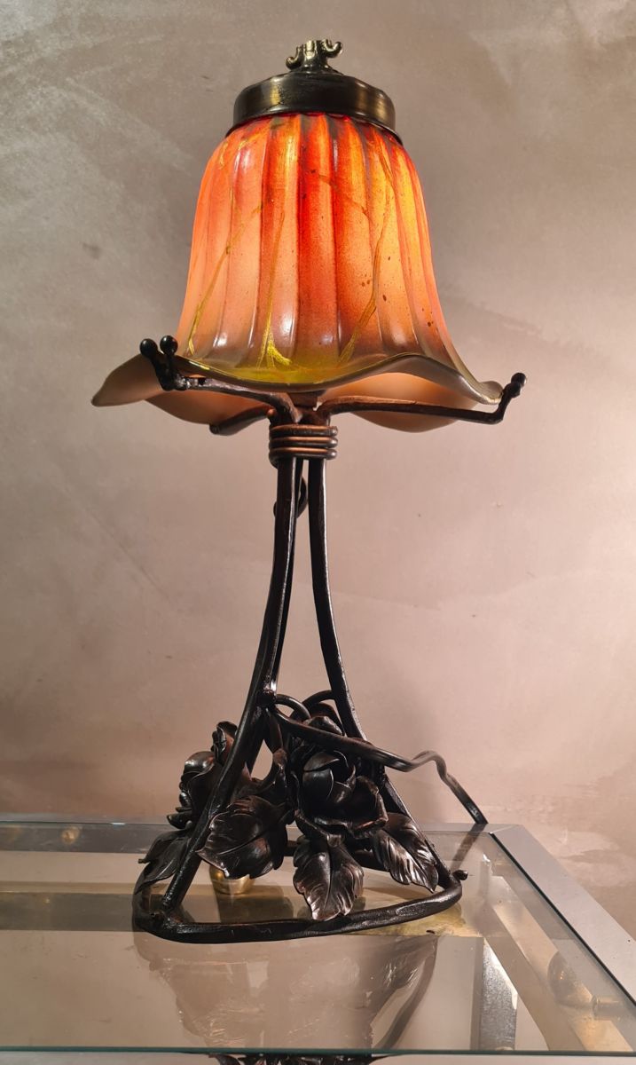 lampe fer forgé 1930 jolie travail et tulipe verre