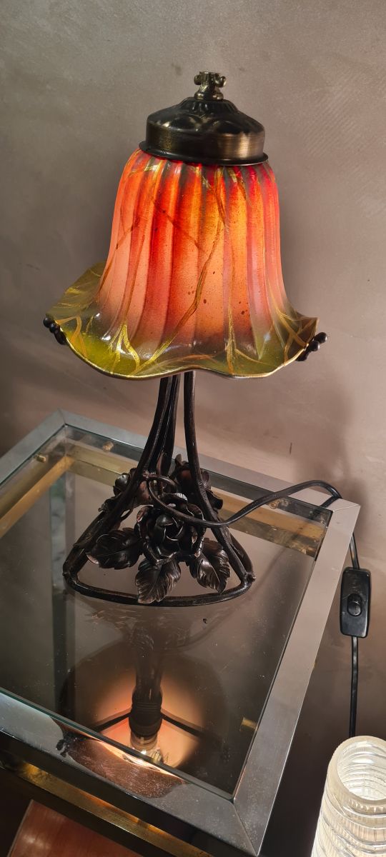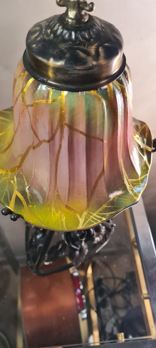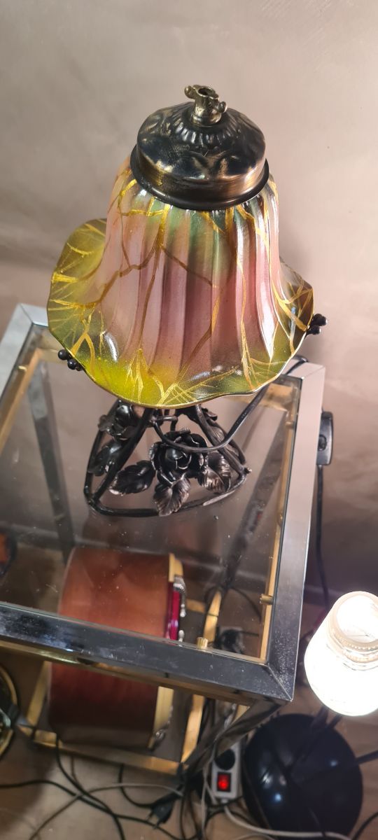 lampe fer forgé 1930 jolie travail et tulipe verre peint