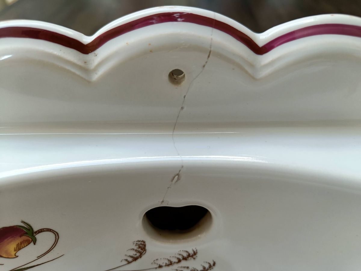 Il est en bon état. Seul défaut (cf photo) : légère fissure superficielle sur la faïence.
