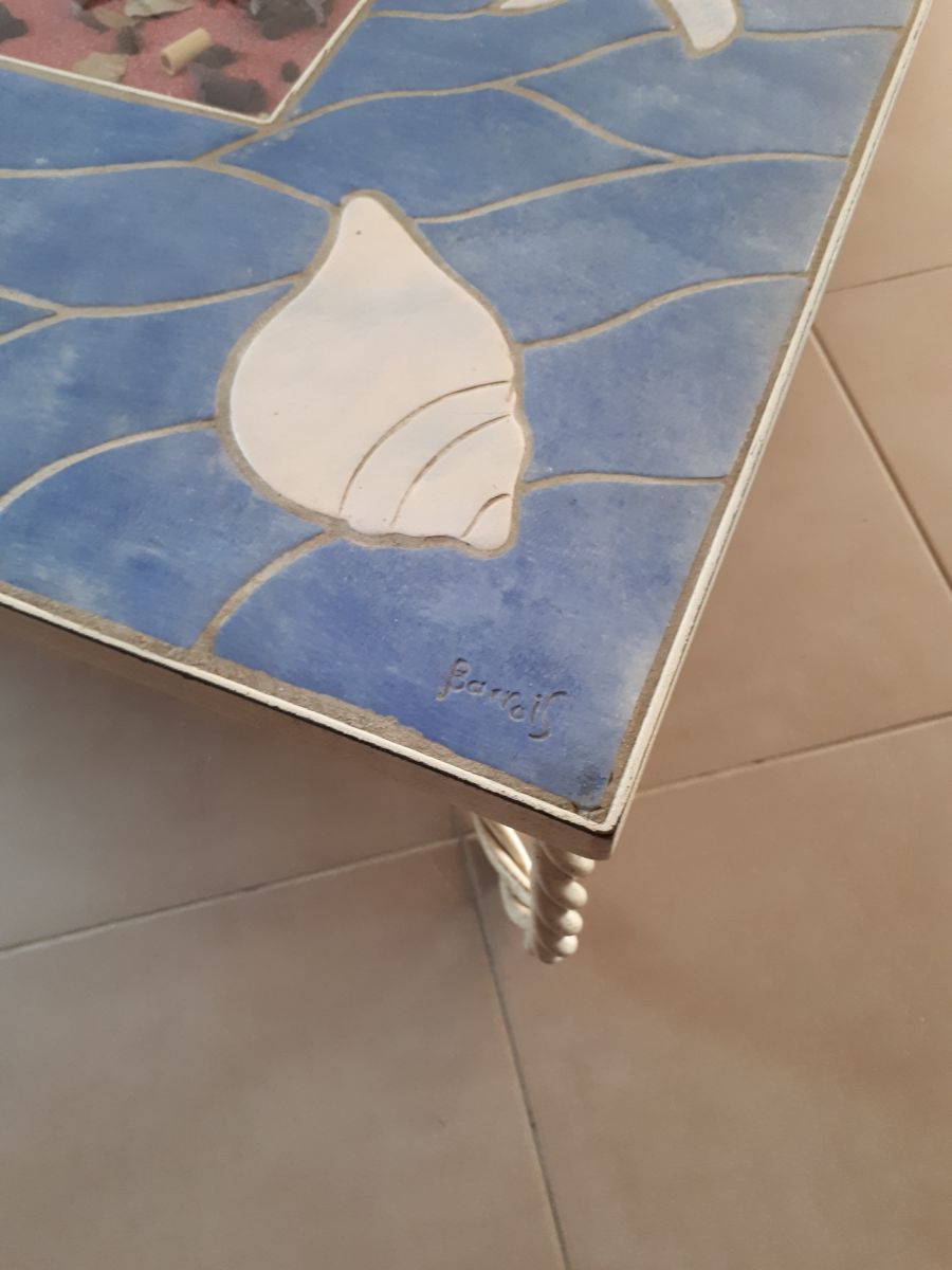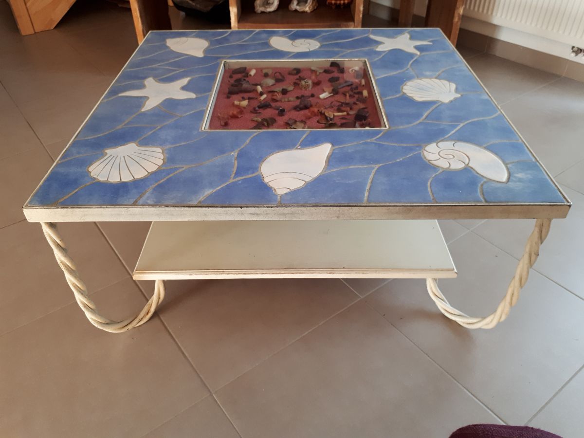 Plateau supérieur : carreaux en céramique bleu et espace vitré au centre, personnalisable (à l'origine du sable et blanc et des coquillages),