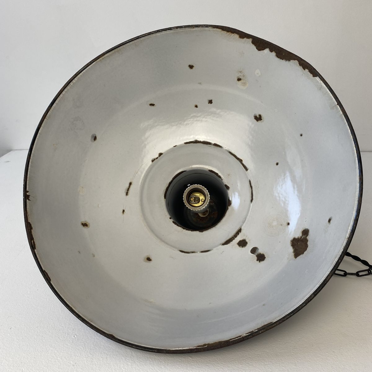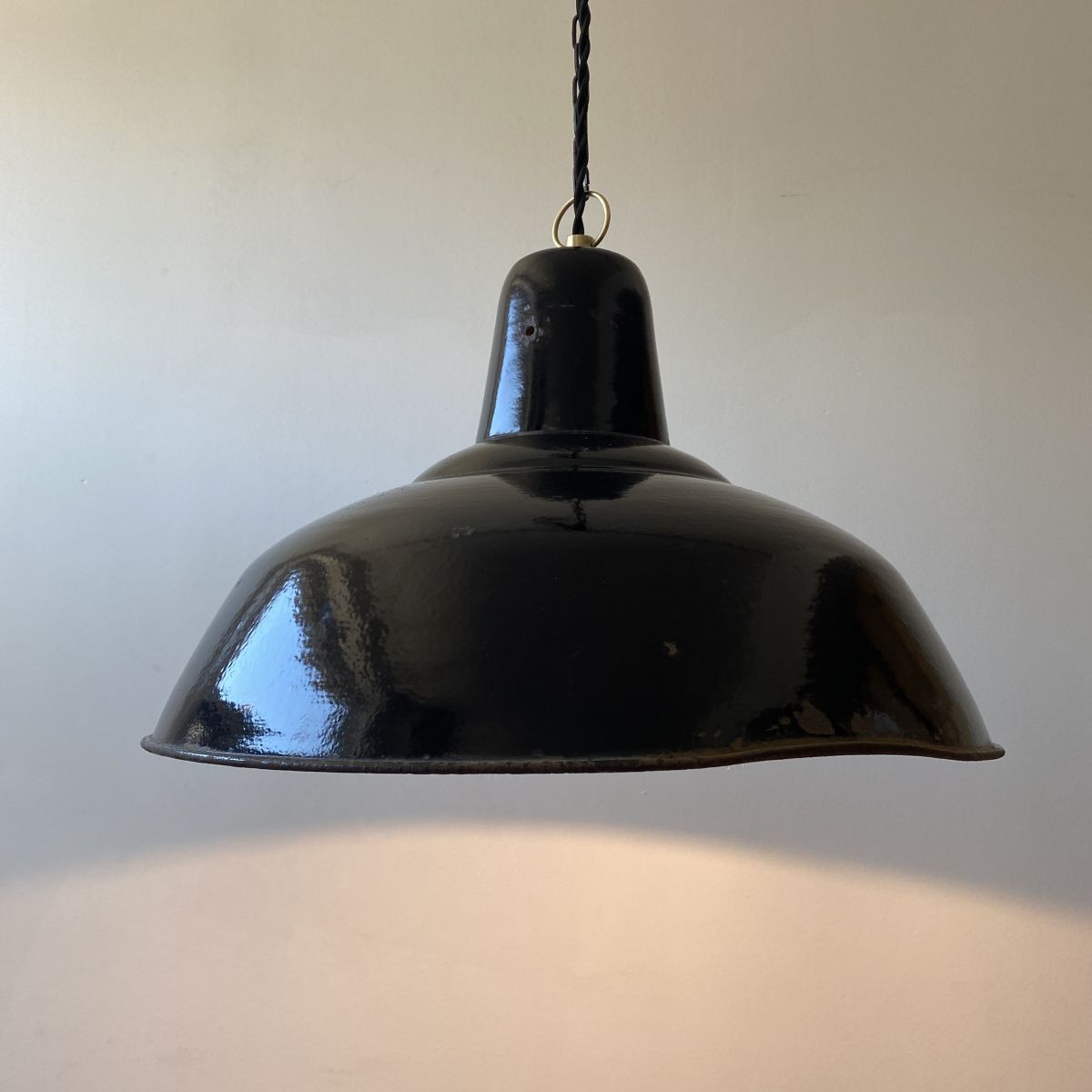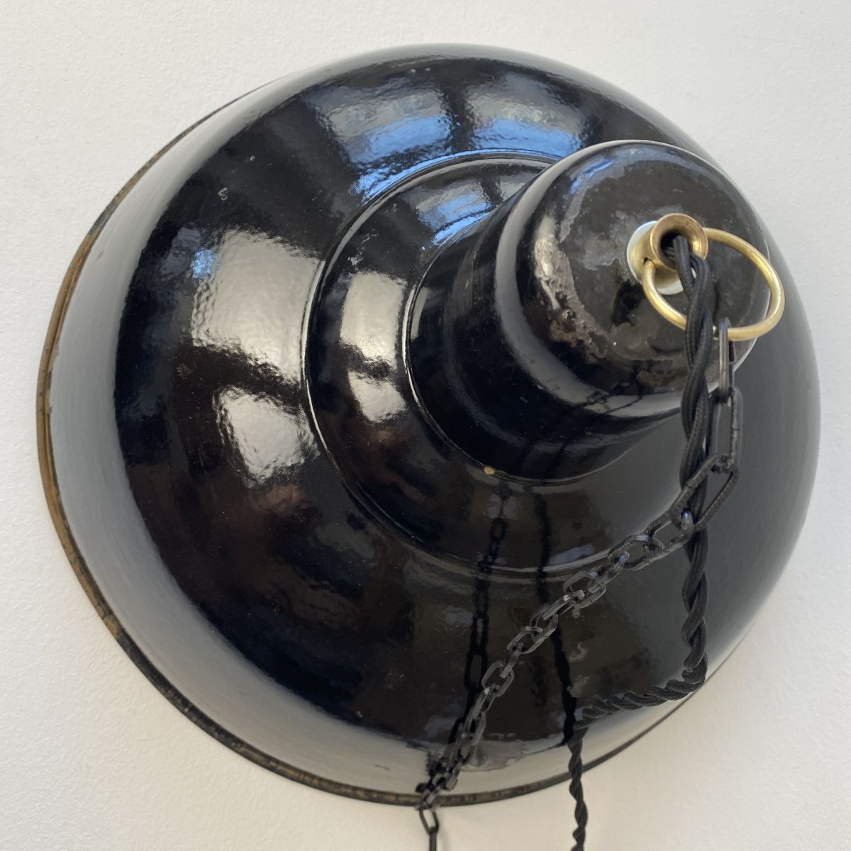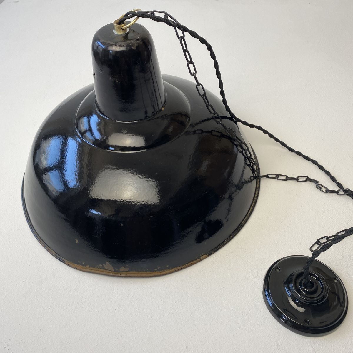 Suspension d’usine en tôle émaillée noire. Des traces de rouilles et sauts d’émail. A noter qu’elle est légèrement voilée sur le bas (voir photo).