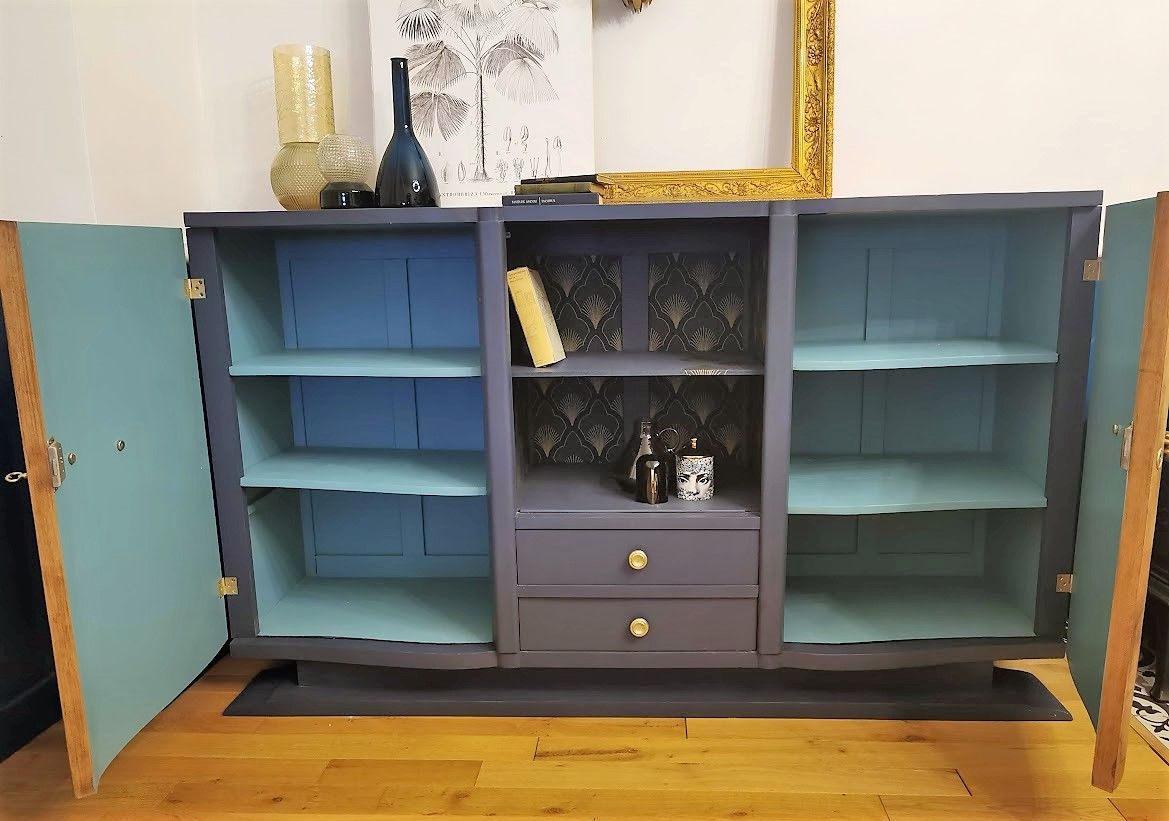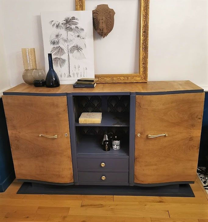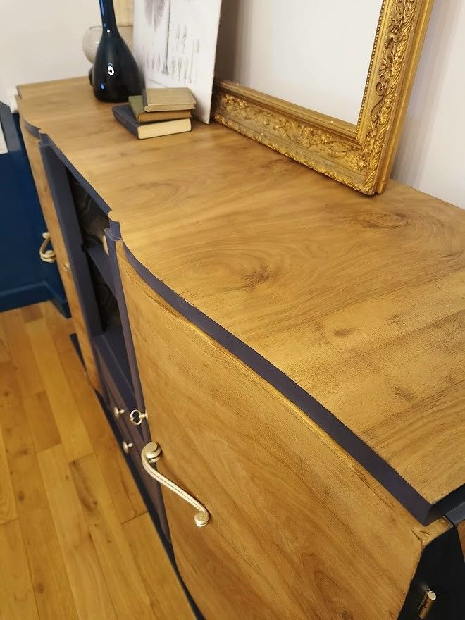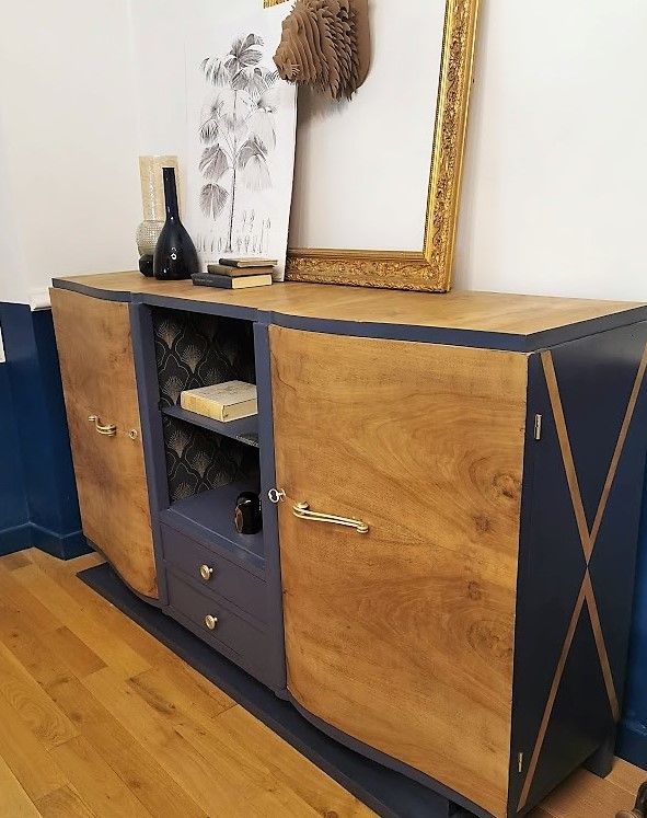 Upcycling d'un meuble ancien avec le charme des courbes et des poignées dorées.