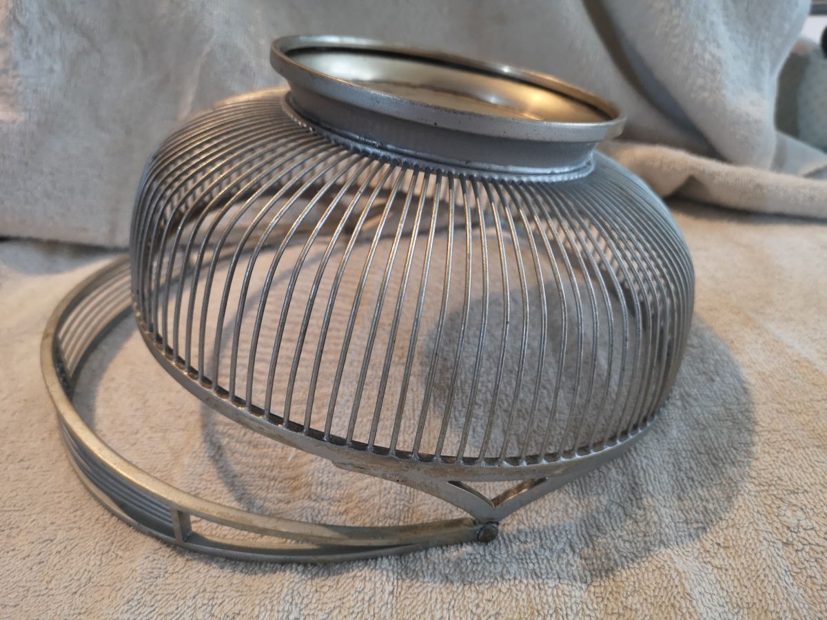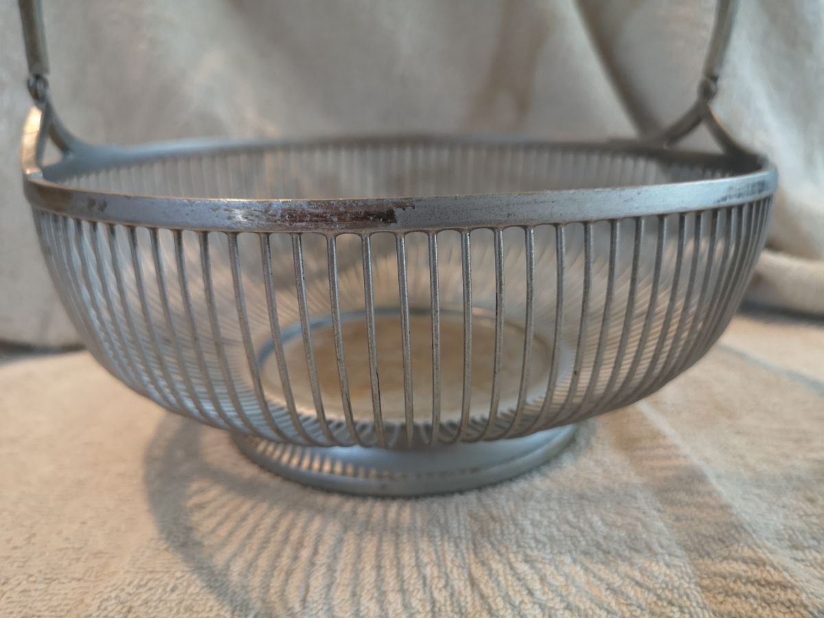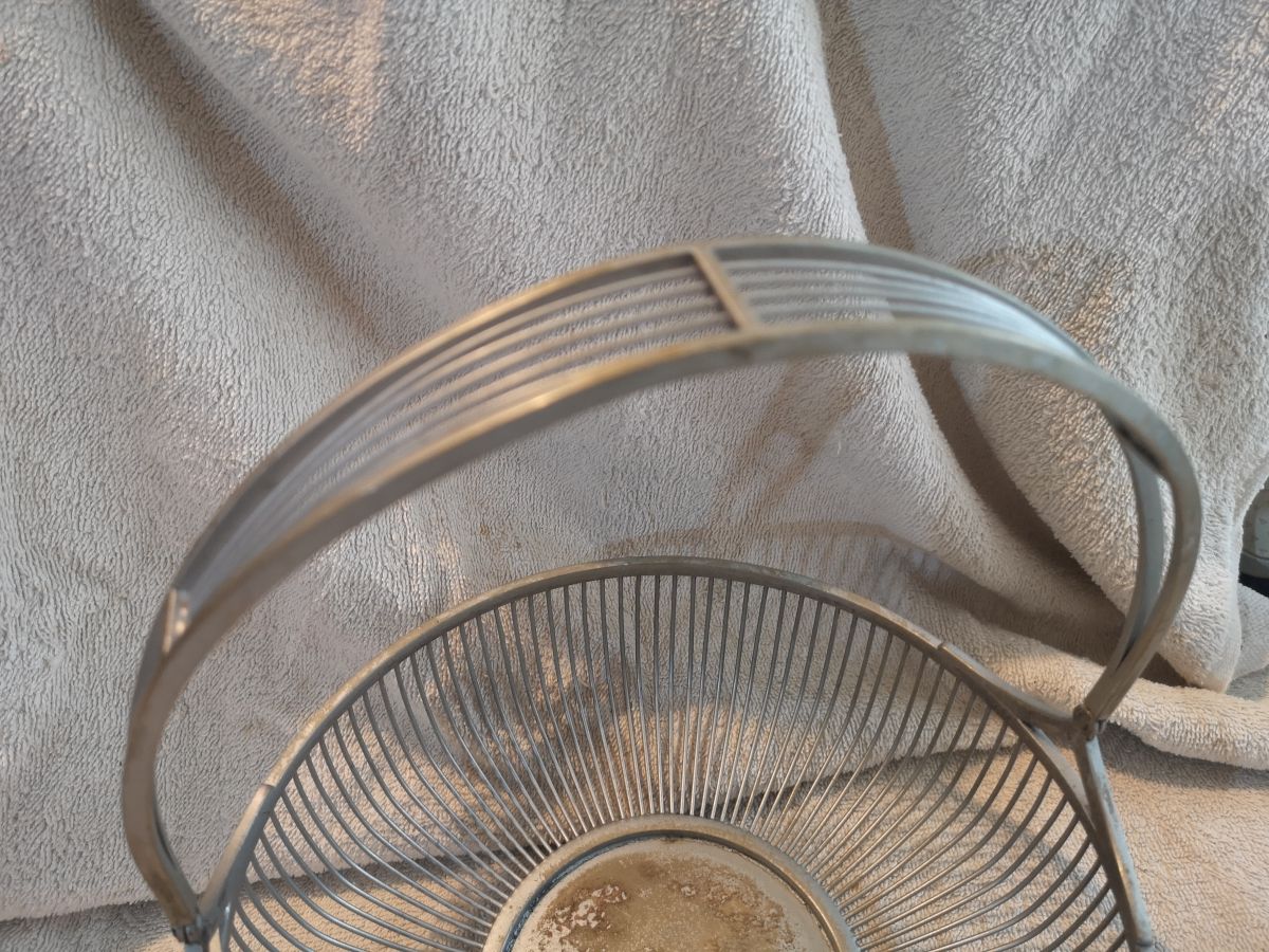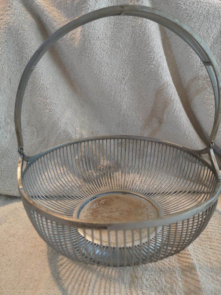 ancien panier en métal tresser 22 cm de large profondeur 9 cm avec anse manche amovible pour le porter et le suspendre pour ail oignons échalottes etc cuisine tendance déco .