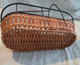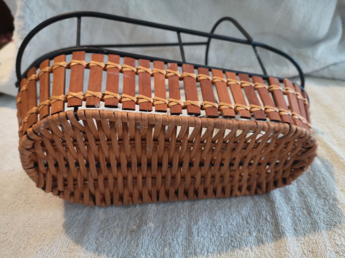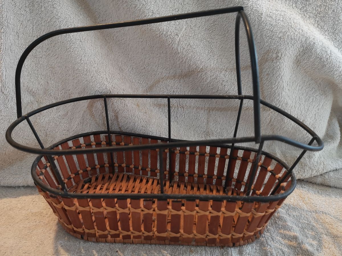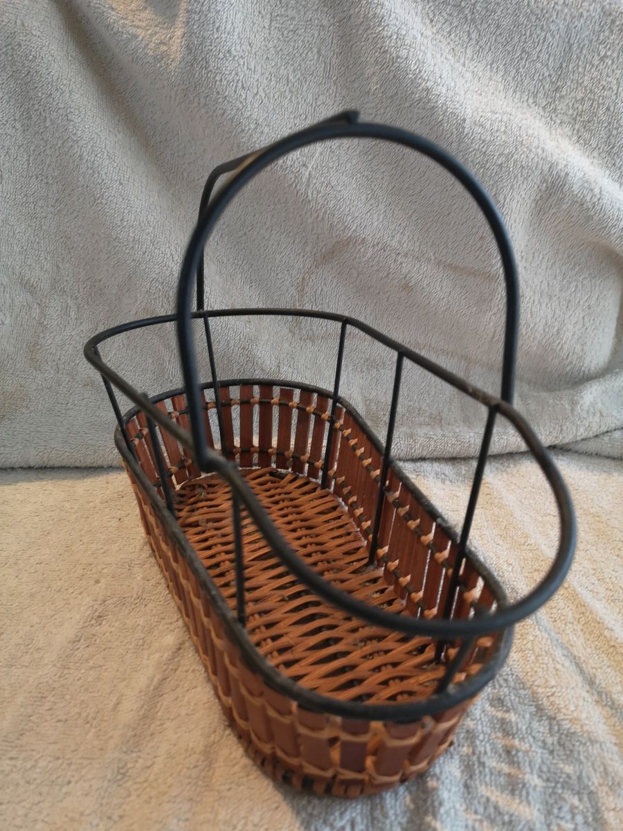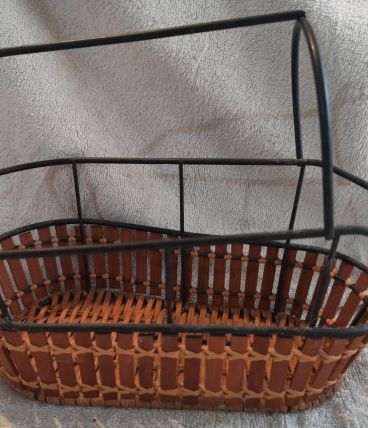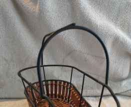 porte bouteille d'occasion en métal et rotin 27,5 cm de long 21 cm de haut avec anse et en très bon état pour décoré vos tables de fêtes