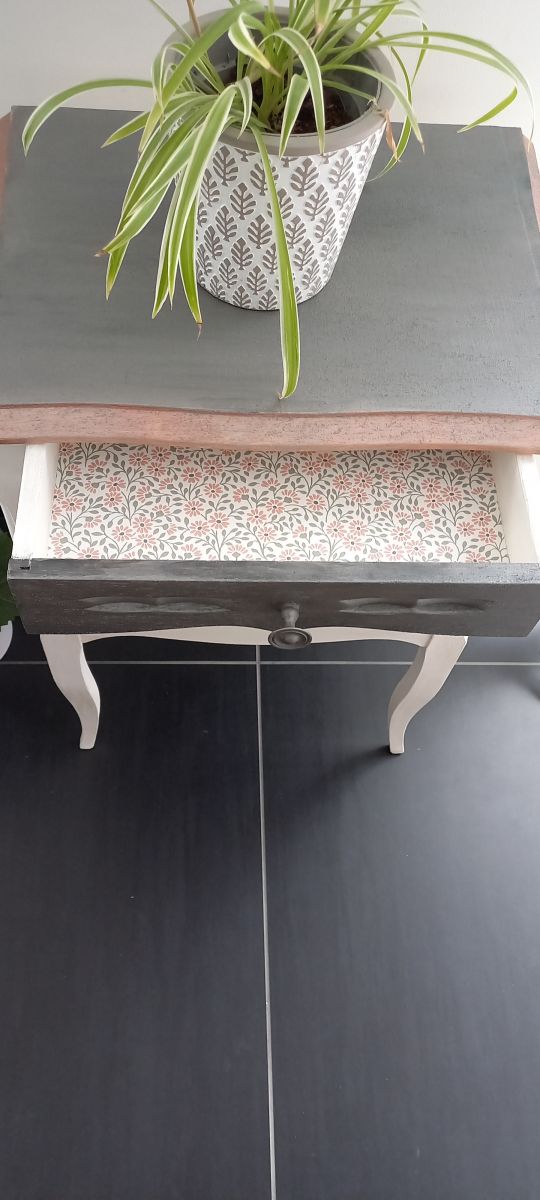 Je l'ai repeint avec une peinture à la craie pour un effet shabby chic et je l'ai orné d'un joli papier peint floral avec des touches de vieux rose.
