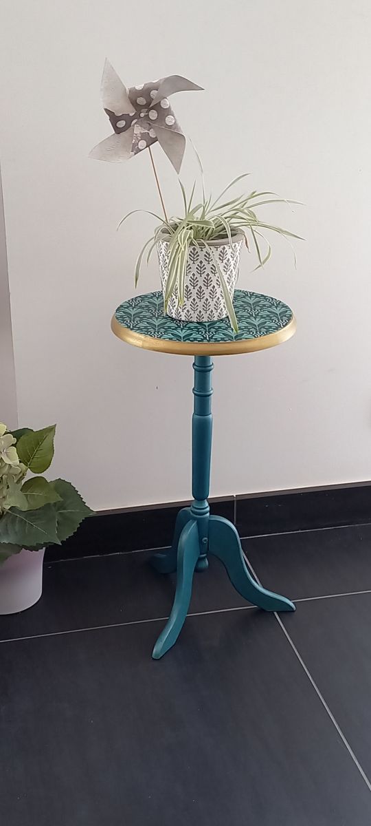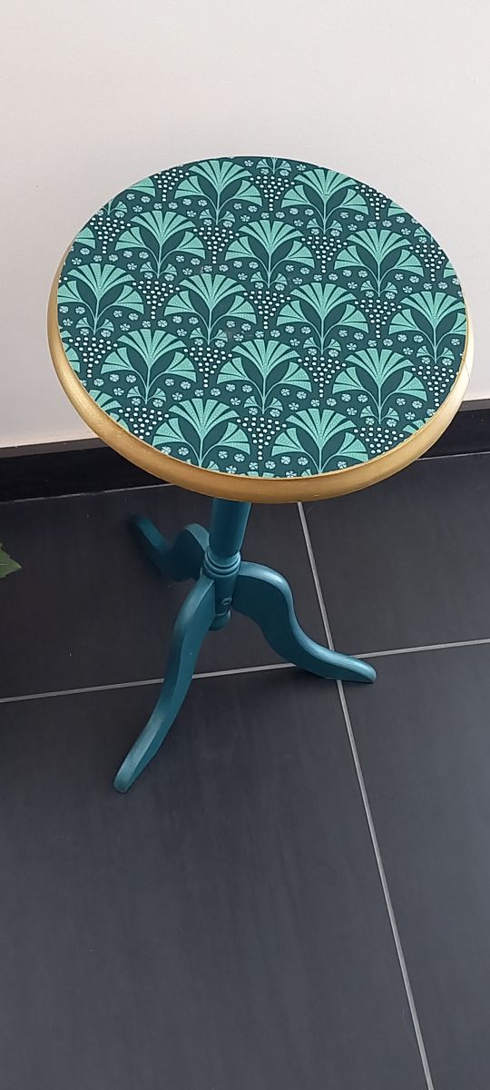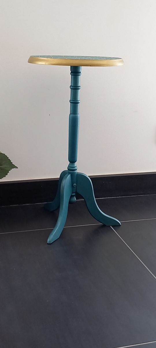 Je vous propose un joli guéridon rond de 28 cm de diamètre chiné et remis au goût du jour. Je l'ai poncé, peint avec de la peinture bleue irisée et protégé avec du vernis satiné anti-choc. Un joli motif art déco vient lui donner plus de style. Le bord est peint en doré.