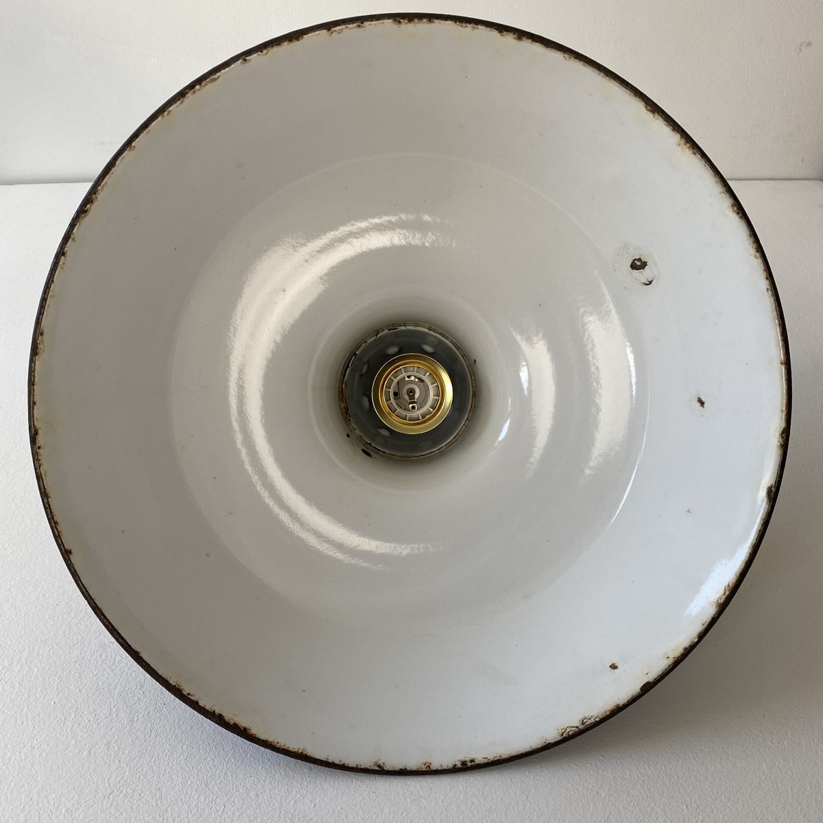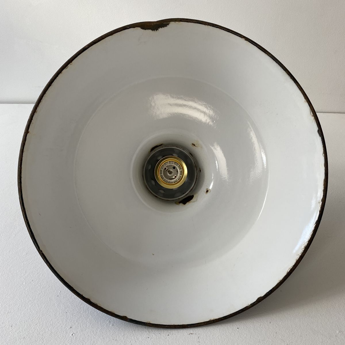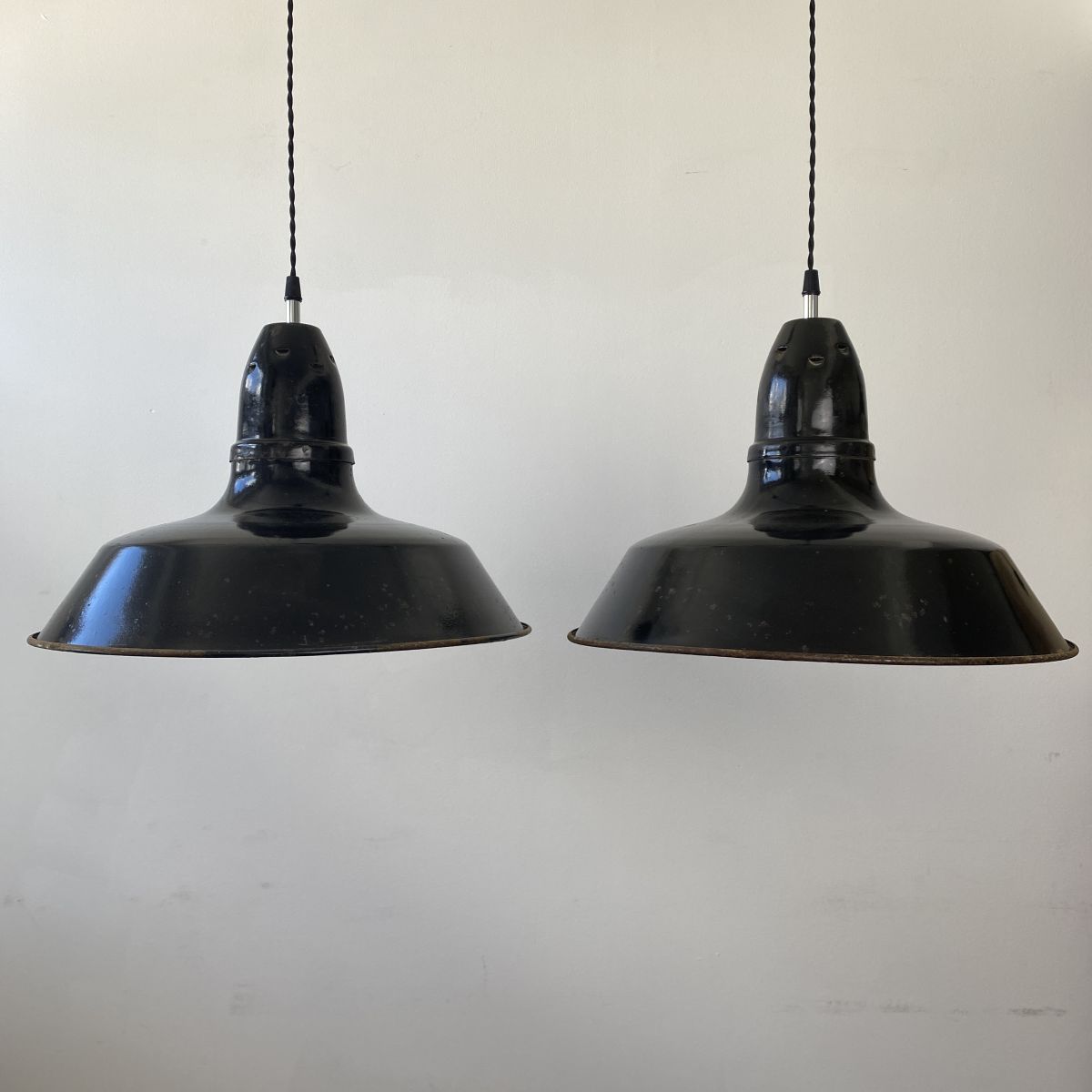 2 suspension d’usine en tôle émaillée noire. Des traces de rouilles et sauts d’émail. Elles sont toutes différentes mais restent en bel état général.