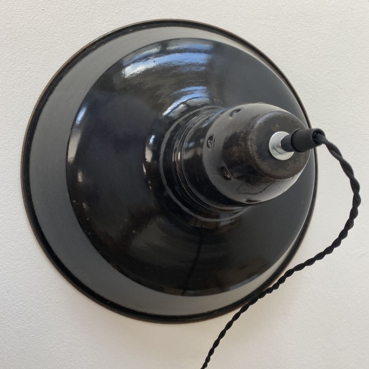 Electricité refaite à neuf avec fil en tissu noir torsadé. Branchement par domino. Douille à vis gros culot (E27). Présence d’une rosace de fixation en porcelaine.