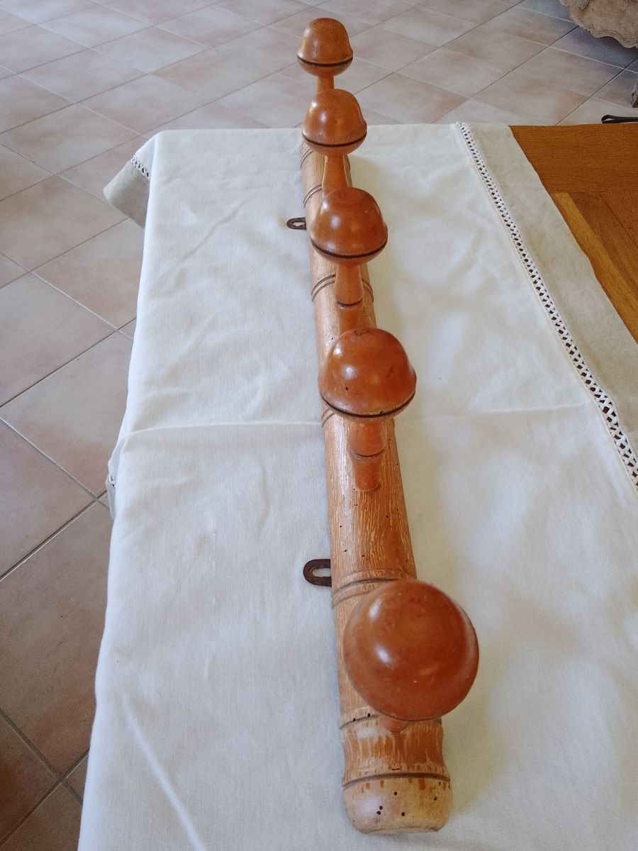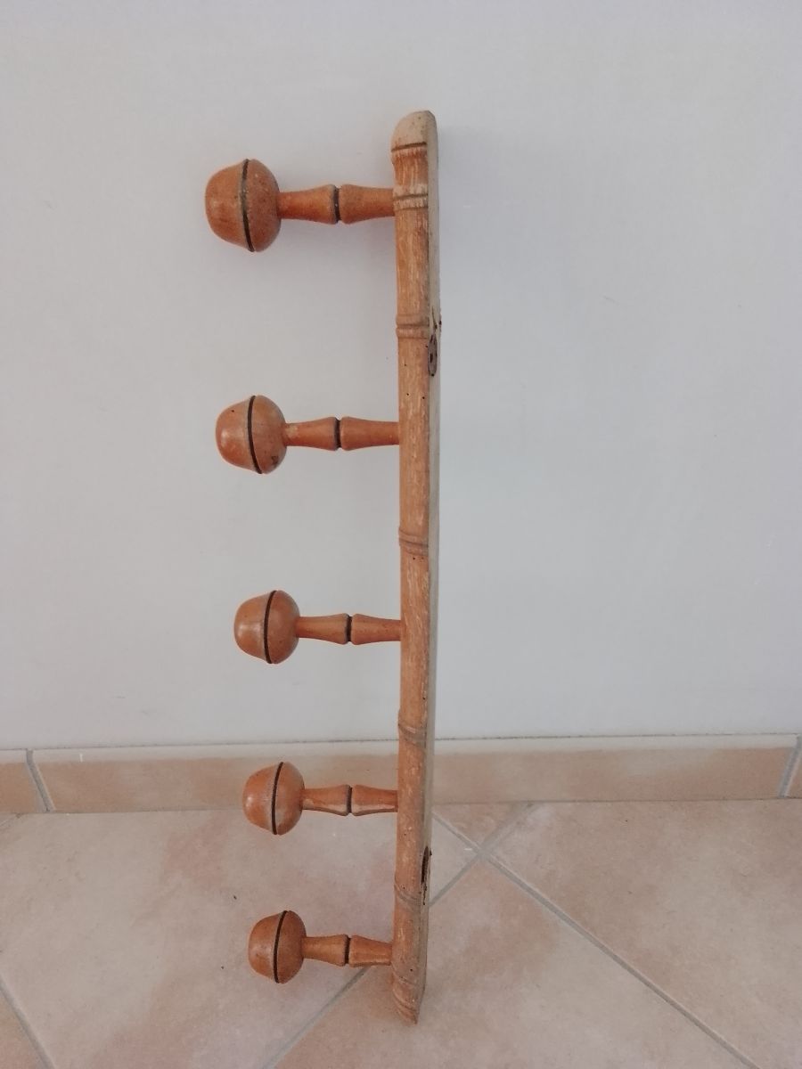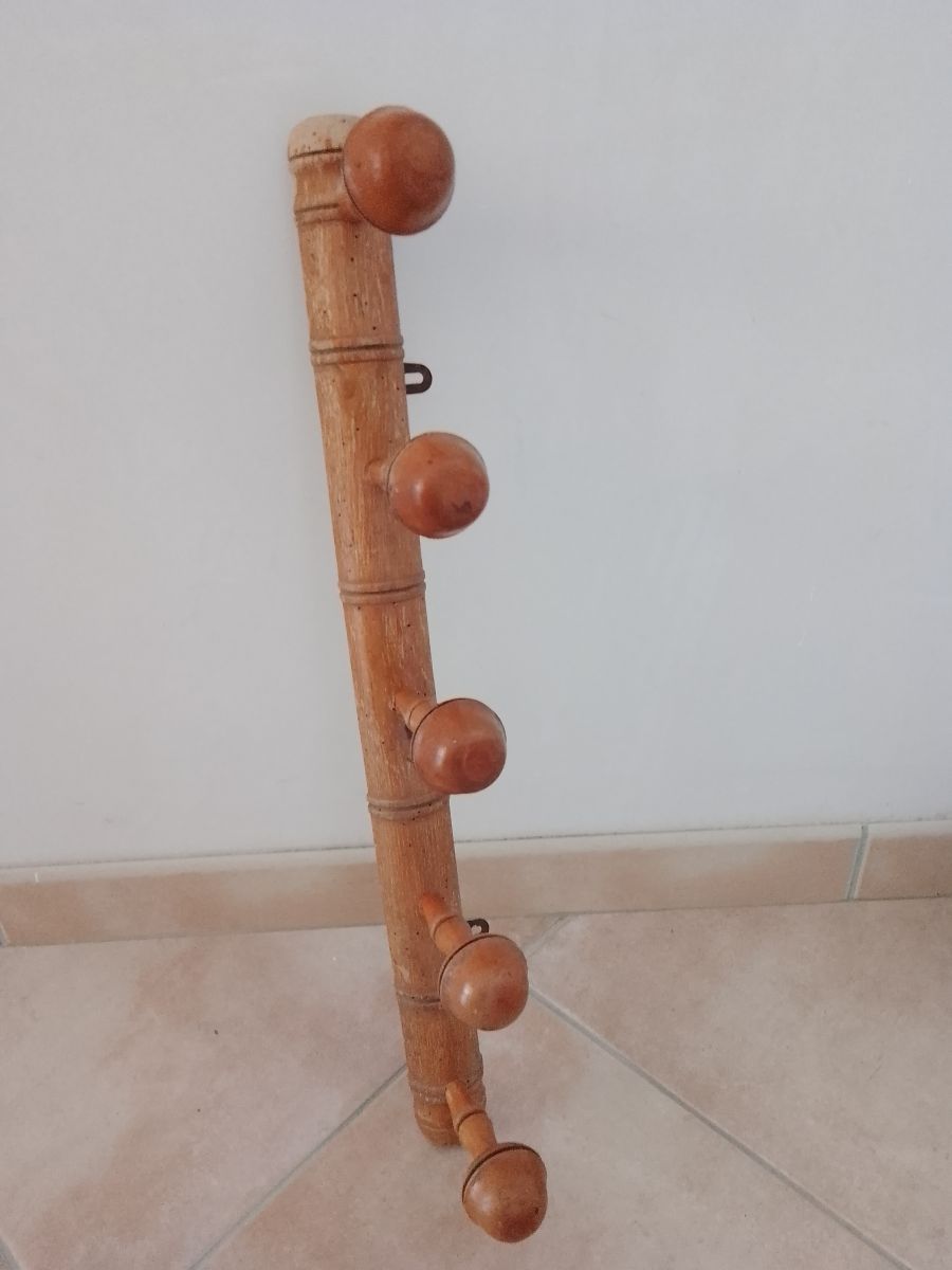 Ancien porte manteau mural en bois tourné façon bambou. A 5 patères, plus tout jeune mais qui retrouvera une 2e jeunesse dans votre intérieur.