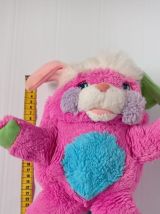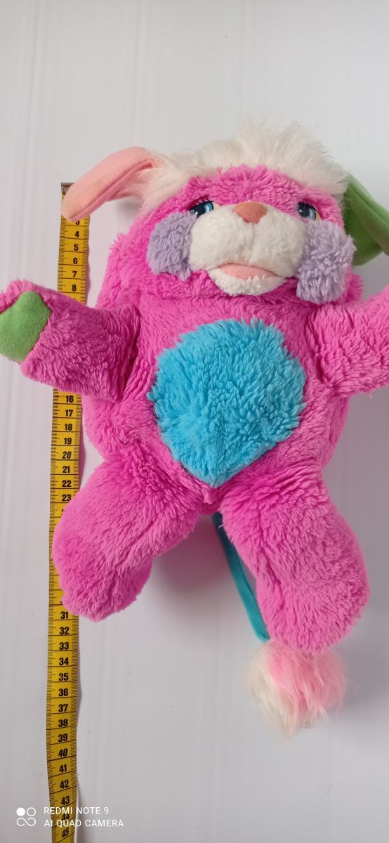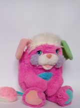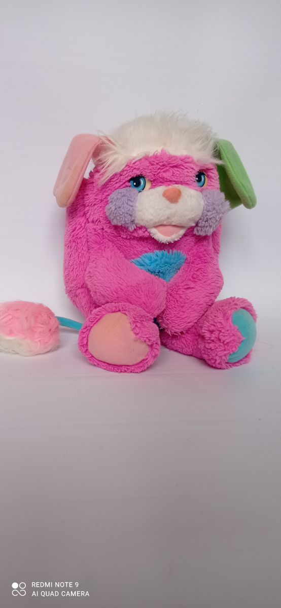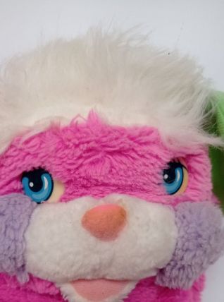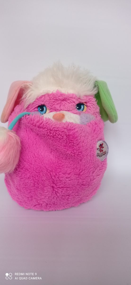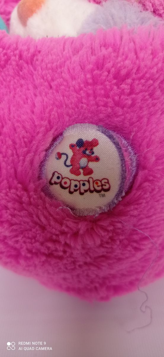 Le popples de notre enfance, rose au ventre bleu, il est encore bien doux. D'une trentaine de centimètres, il se met en boule, un peu defaichi par endroits mais très propre, il n'est pas décousu, hormis l'étiquette qui tient malgré tout encore très bien ????