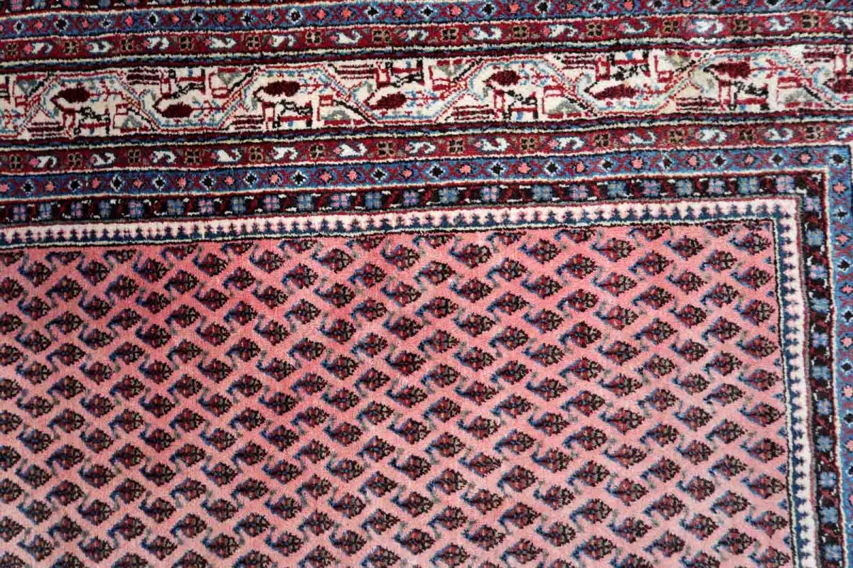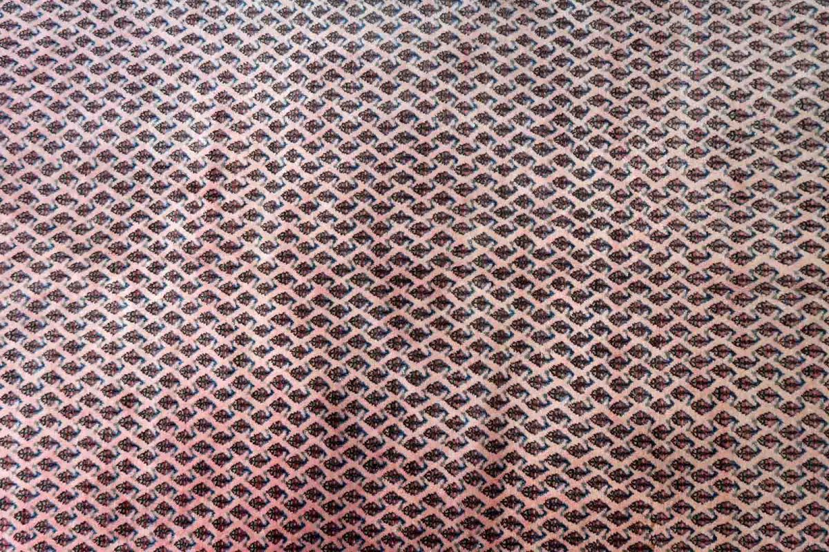 Handmade vintage Indian Seraband rug in original condition, it is unequally faded (one side is brighter then another) . The rug has been made in traditional pattern, it is from end of 20th century. The shades of the rug are mostly in pink and white. All-over design with repeating pattern. All dyes on this rug are natural. This is the type of rug woven in India to compete in the same market as rugs from Persia.