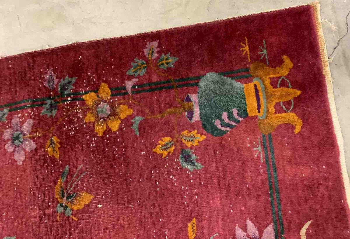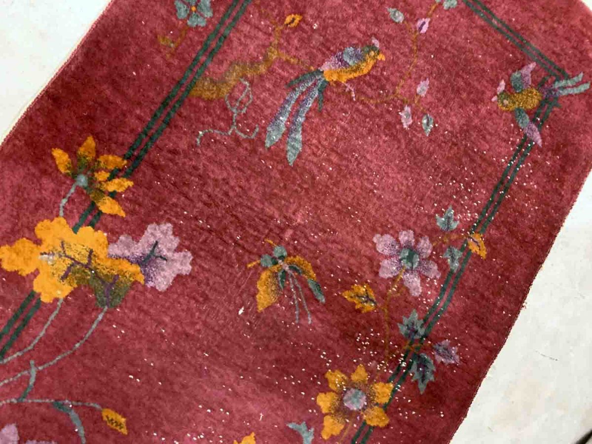Handmade antique Art Deco Chinese rug in red color. The rug has traditional floral Art Deco design with some birds and vases. It is from the beginning of 20th century in original condition, it has some low pile.