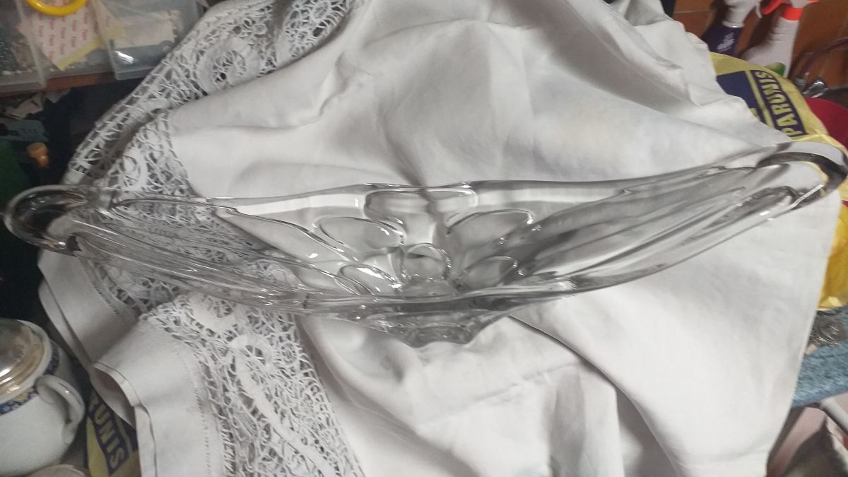 Sa forme est très jolie pour mettre en valeur vos fruits. Elle a traversée les années 1950 mais elle est en très bon état. Pas une ride pas un éclat très solide et très lourd. Longueur 77 hauteur 11 largeur 14