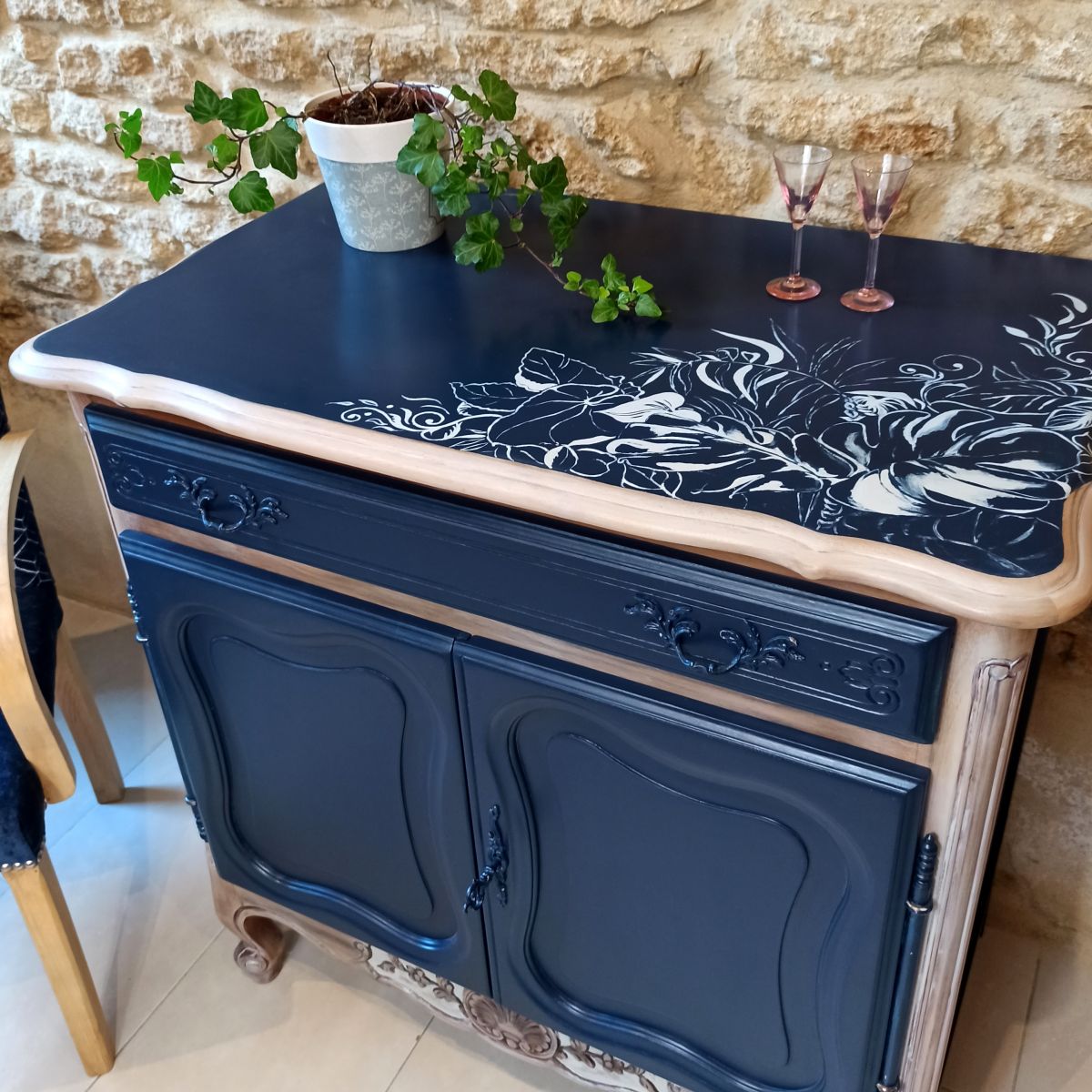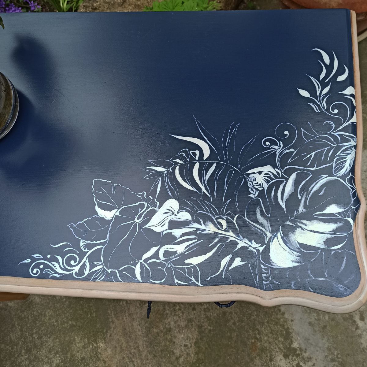 Motifs végétaux peints à la main sur le plateau. Intérieur peint en bleu clair.