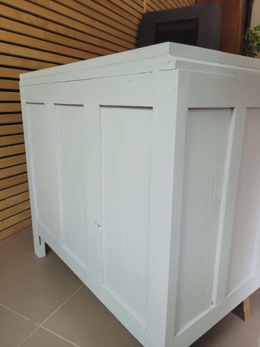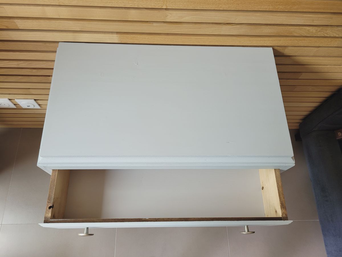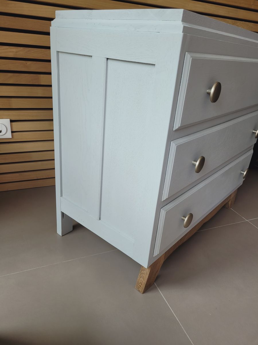 Commode vintage des années 50 en chêne massif. Elle a été entièrement restaurée: nettoyée, poncée repeinte dans la couleur "lumière d'opale" de chez libéron (satin velouté, bleu-gris très pâle). La commode est en très bon état, de très légères traces sur le plateau mais ce sont les nœuds du bois. Les boutons en aluminium sont d'origine. Le meuble est sain, stable et propre. Les tiroirs coulissent parfaitement.