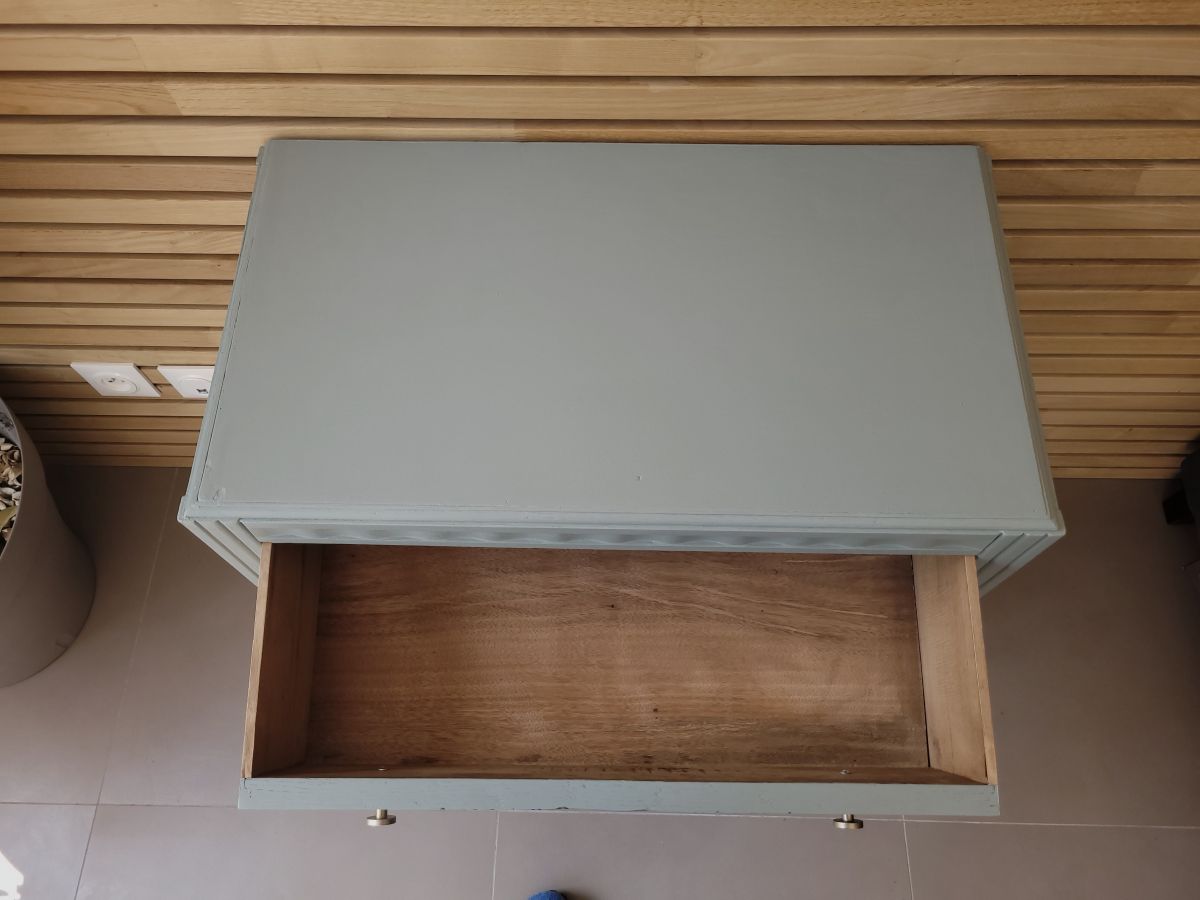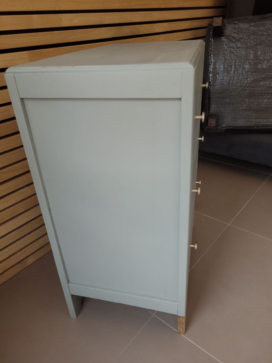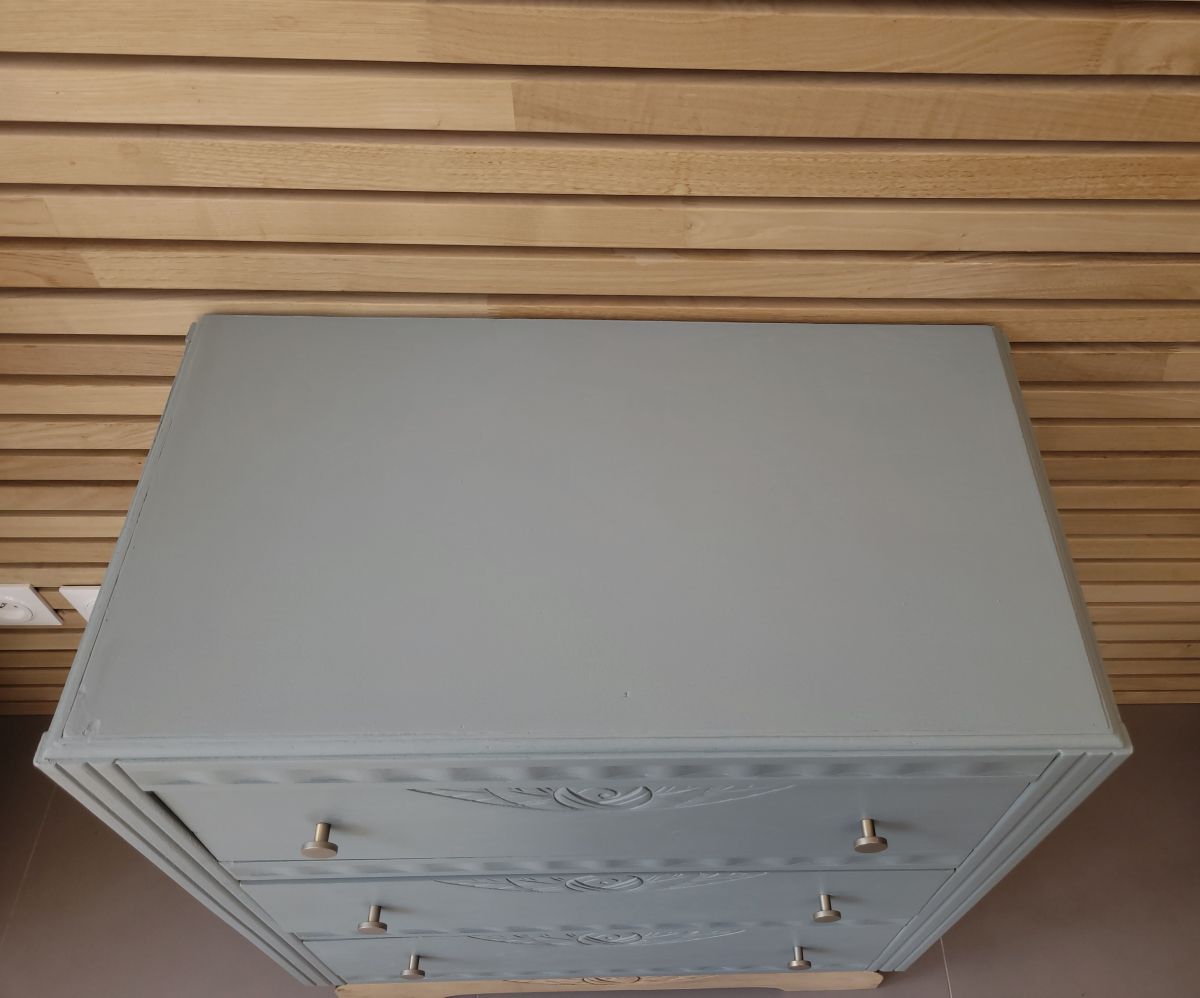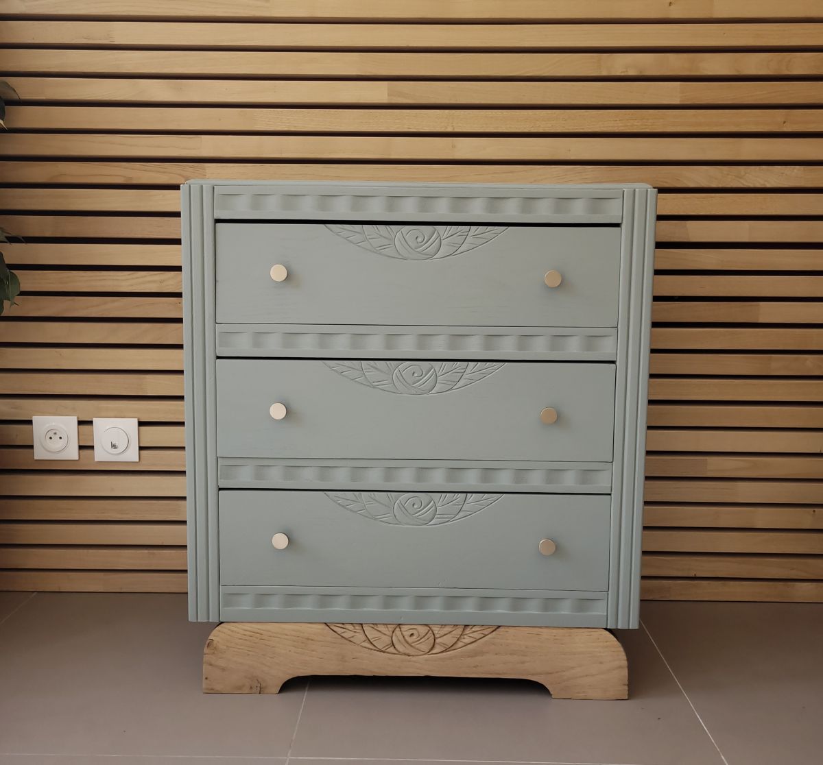 Commode art déco en bois massif avec sculptures florales. Elle a été entièrement restaurée: nettoyée, poncée repeinte en "étourneau" de chez ressource (mate légèrement satinée). La commode est en bon état. Les pieds sont laissés en bois brut. Les poignées en laiton ne sont pas d'origine. Le meuble est sain, stable et propre. Les tiroirs coulissent parfaitement. Malgré tout le soin apporté, de très légères traces du temps subsistent par endroits. Livraison possible dans un rayon de 60 km contre dédommagement.