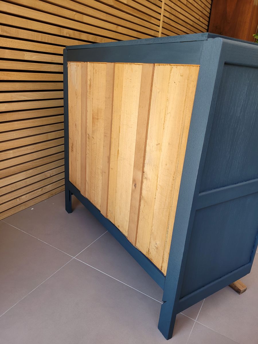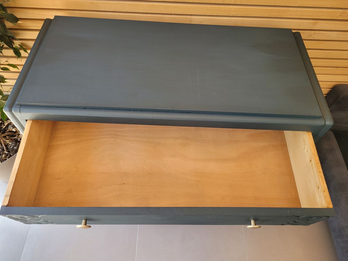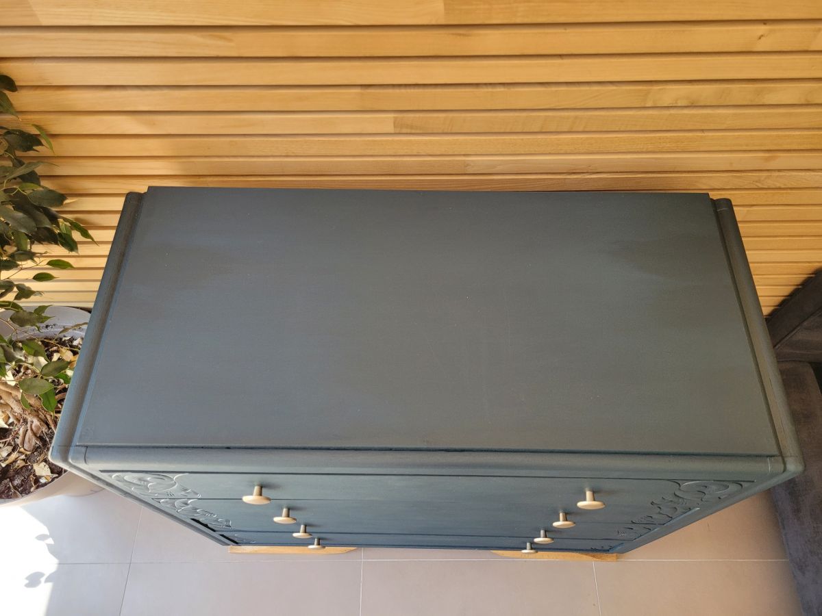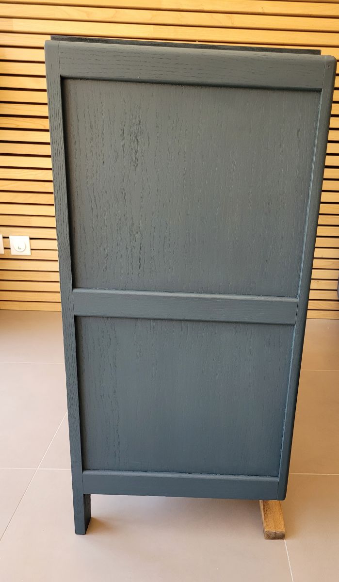 Grand commode art déco en chêne massif avec empiètement moustache. Elle a été entièrement restaurée: nettoyée, poncée repeinte en bleu des vosges (mate légèrement satinée). La commode est en très bon état. Les boutons sont d'origine. Le meuble est sain, stable et propre. Les tiroirs coulissent parfaitement. Dimensions des tiroirs: h14 X l86 X l39 cm. Livraison possible dans un rayon de 70 km.