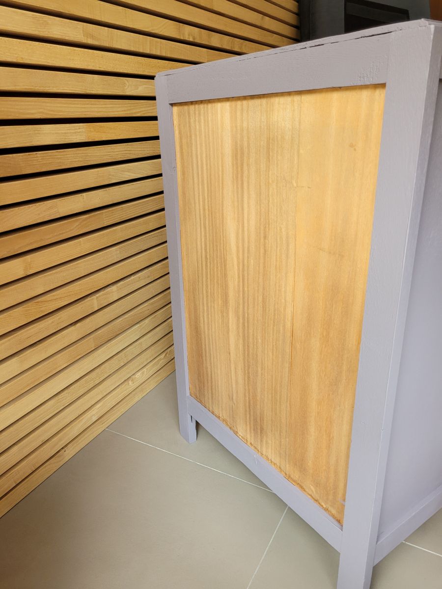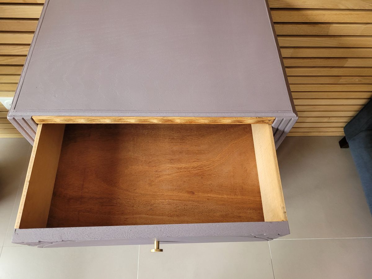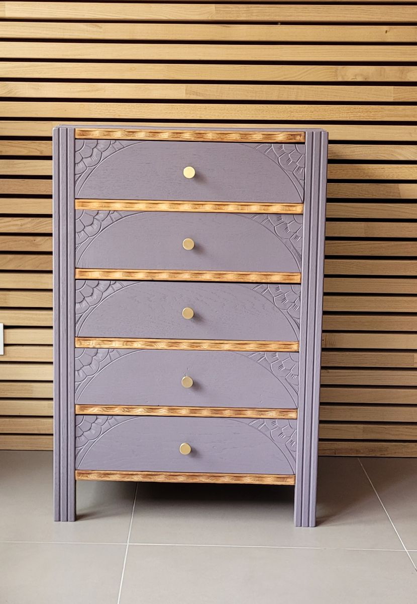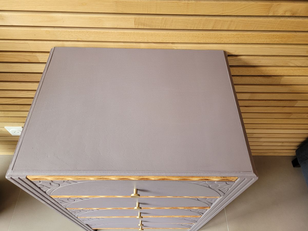 Commode art déco en bois massif. Elle a été entièrement restaurée: nettoyée, poncée repeinte en taupe glacé – i12 (satin velouté de chez ressource). La commode est en très bon état. Les boutons en laiton ne sont pas d'origine. Le meuble est sain, stable et propre. Les tiroirs coulissent parfaitement.
