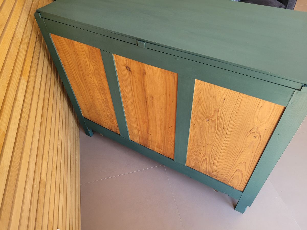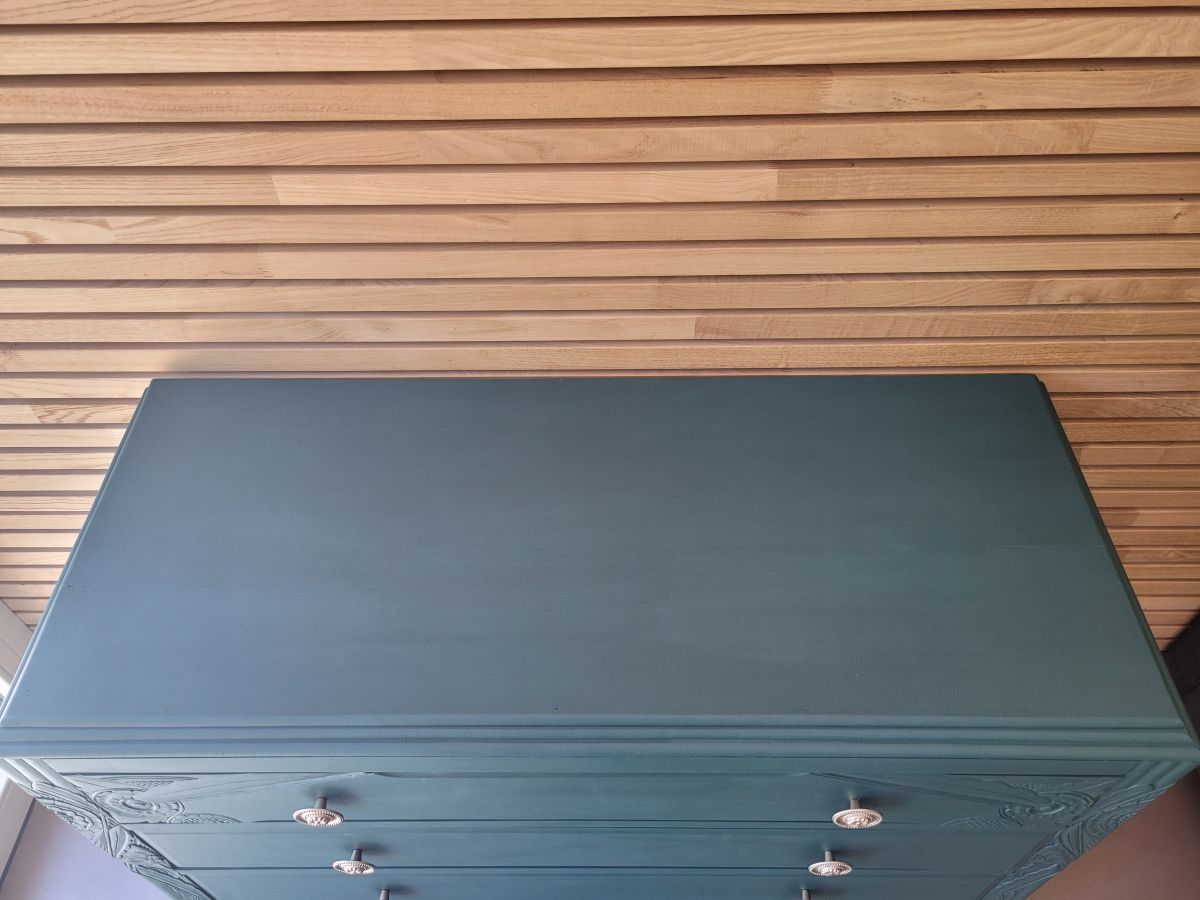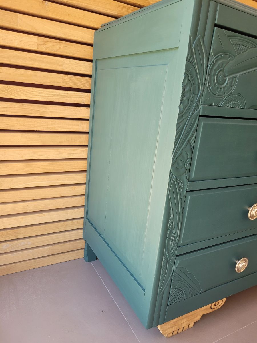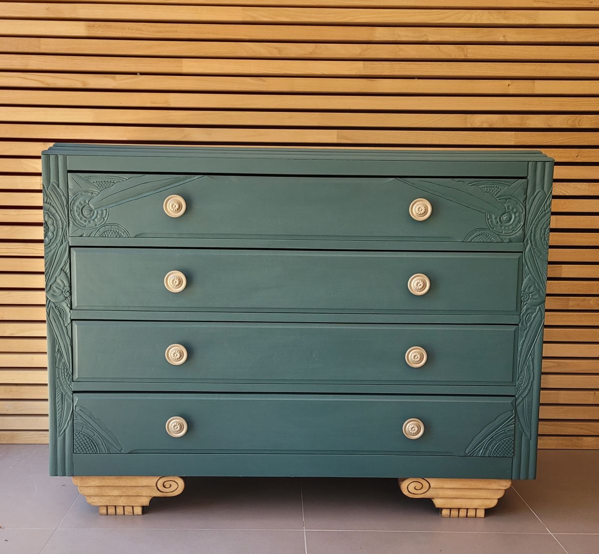 Grand commode art déco en pin massif. Elle a été entièrement restaurée: nettoyée, poncée repeinte en vert d'aubusson (mate légèrement satinée de chez libéron). La commode est en très bon état. Les boutons en laiton sont d'origine. Le meuble est sain, stable et propre. Les tiroirs coulissent parfaitement.