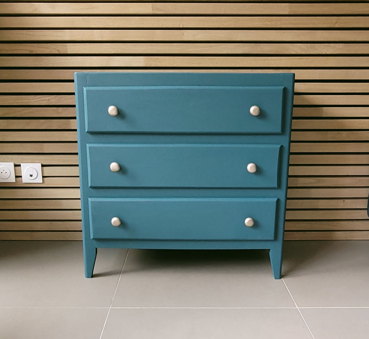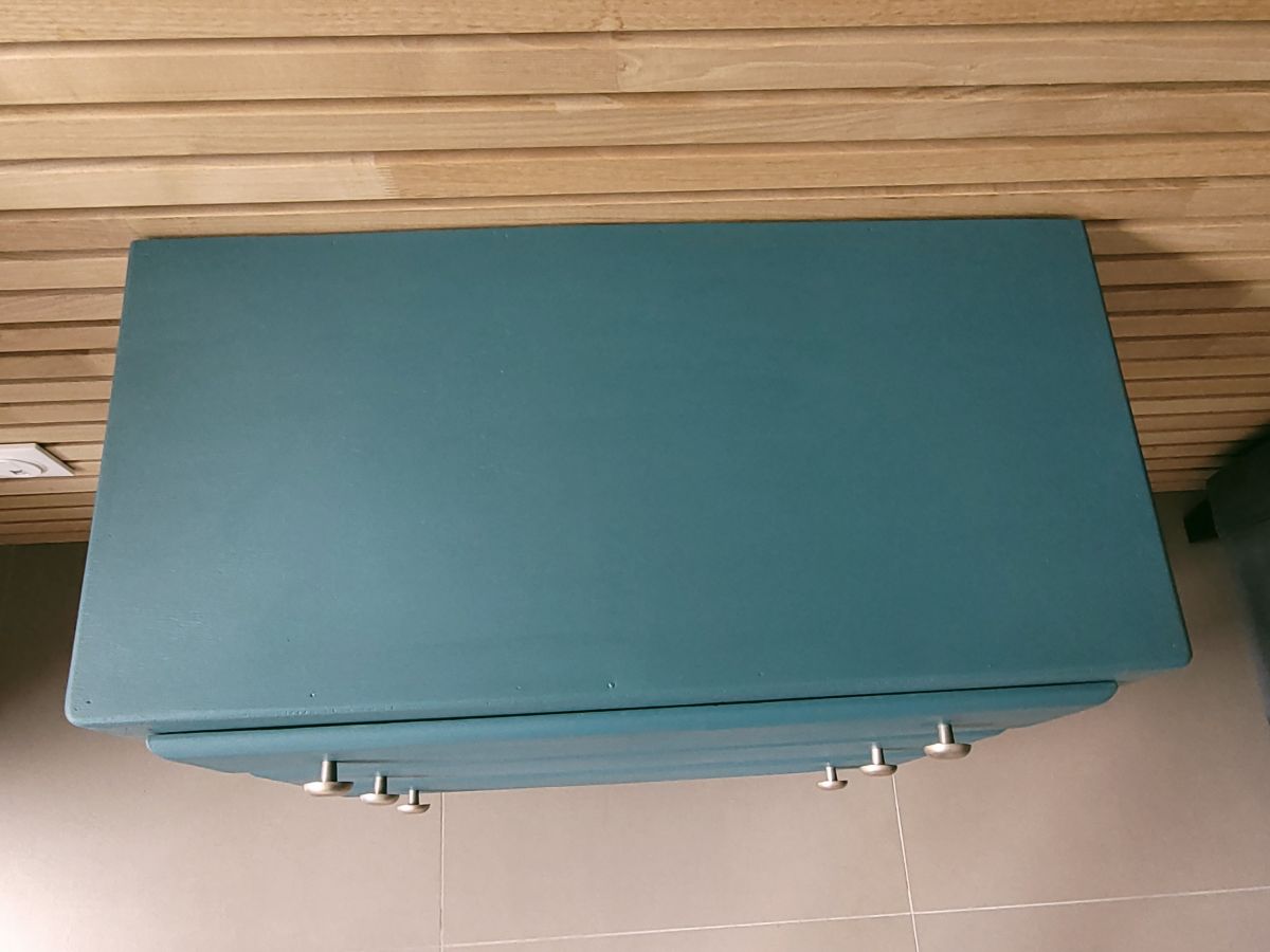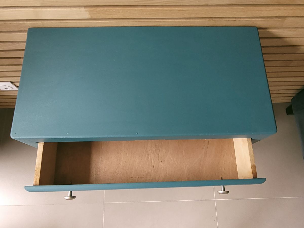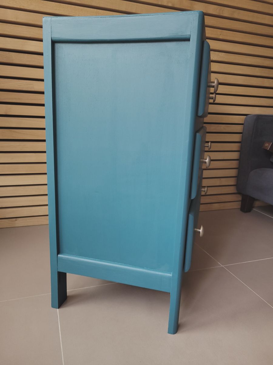 Commode vintage des années 60 en bois massif. Elle a été entièrement restaurée: nettoyée, poncée repeinte dans la couleur "ombrage" de chez ressource (satin velouté). La commode est en très bon état, il subsiste juste un petit trou dans le fond du dernier tiroir (voir photo). Les boutons en aluminium sont d'origine. Le meuble est sain, stable et propre. Les tiroirs coulissent parfaitement. Livraison possible dans un rayon de 60 km contre dédommagement.