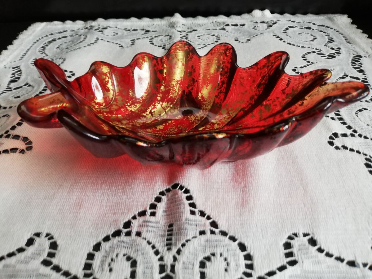 Ancienne coupelle vide poche en verre type Murano couleur rouge rubis à décor or.