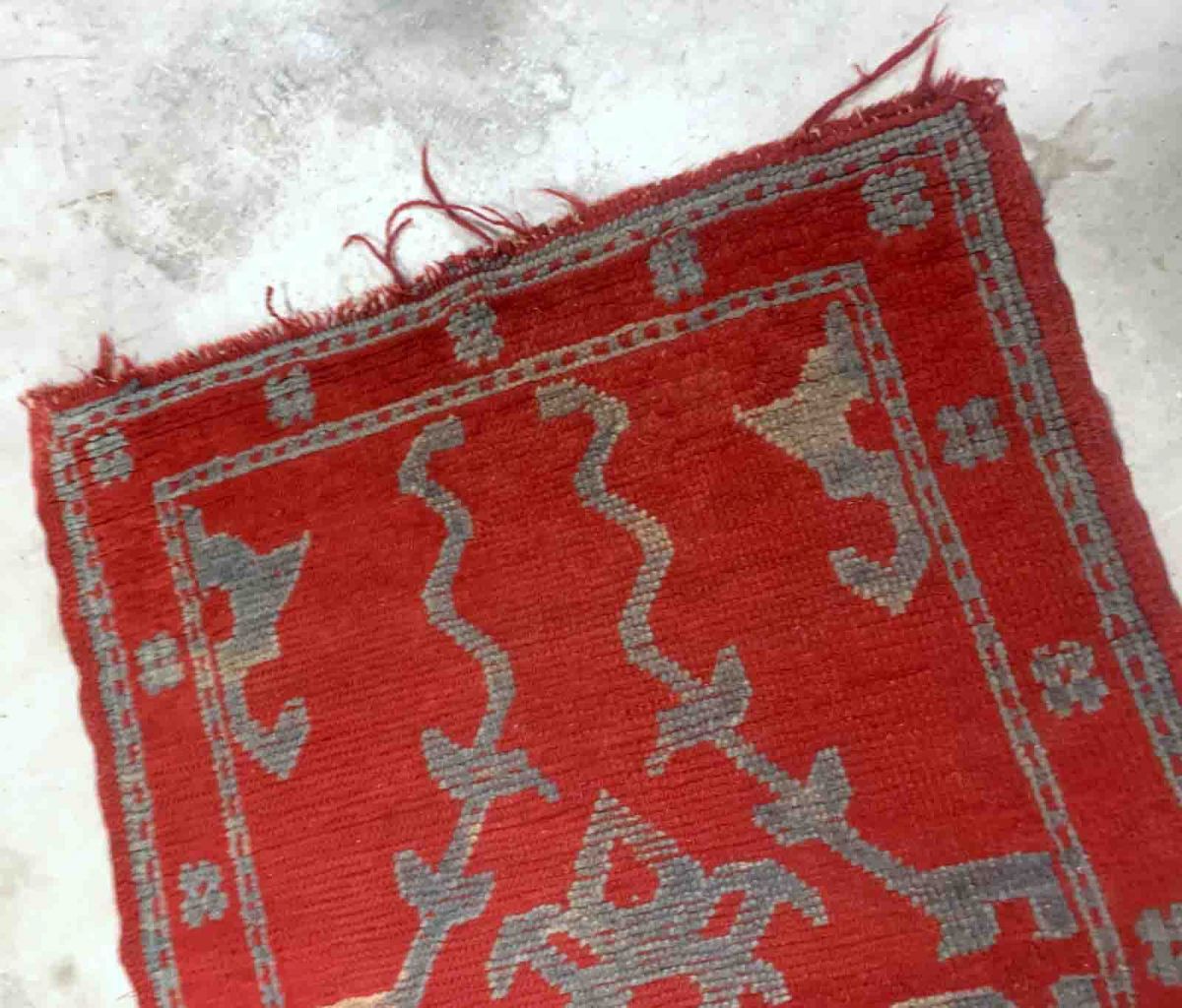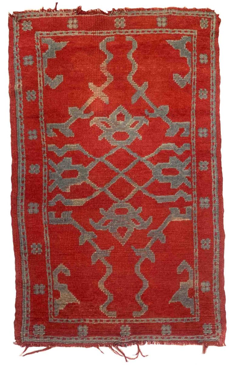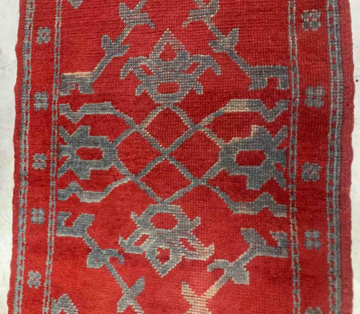 Handmade antique Turkish red rug from Oushak region. The rug is from the end of 19th century in original condition, it has some signs of age.