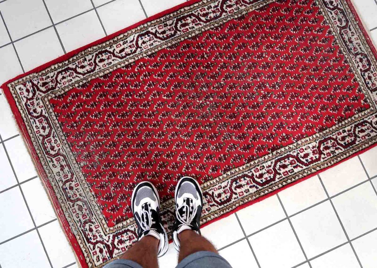 Handmade vintage Indian Seraband rug in red color and all-over design. The rug has been made in the end of 20th century. It is in original condition, has some low pile.