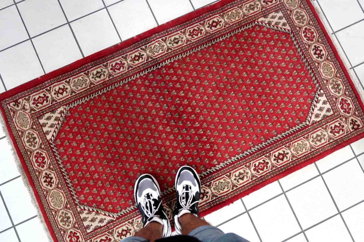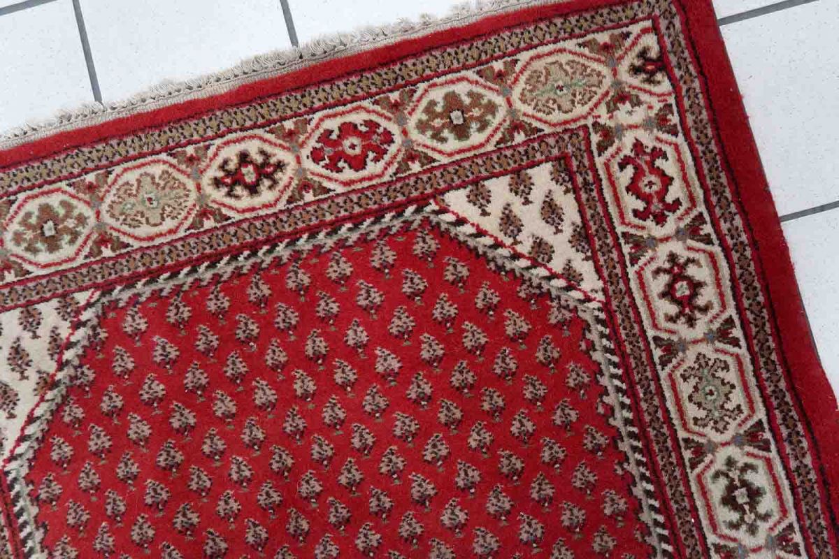 Handmade vintage Indian Seraband rug in red color and all-over design. The rug has been made in the end of 20th century. It is in original good condition.