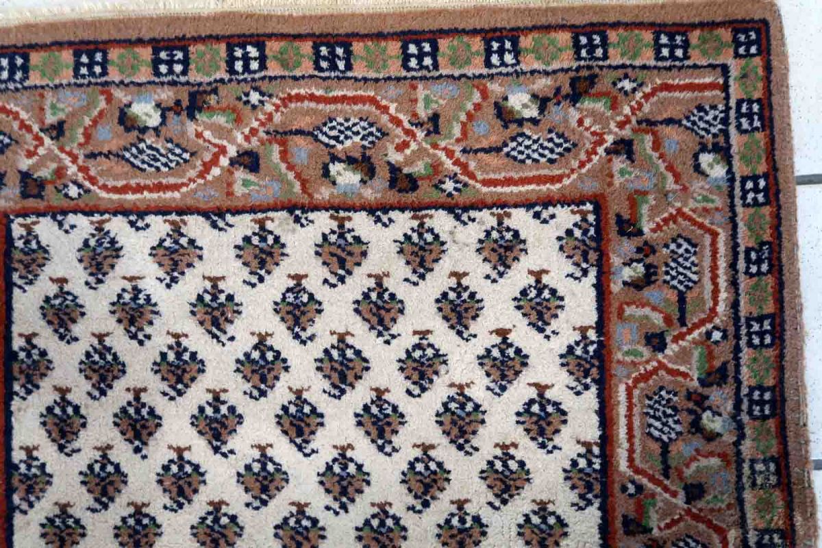 Handmade vintage Indian Seraband rug in white color and all-over design. The rug has been made in the end of 20th century. It is in original good condition.