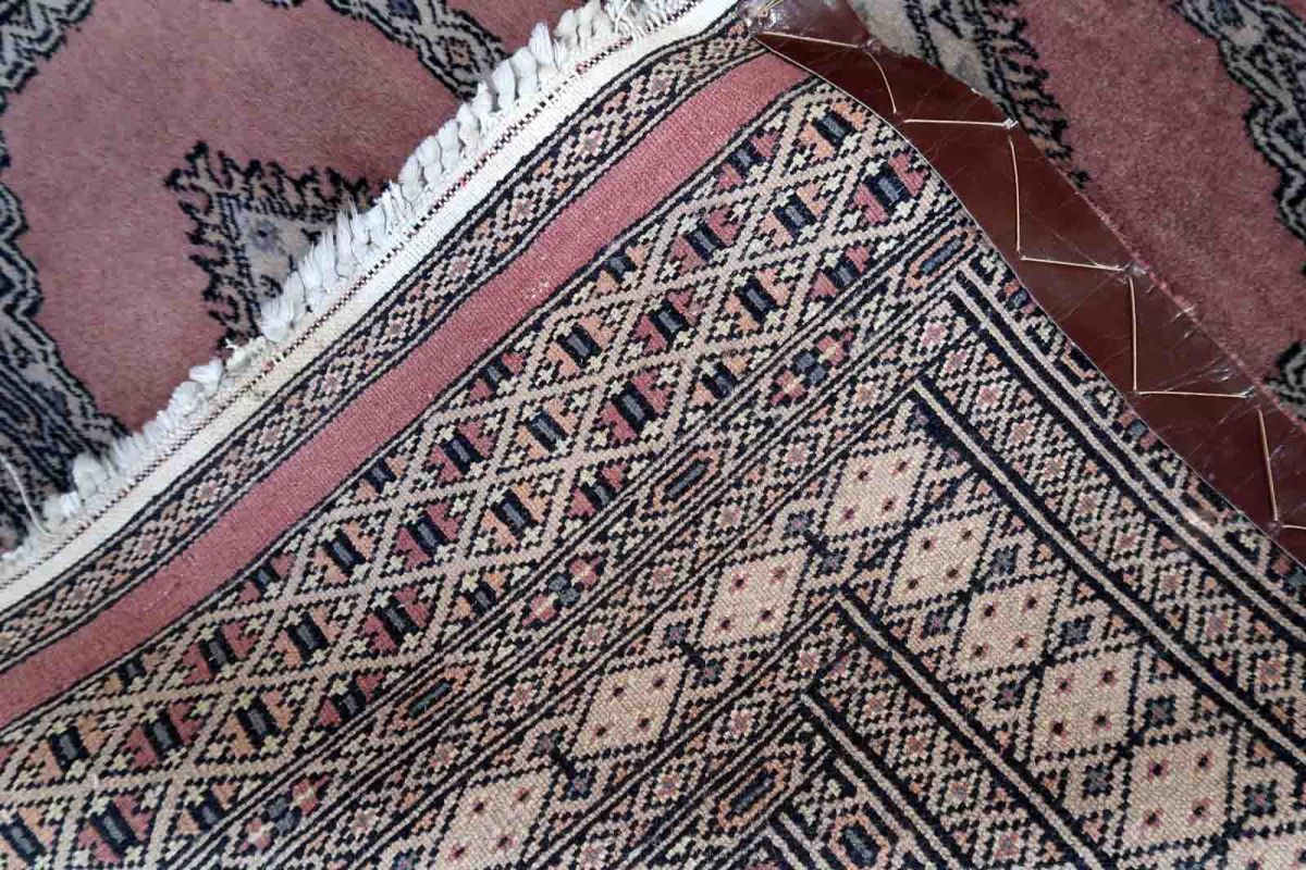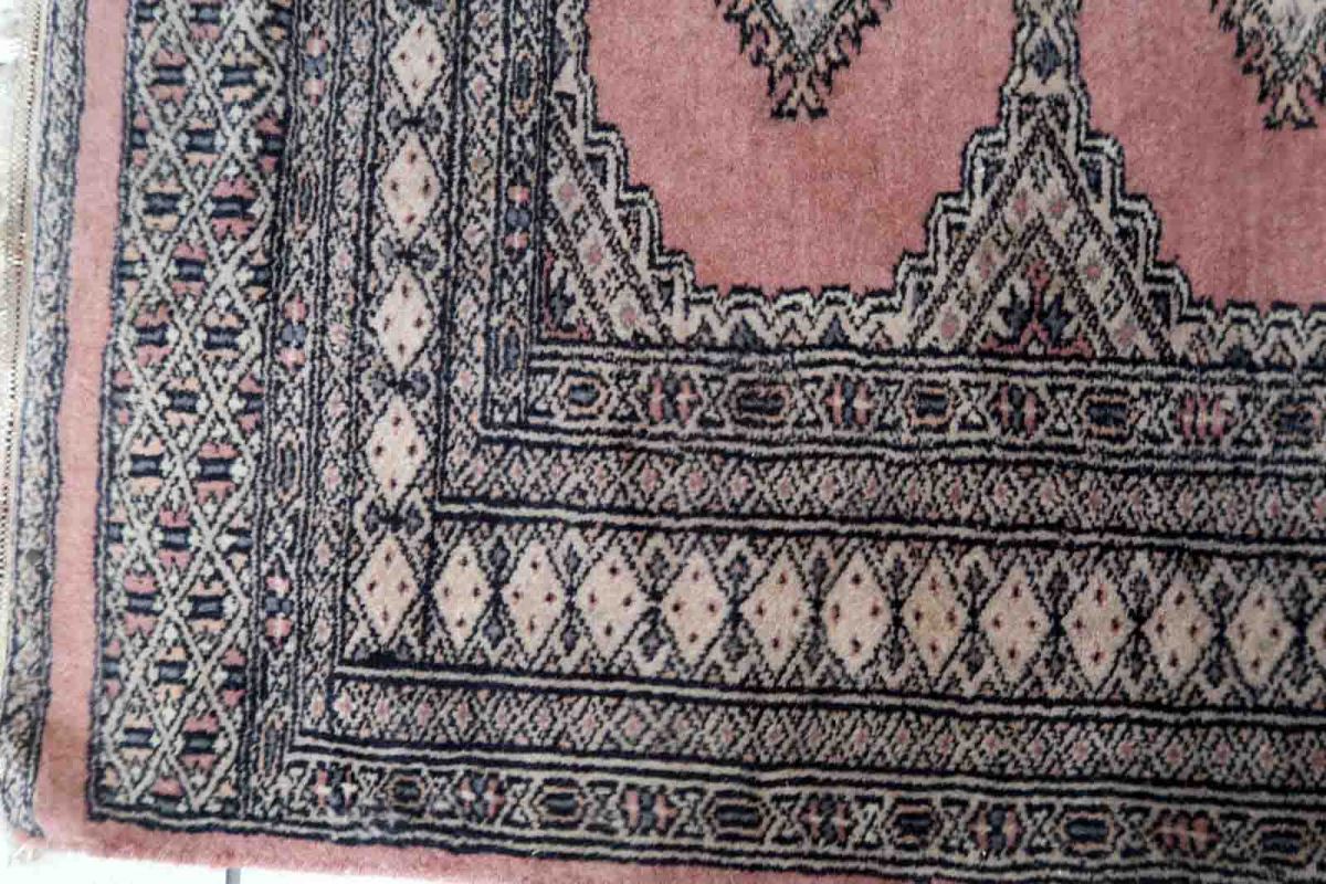 Handmade vintage Uzbek Bukhara rug in traditional design and pink wool. The rug is from the end of 20th century. It is in original good condition.