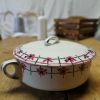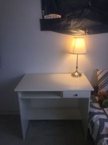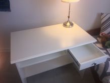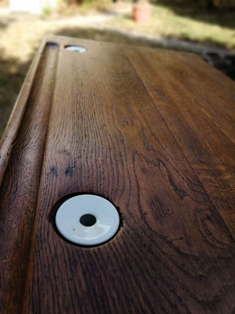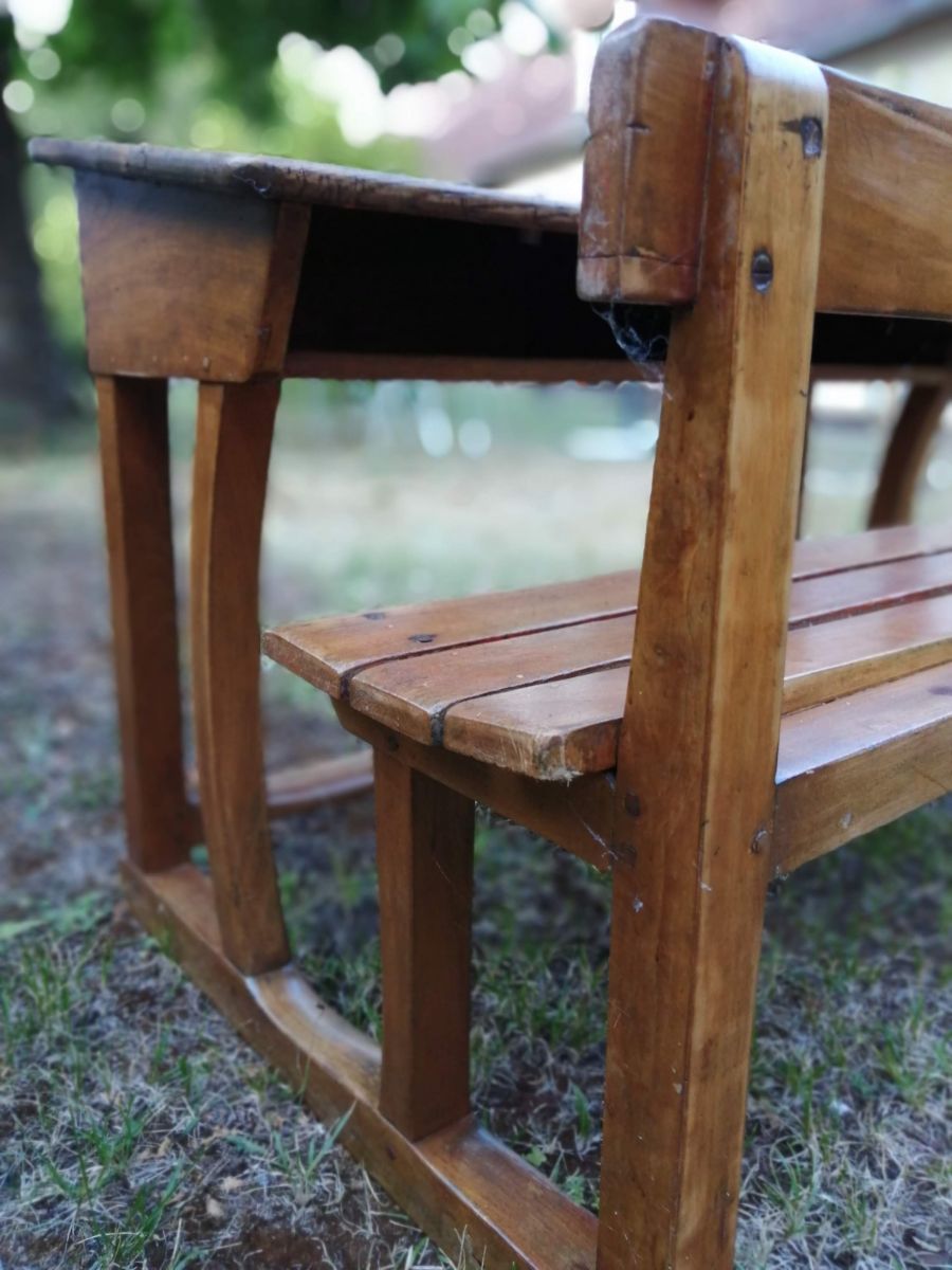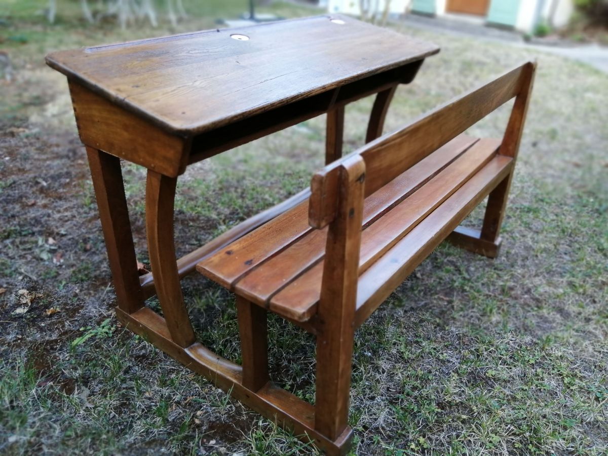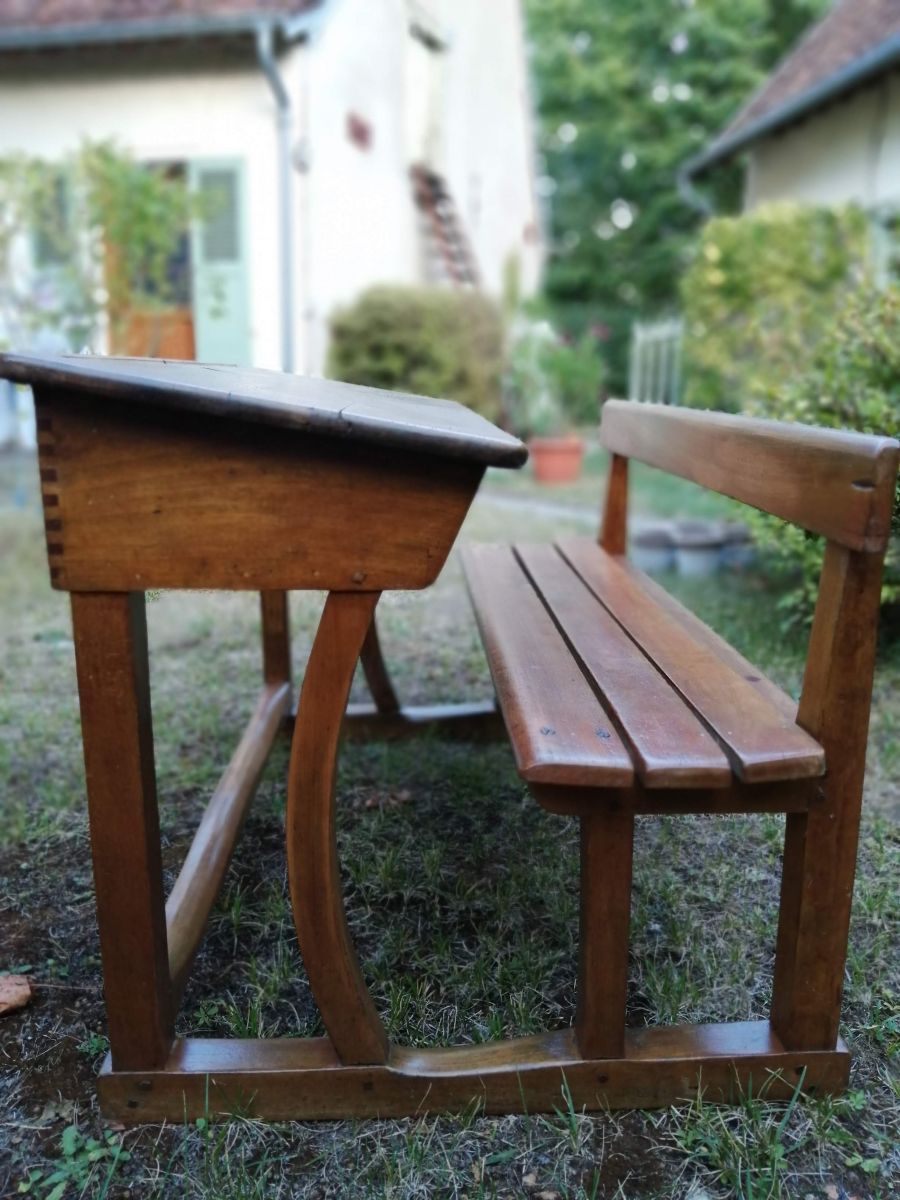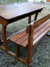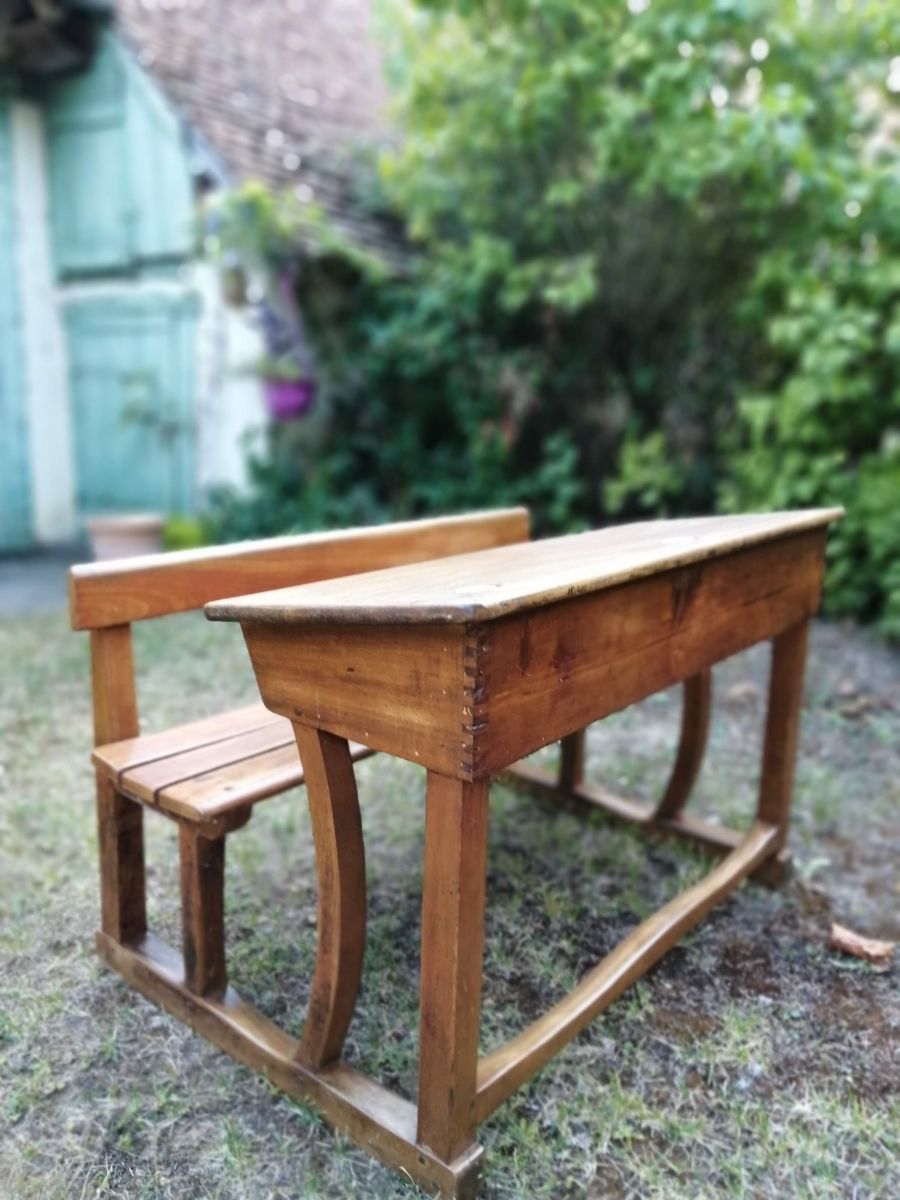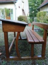 Magnifique pupitre d'écolier double en bois massif (traité et vernis) des années 1950. Le bureau porte quelques traces de ses anciens élèves et autres marques liées au temps.
