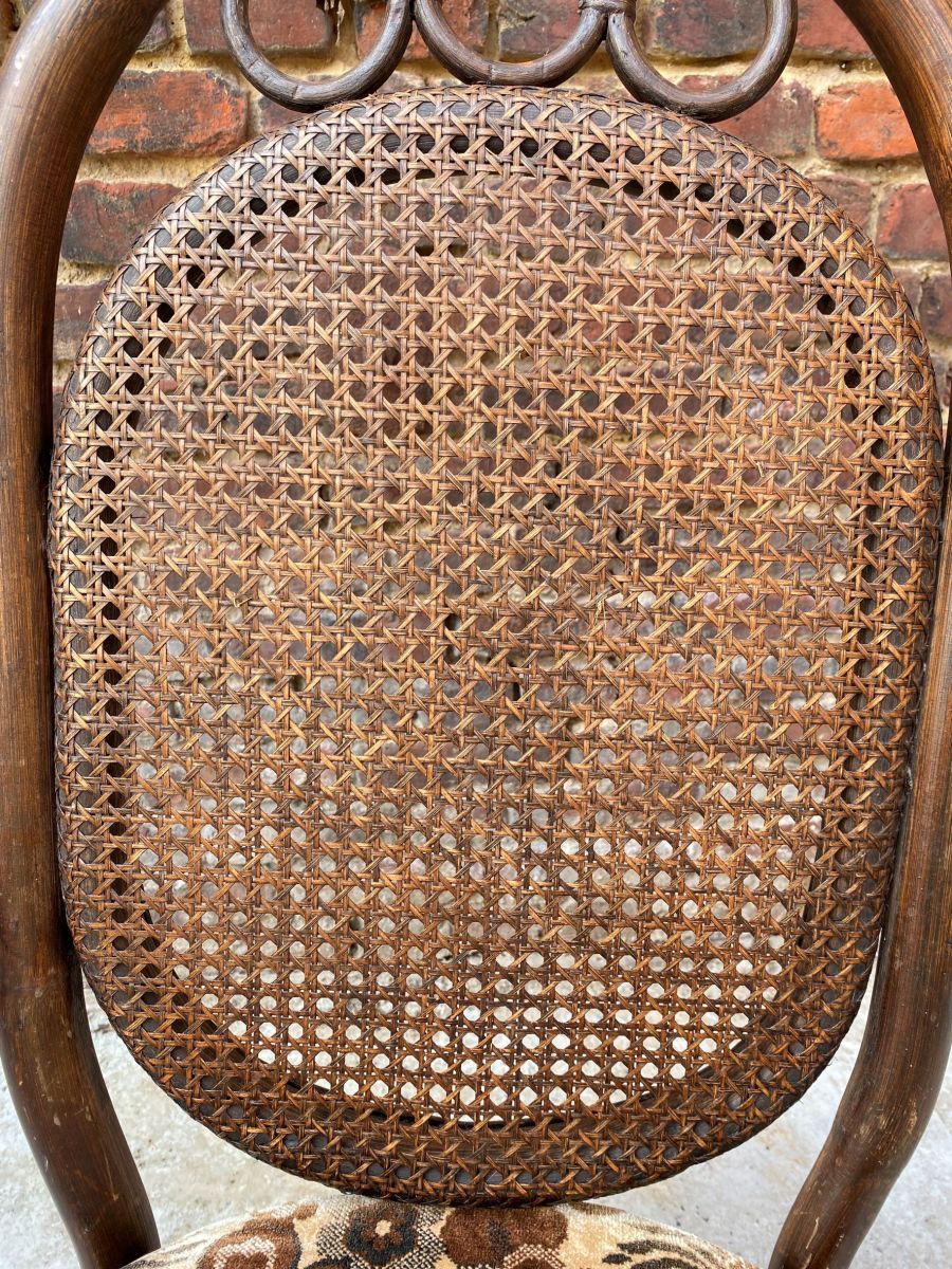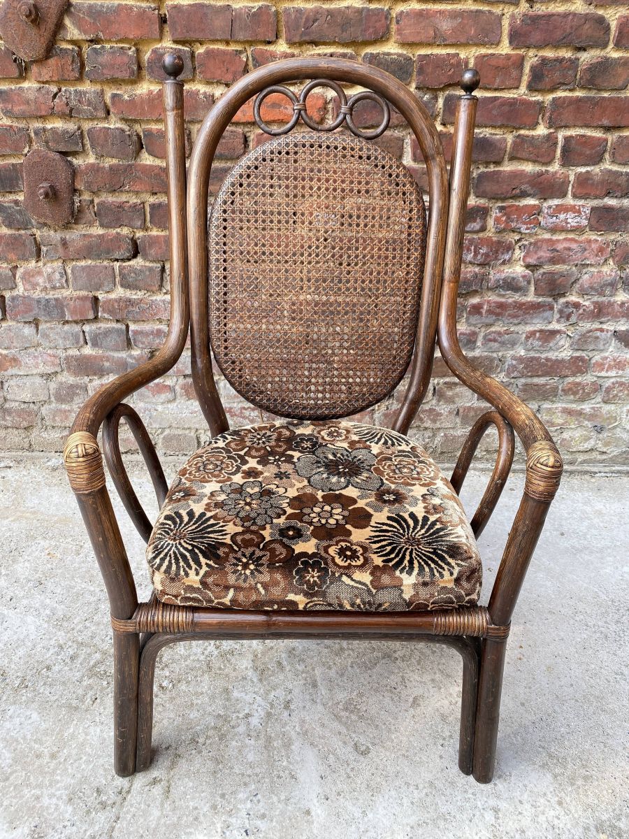 Fauteuil Bambou et cannage. Bel état, et belle patine! Coussin d'origine en velours fleuri, tons beige et marron typique années 70'. Forme peu courante, originale et élégante. Top lors d'une cérémonie de mariage! Dimensions : P 58 cm, L 65 cm, H 99 cm. Hauteur d'assise 41 cm, Largeur d'assise 51 cm, profondeur d'assise 46 cm. M324