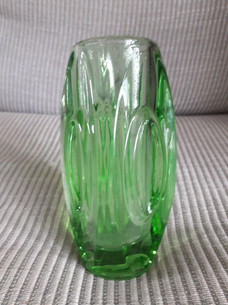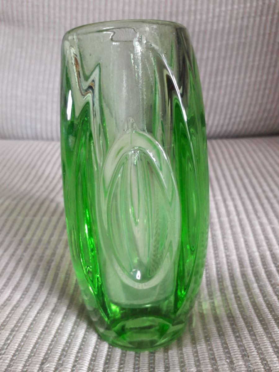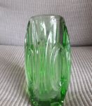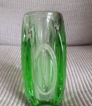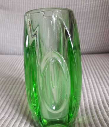 Vase vintage en verre épais travaillé et très original. Le vase est vert avec des formes circulaires sur les faces et les bords biseautés.