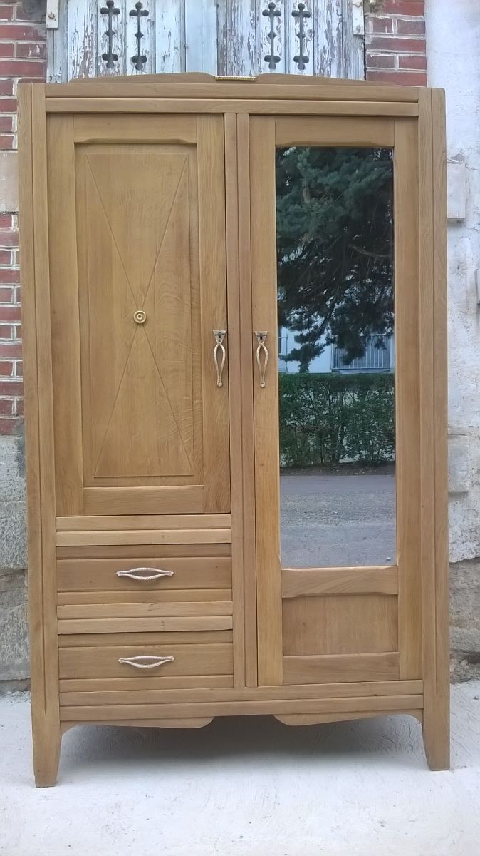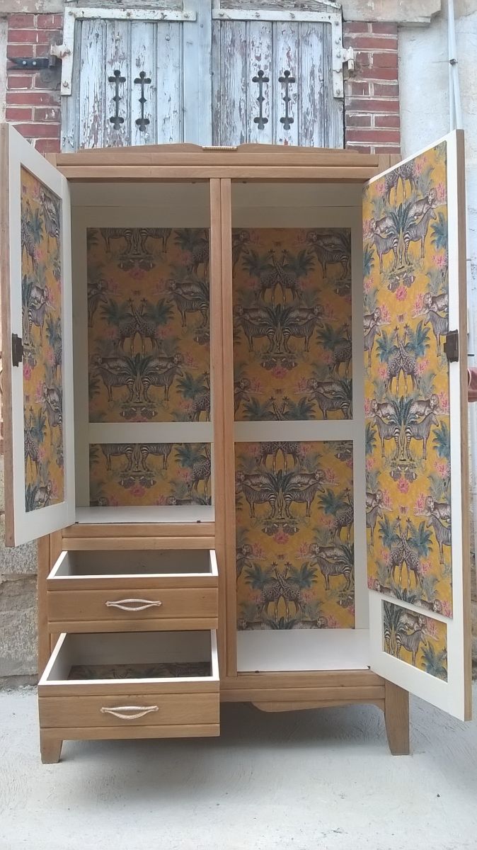 Armoire parisienne d’hôtel année 50 en chêne. Elle a été poncer et laisser en bois brut. L intérieur de l armoire et tiroir a été peint de couleur macaron et tapissé d un papier d animaux de la savane. Les poignées doré sons d origine est on été nettoyer, les clés des porte sons identique avec leur serrure d origine. A noté sur la petite porte en chêne petite fissure qui a été restauré, reste très solide et peu voyant. Coté miroir dans l ensemble bonne état malgré quelques rayures sur les coté. L armoire est stable et solide. A noté l armoire étant des année 50, elle présente quelques cicatrices. Hauteur totale 182 cm. Largeur 110 cm. Profondeur 50 cm.