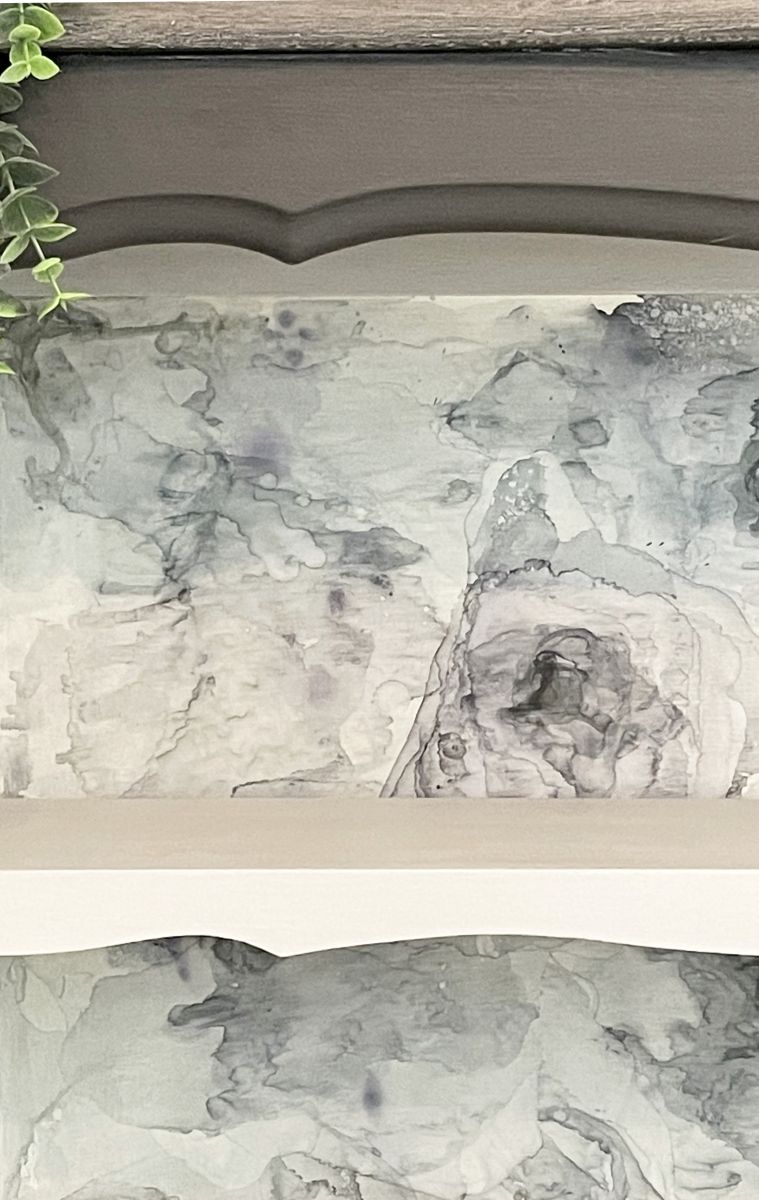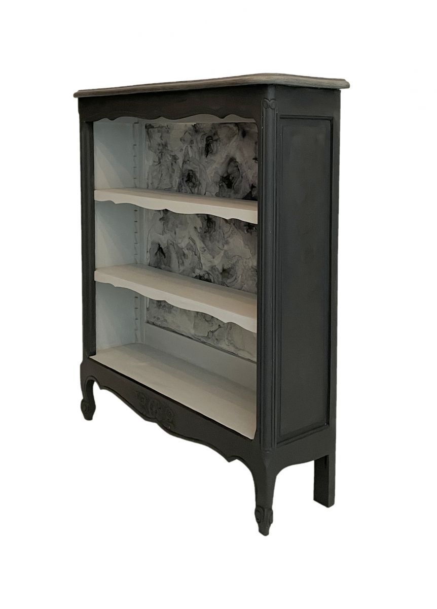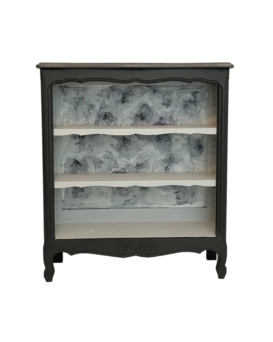 Craquelure faite à la main sur le dessus et finie en peinture à la craie graphite et cire noire.