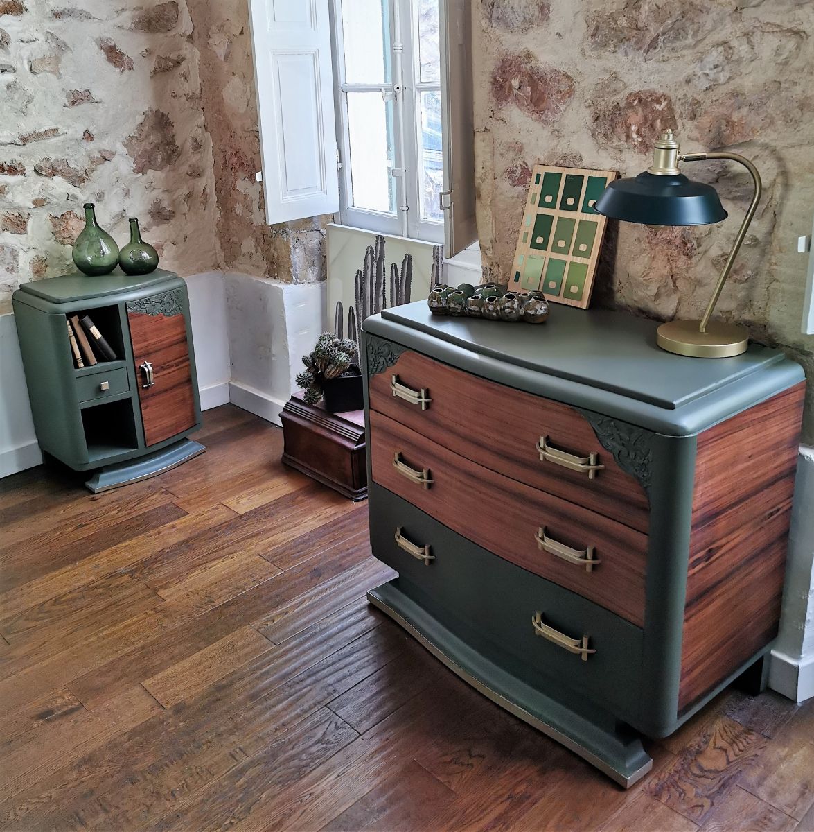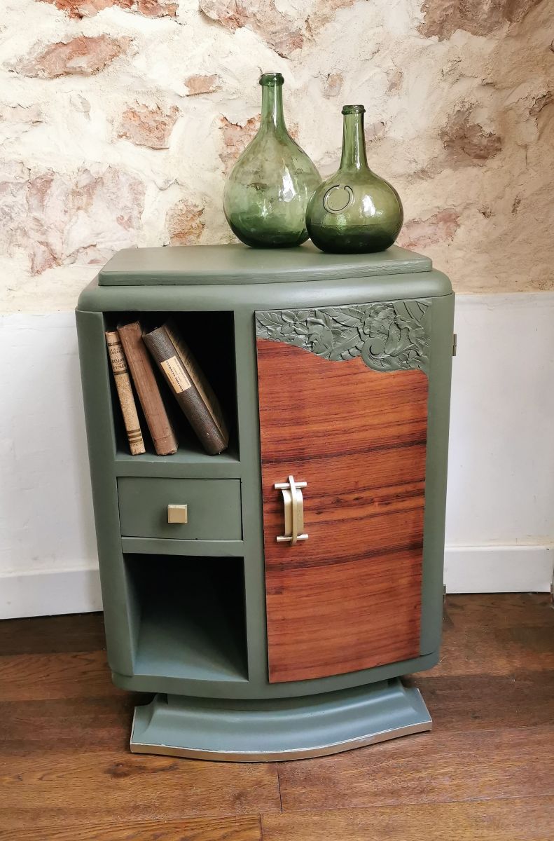 Upcycling d’un chevet ancien de style art déco avec ses courbes et ses fleurs sculptées.
