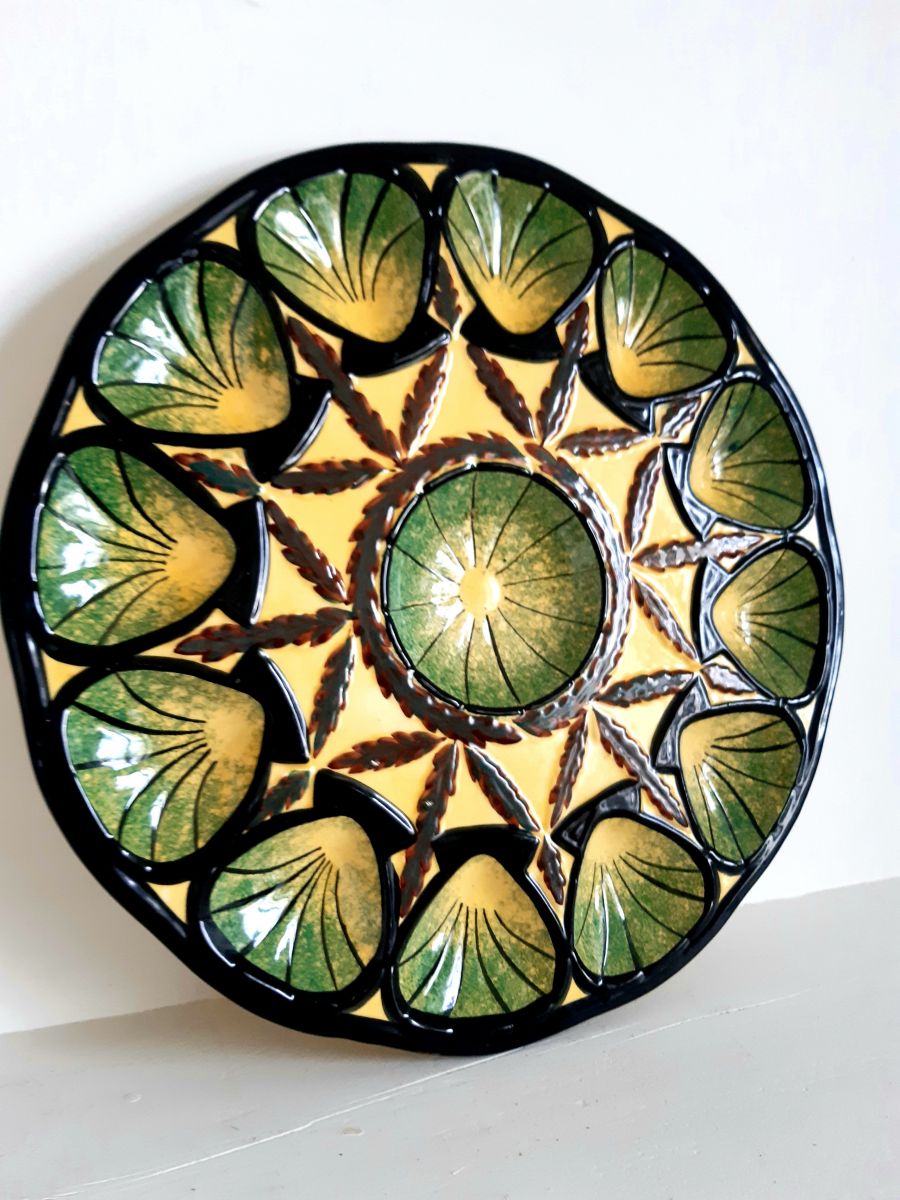Grand plat rond à coquillages, décor émaillé polychrome aux tons très vifs.