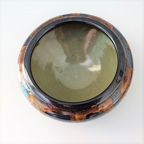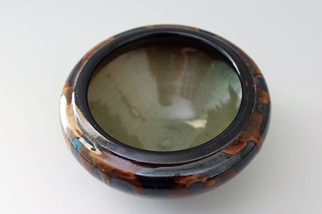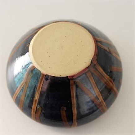 Joli vide-poche artisanal en grès émaillé. Sa couleur principale passe du bleu cobalt au bleu nuit selon la luminosité et il est agrémenté de coulures de couleur caramel qui font son originalité. En parfait état, comme neuf, il pourra accueillir le contenu de vos poches ou encore des accessoires de bureau tels que des trombones ou élastiques, à moins que vous préfériez l’utiliser pour faire un pot-pourri.