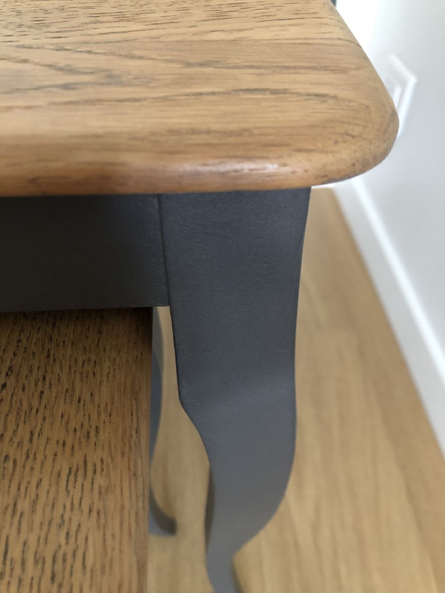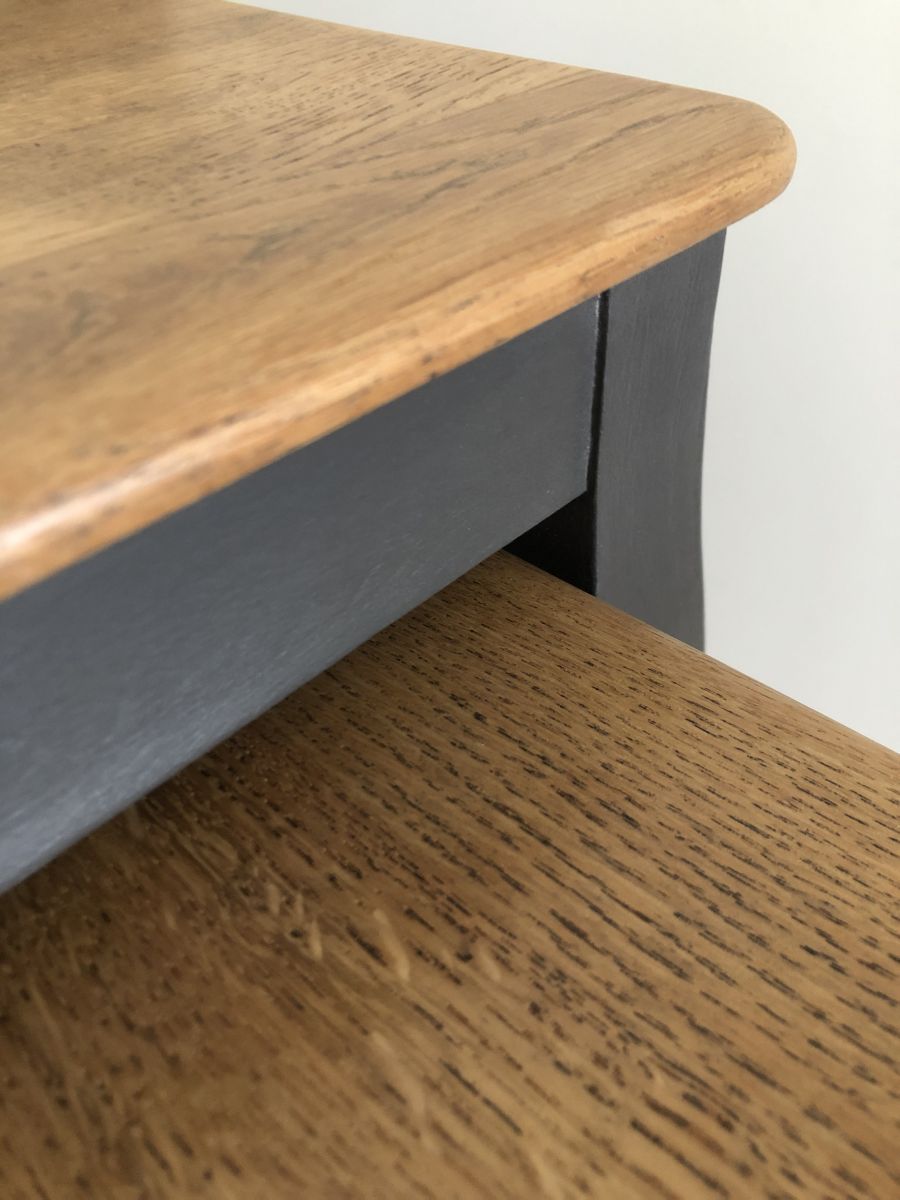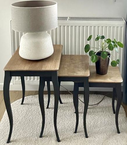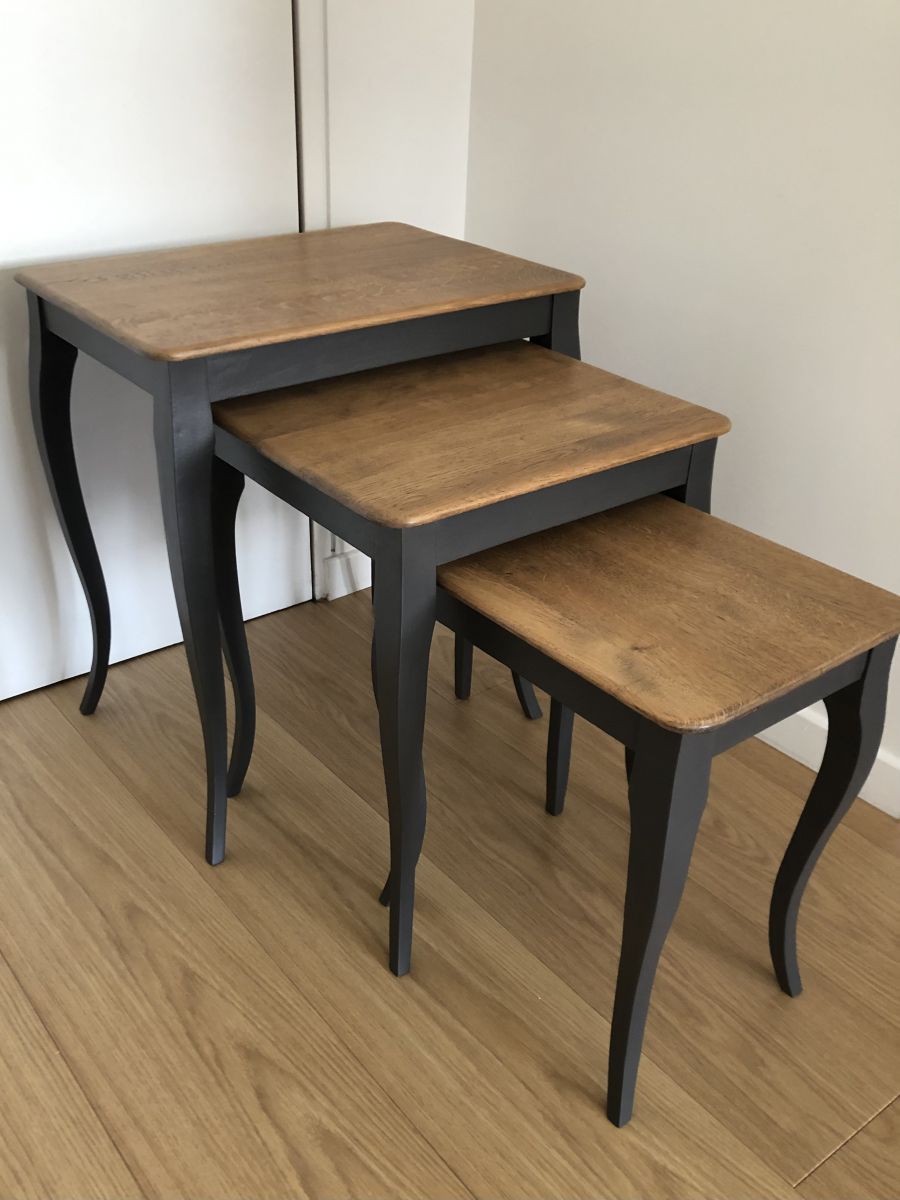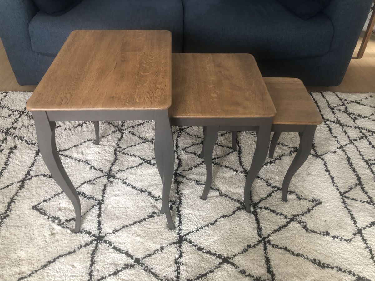 Jolies petites tables gigognes relookées. Couleur gris cendre (Liberon) et vernis de protection.