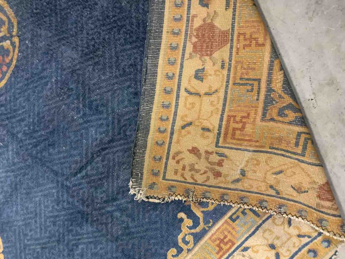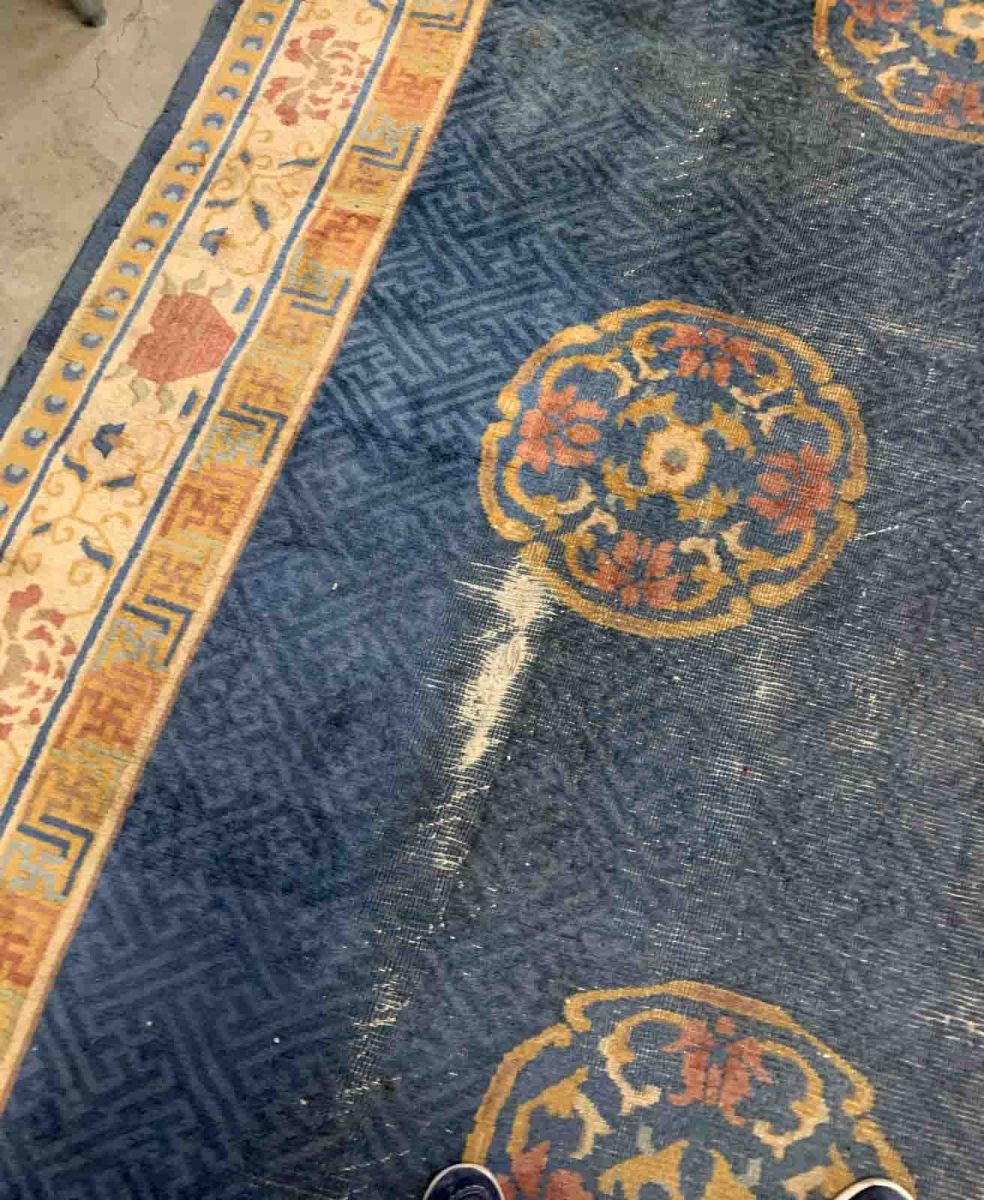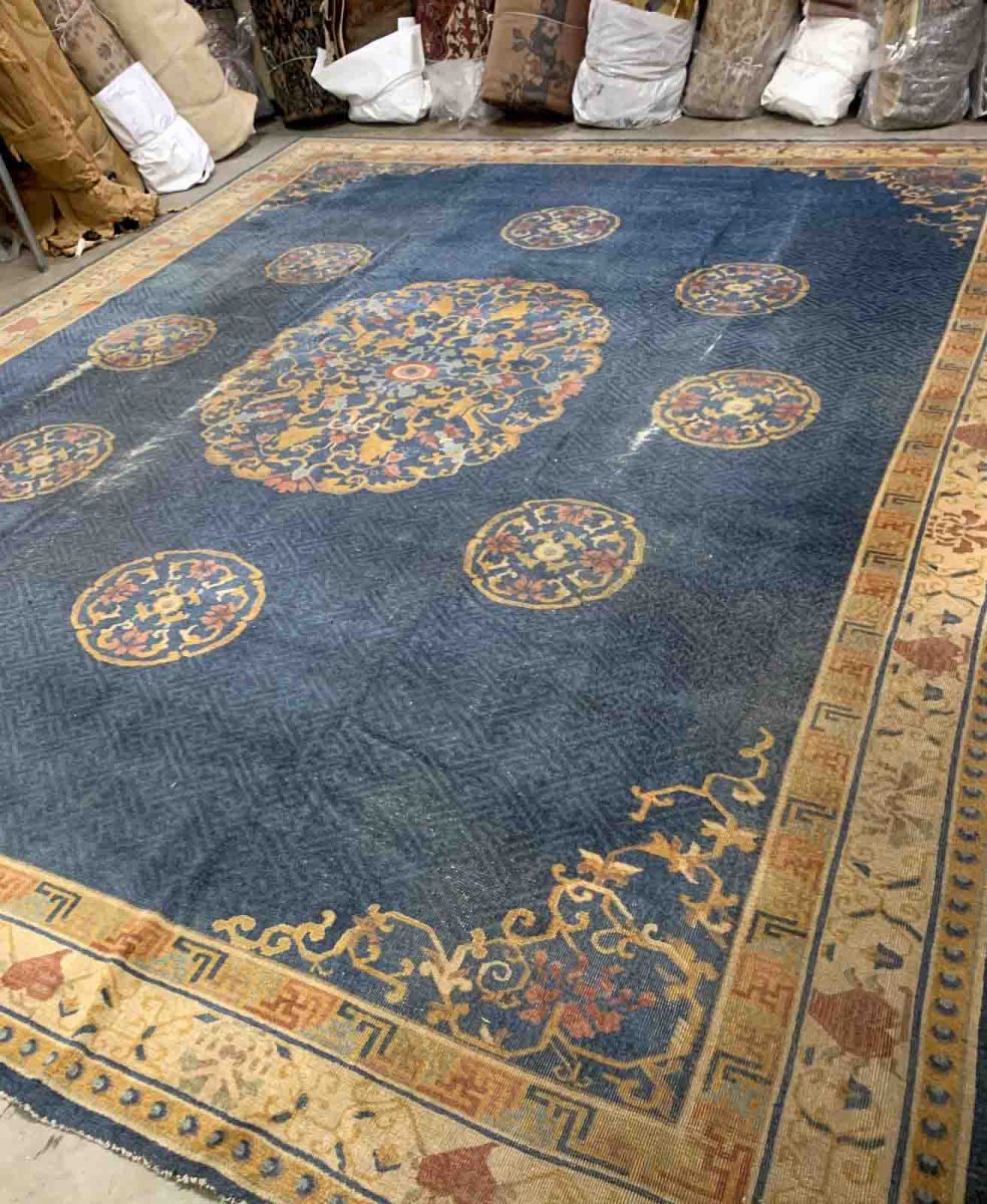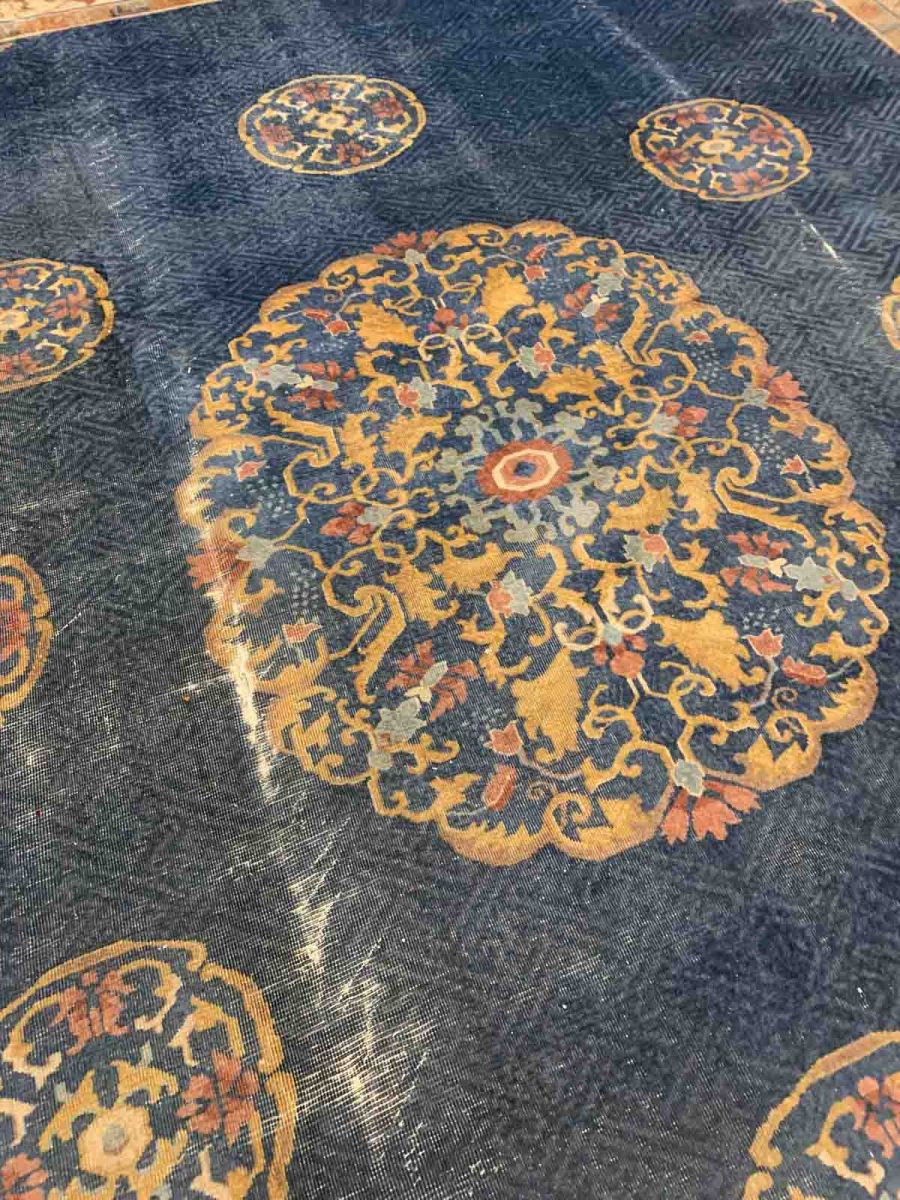 Handmade antique Peking Chinese rug in blue and beige colors. The rug is from the beginning of 20th century in original condition, it has some distressed areas.
