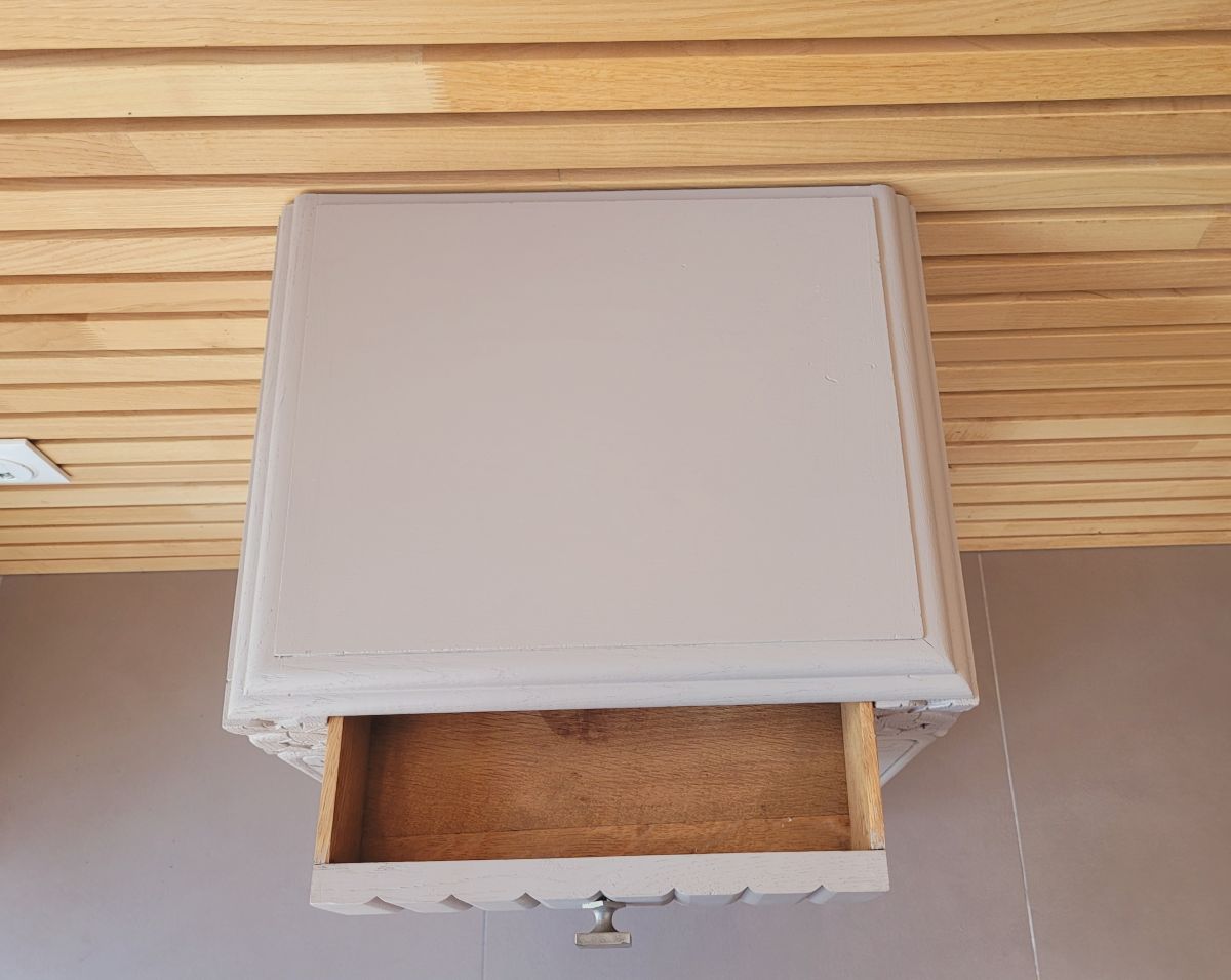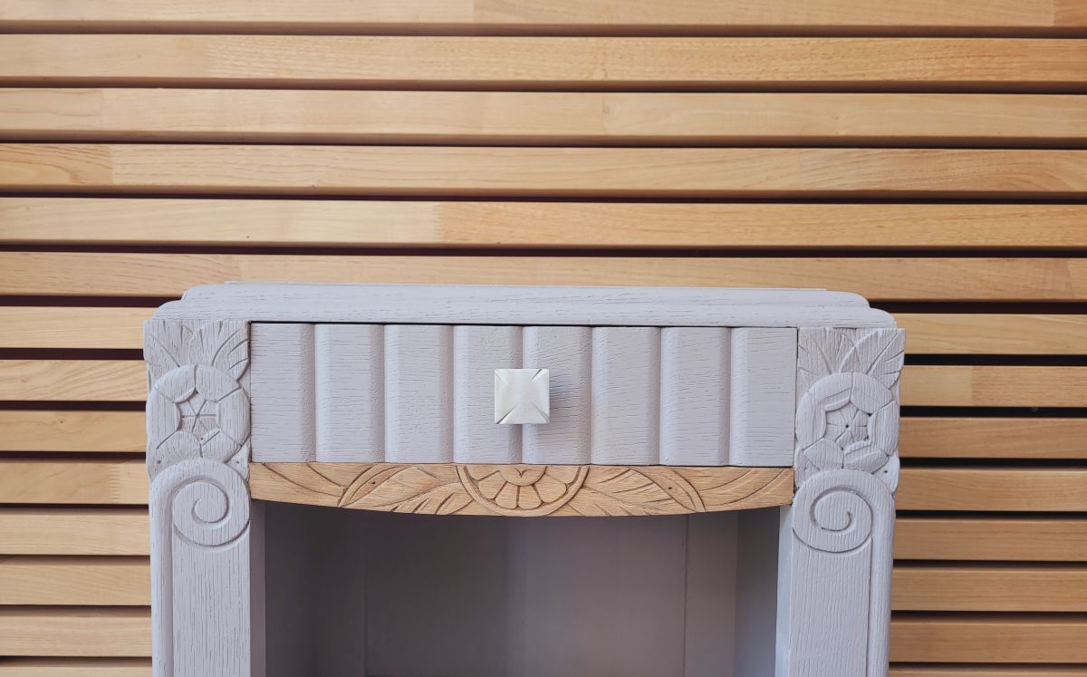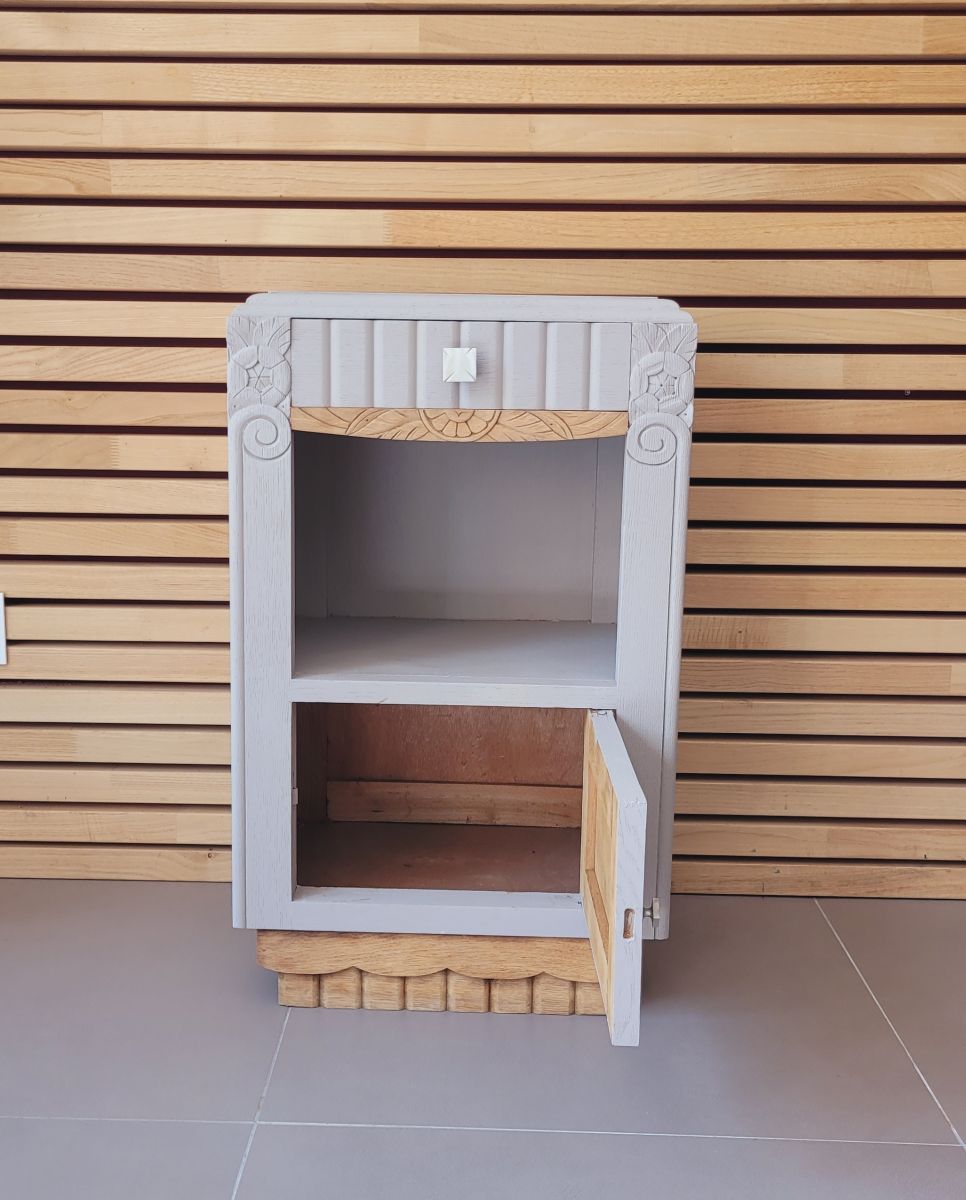 Meuble d'appoint en chêne massif style art déco. Entièrement restauré, il a été nettoyé, poncé repeint en brun Eiffel (mate légèrement satinée). Le meuble est sain, stable et propre. Les boutons sont d'origine. Le tiroir coulisse parfaitement, la porte s'ouvre et se referme bien. Malgré tout le soin apporté, quelques légères traces du temps subsistent, mais rien de rédhibitoire.
