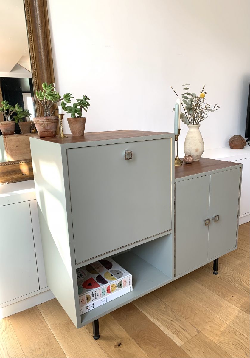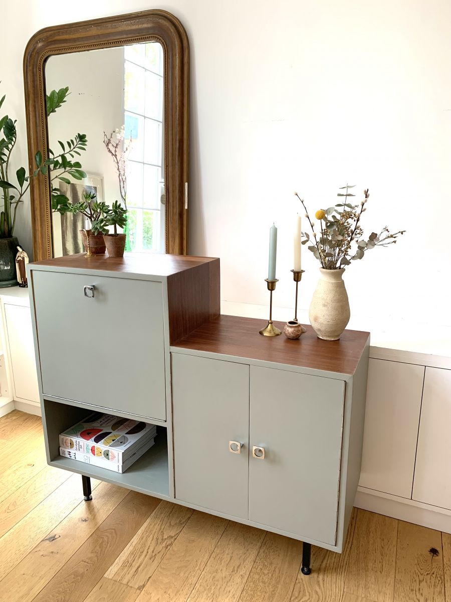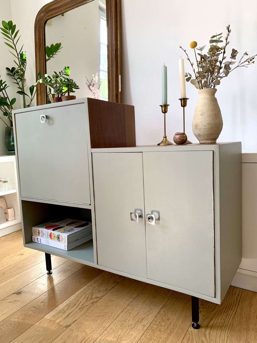 Elégant buffet asymétrique perché sur de jolis pieds en métal.